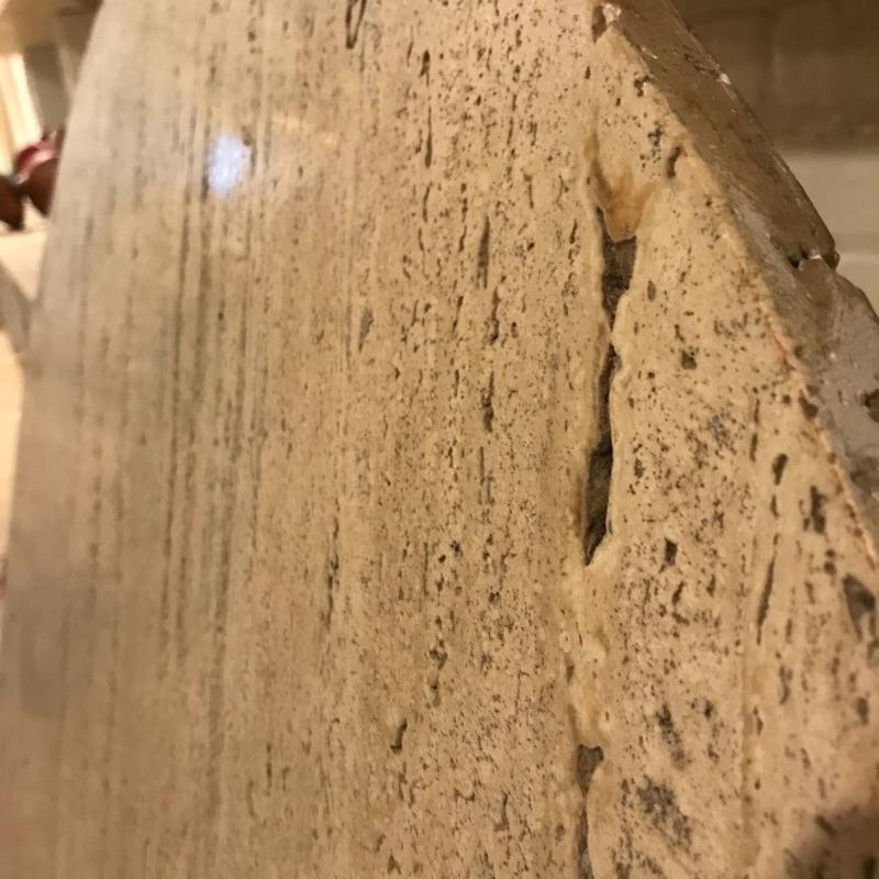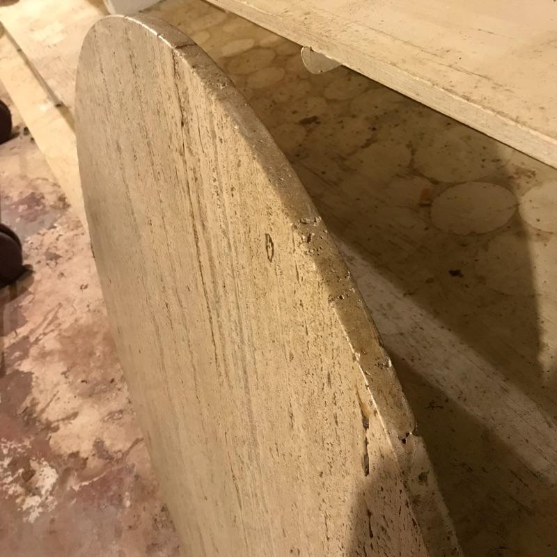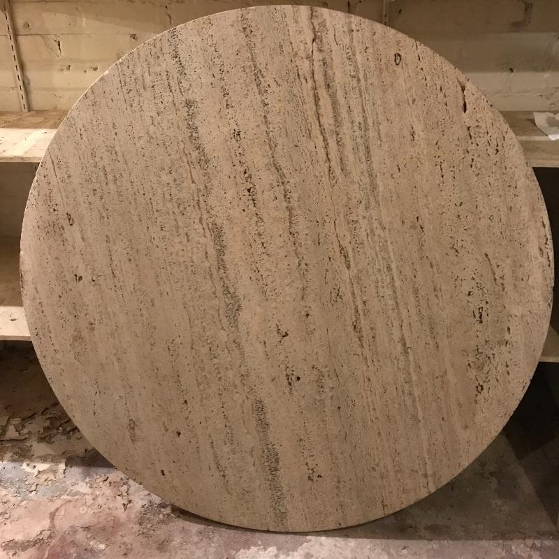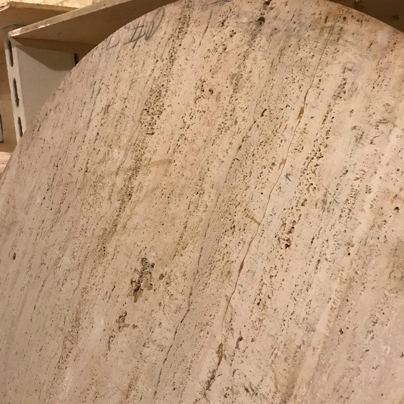 This large gorgeous marble table top has white/off-white and gray hues. It has a lot of character and charm with a 45” diameter. The backside appears to have an unsealed texture. With its one inch thickness it is very heavy and would need to be carried up one flight of stairs, please bring help to load.