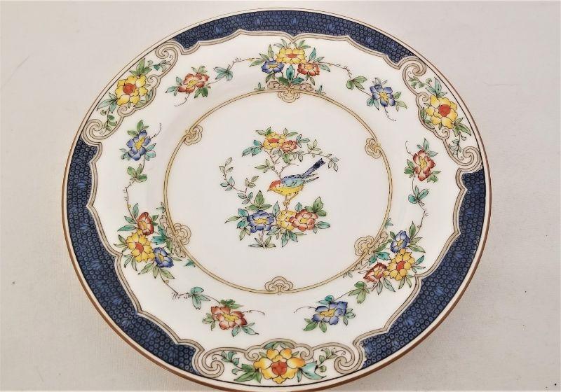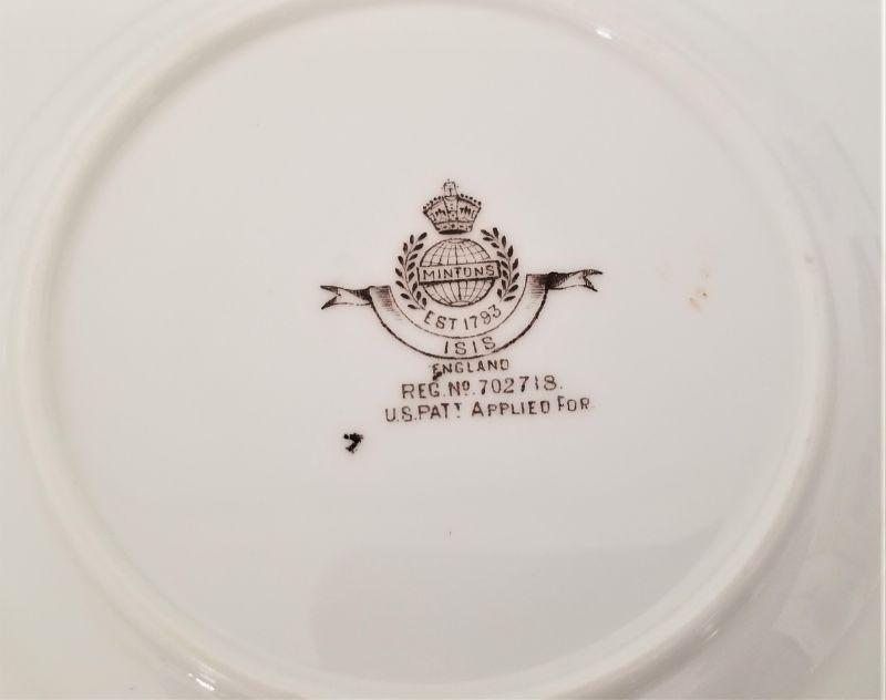 Minton china - 7 cream soups, 4 salad plates, 5 underplates, 5 tea cups, 10 saucers for the tea cups. Good condition. Registration # is 702718, which dates these dishes to 1924.
