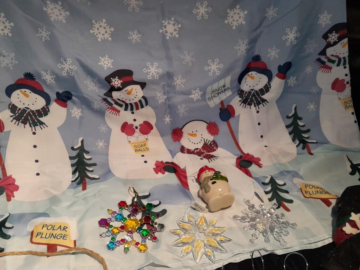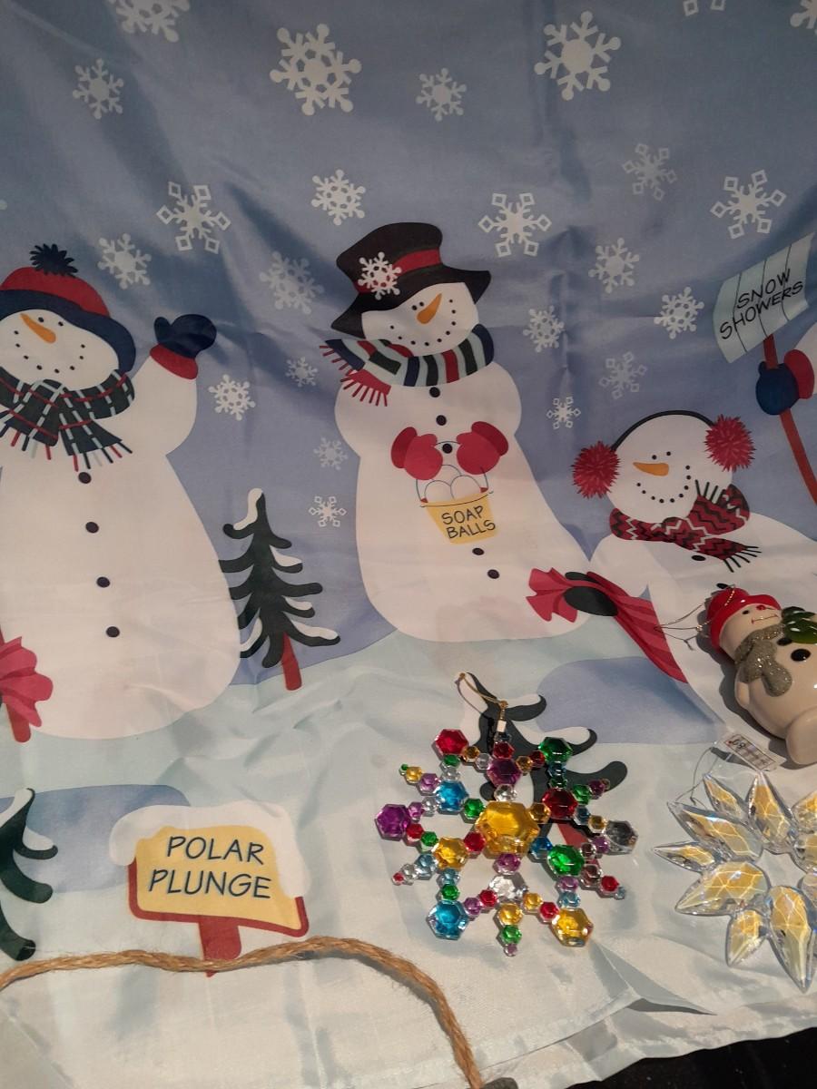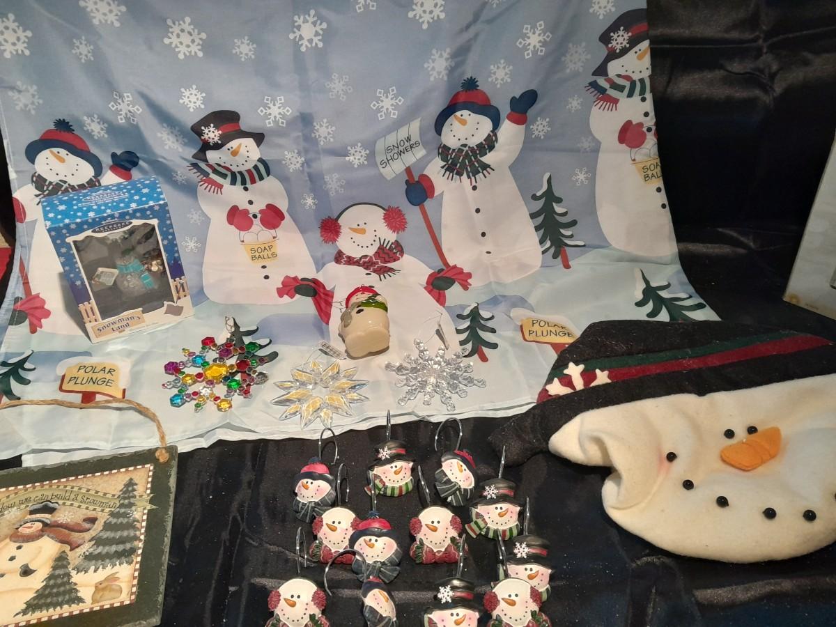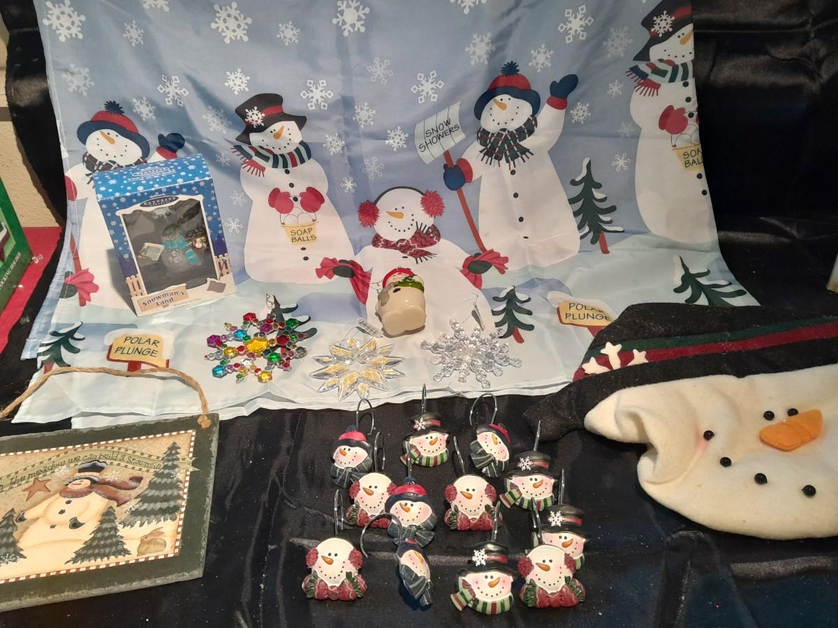 SHOWER CURTAIN, STOOL LID COVER, SHOWER CURTAIN HOOKS, SLATE SIGN, AND OTHER SNOWMAN AND SNOWFLAKE THEMED ITEMS.