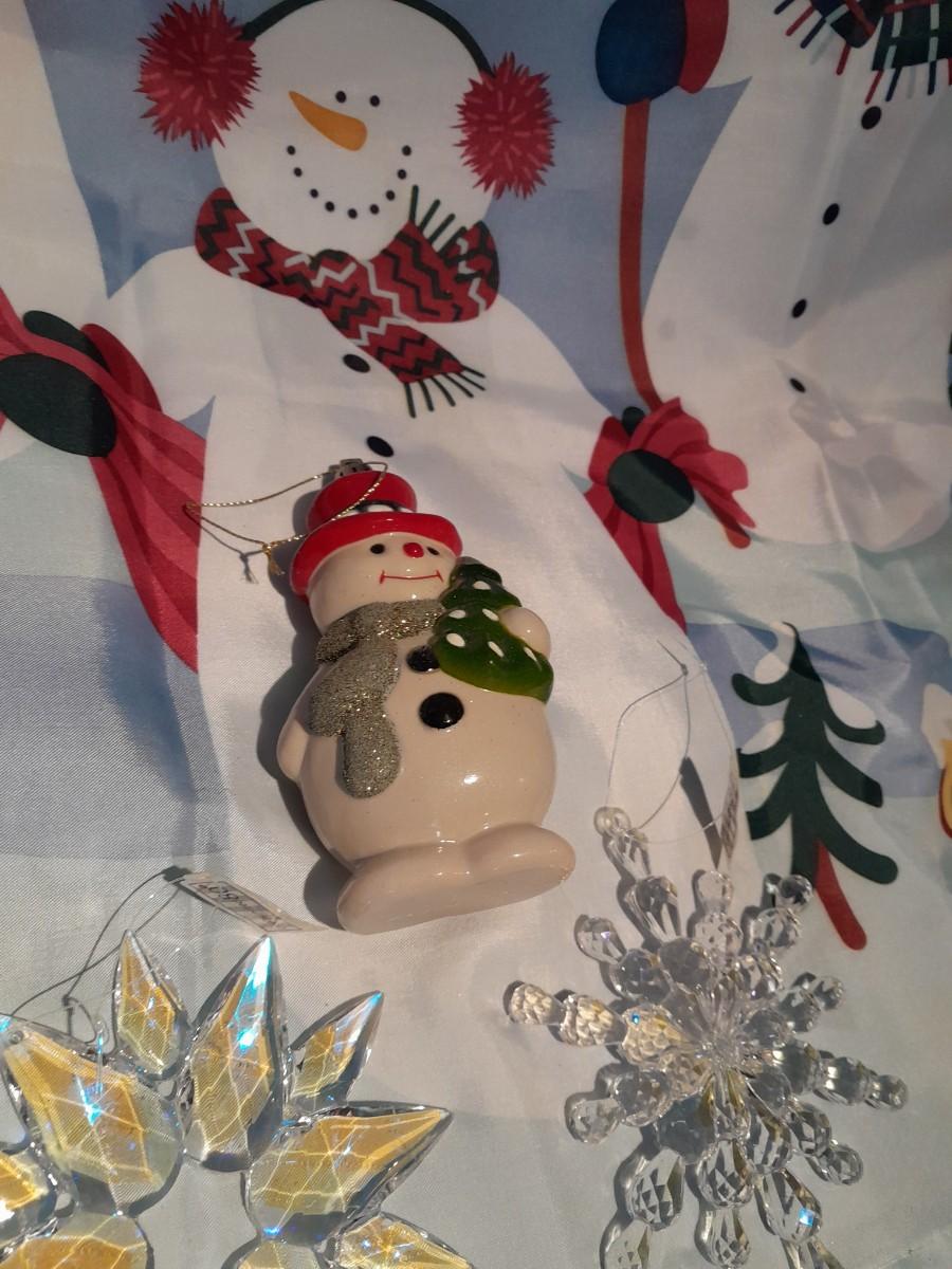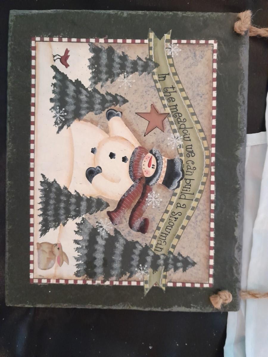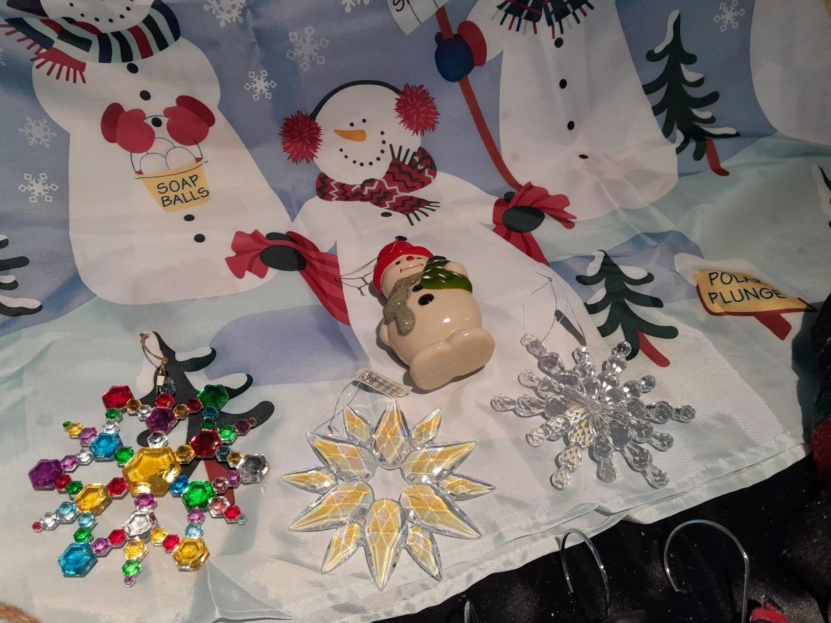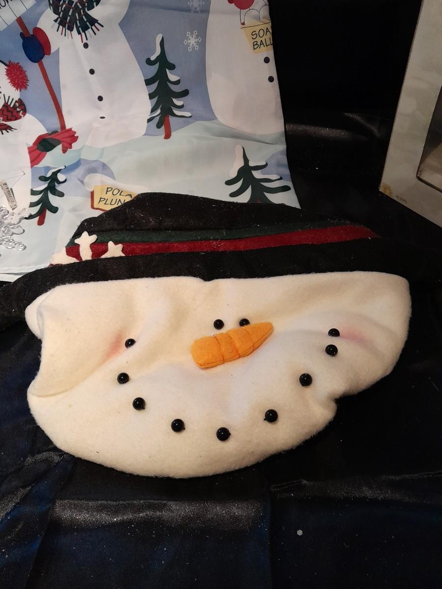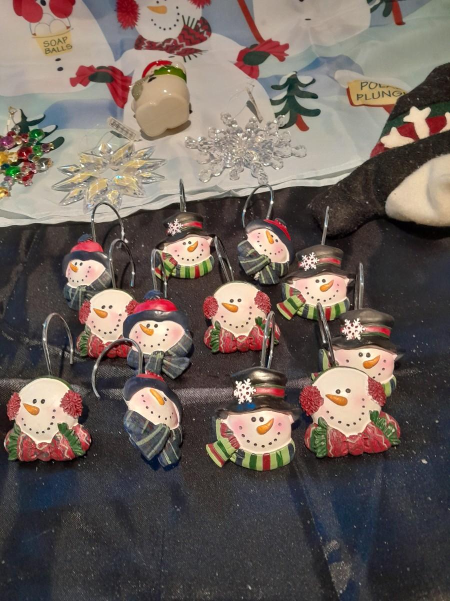SHOWER CURTAIN, STOOL LID COVER, SHOWER CURTAIN HOOKS, SLATE SIGN, AND OTHER SNOWMAN AND SNOWFLAKE THEMED ITEMS.