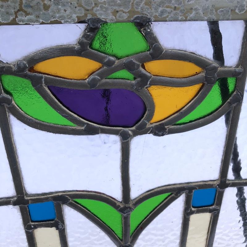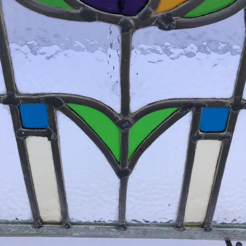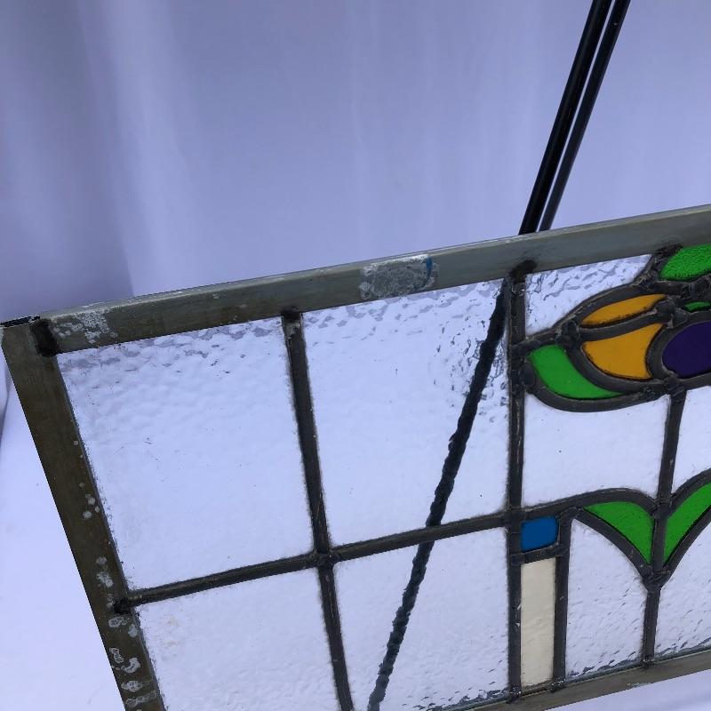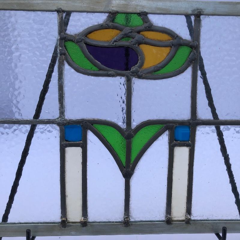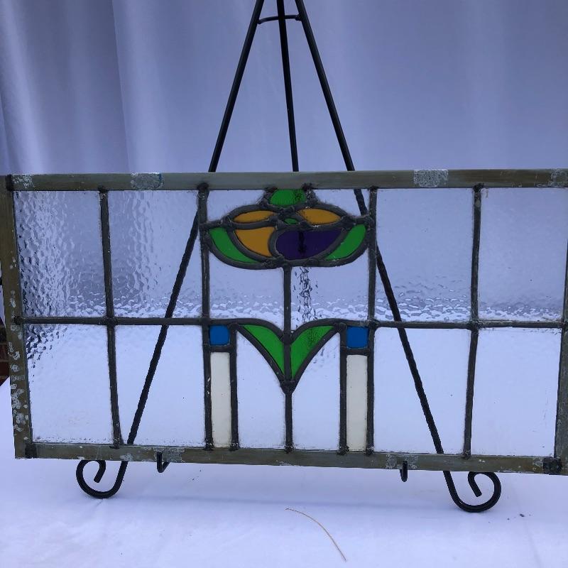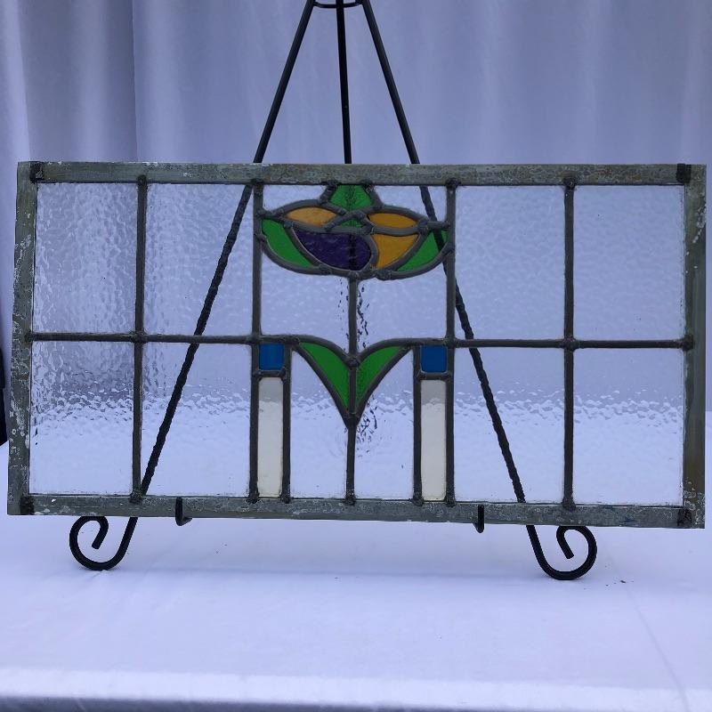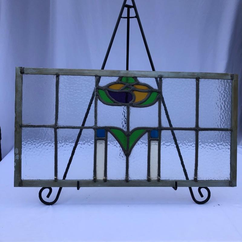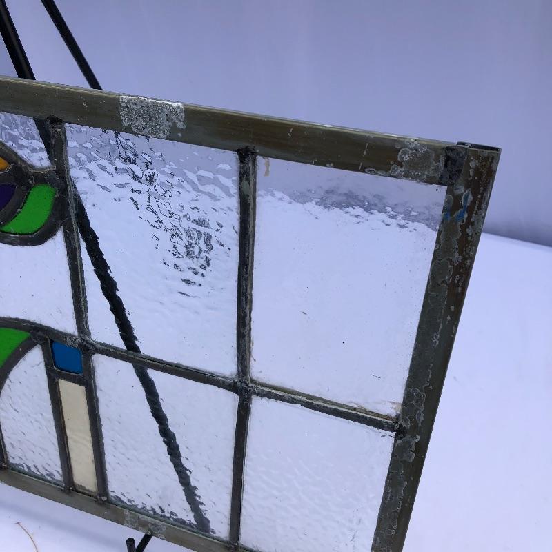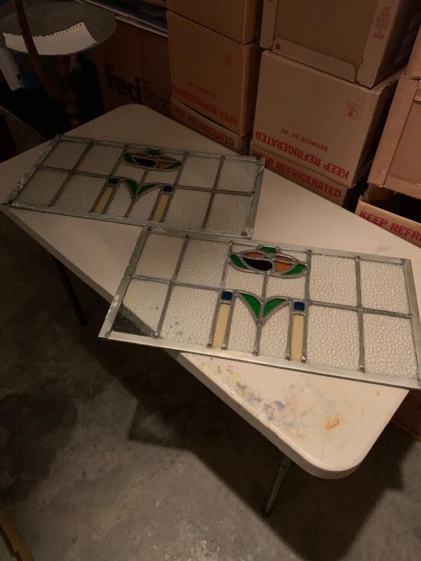 This pair of vintage stained and leaded glass rectangles with metal framing and bold coloring needs some cleaning up and detailing (see photos), but that does not take away from their beauty and charm.