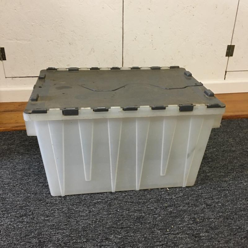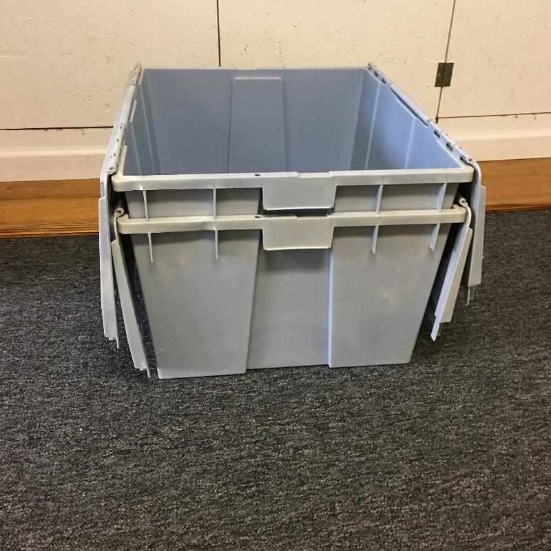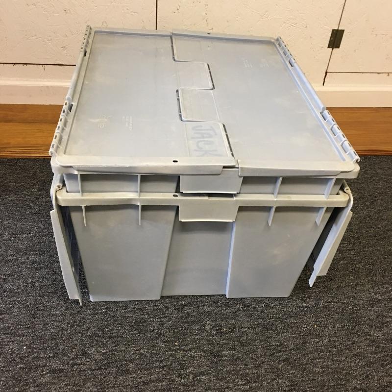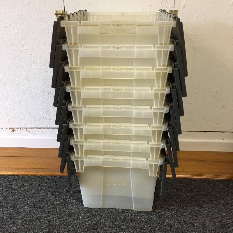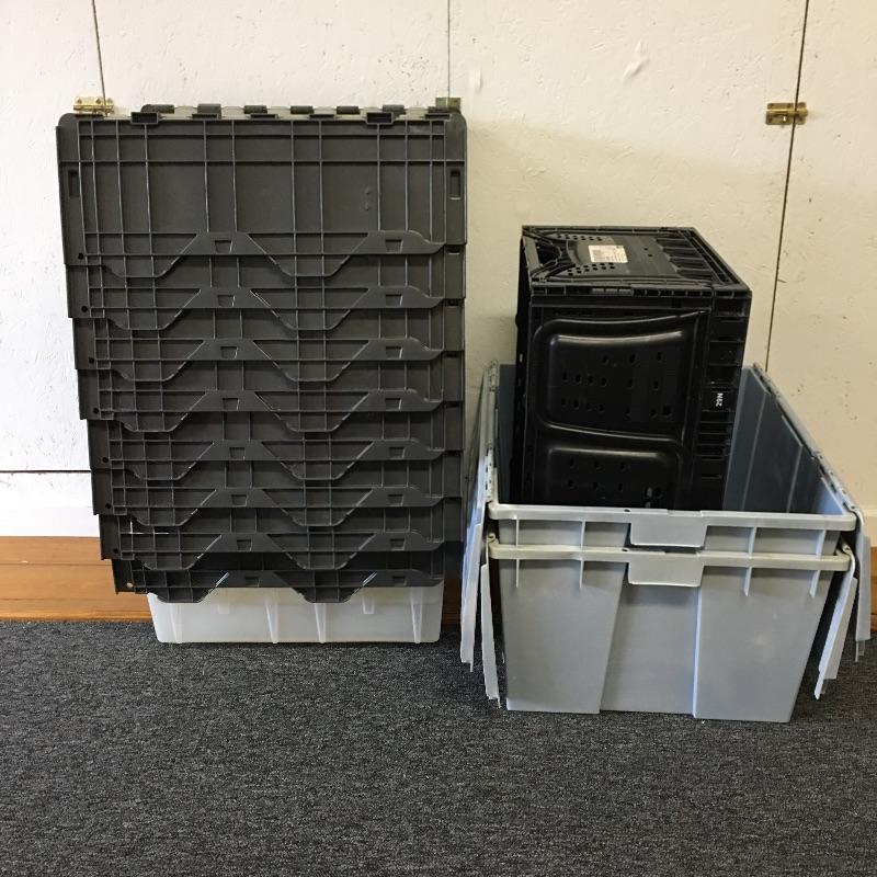 Storage bins and collapsible bin. Lot includes eight clear bins with attached gray tops, two blue bins with attached tops and a collapsible bin. A great find for all your storage needs. Blue bins measure 19.5” x 23.5” x 12”. Bins are on second floor.