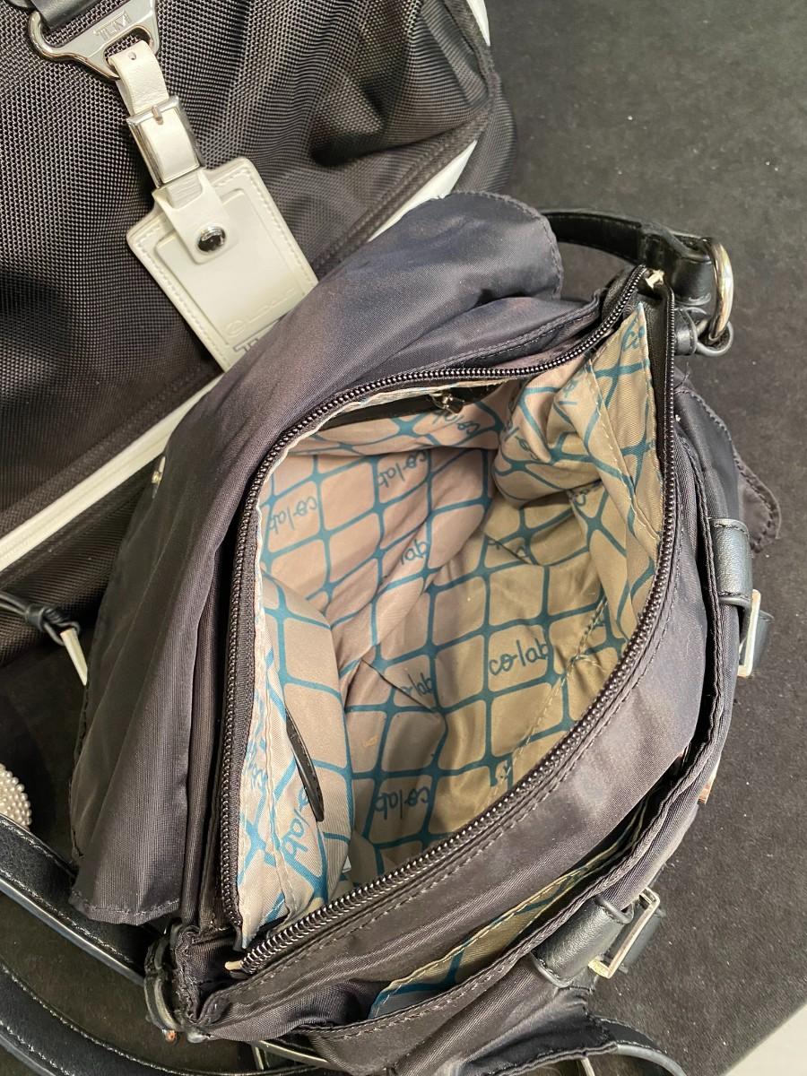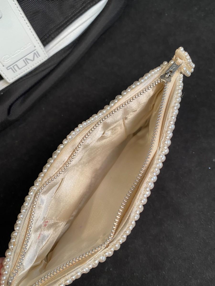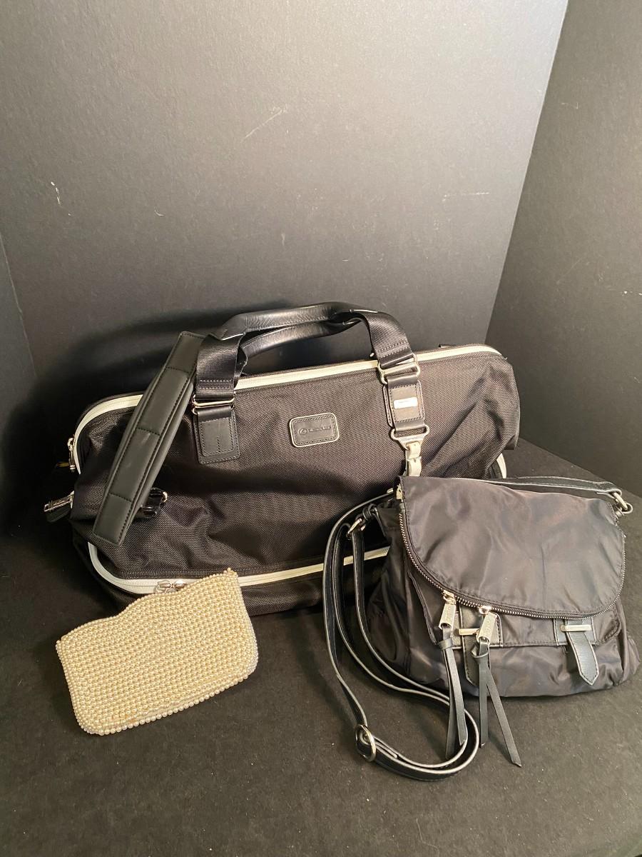Tumi "Lexus" travel tote, co-lab travel purse, and pearl evening bag.