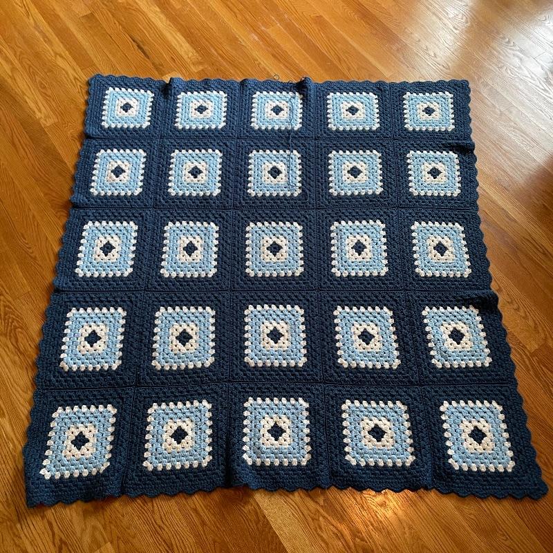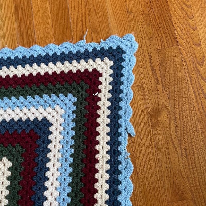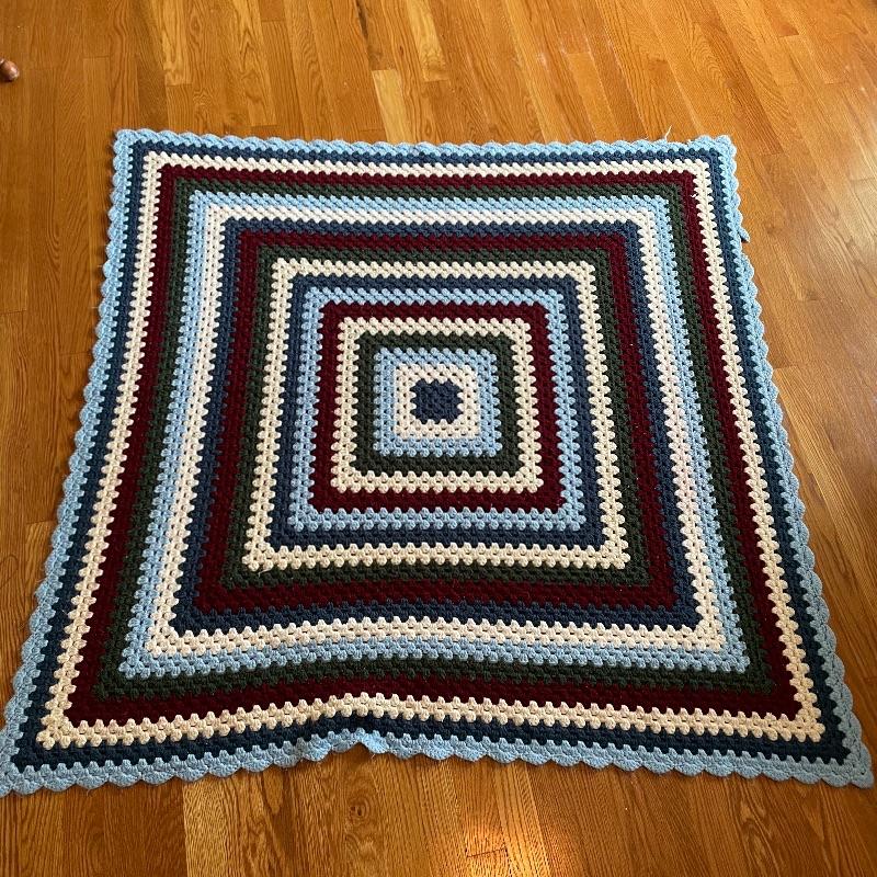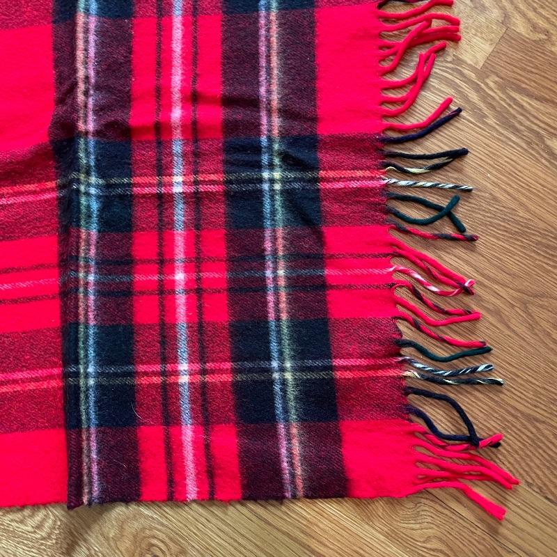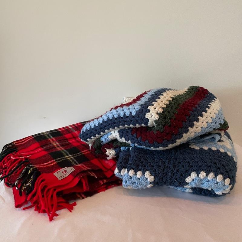 Three nice accent blankets for warmth and decor. The square Afghan with maroon and forest green accents is stunning and measures approximately 51”sq. The other blue and white Afghan is about 52” x 55”. Lastly, add a nice red tartan by Troy Robe, this throw is about 53”sq. Shipping available