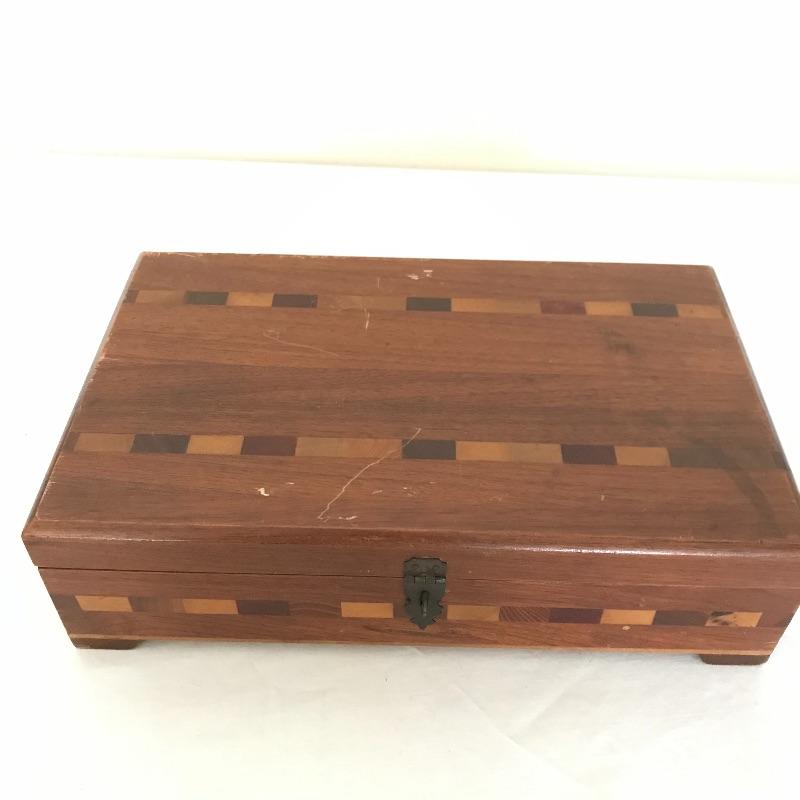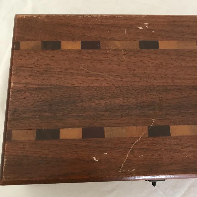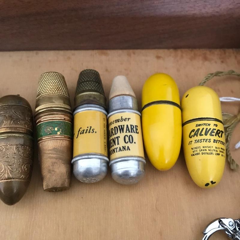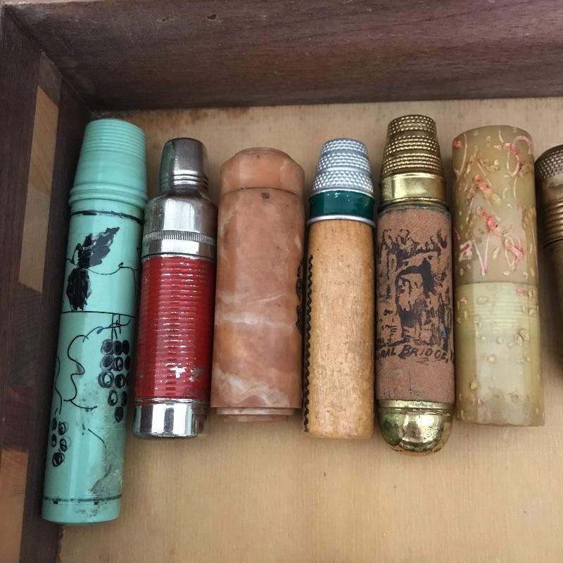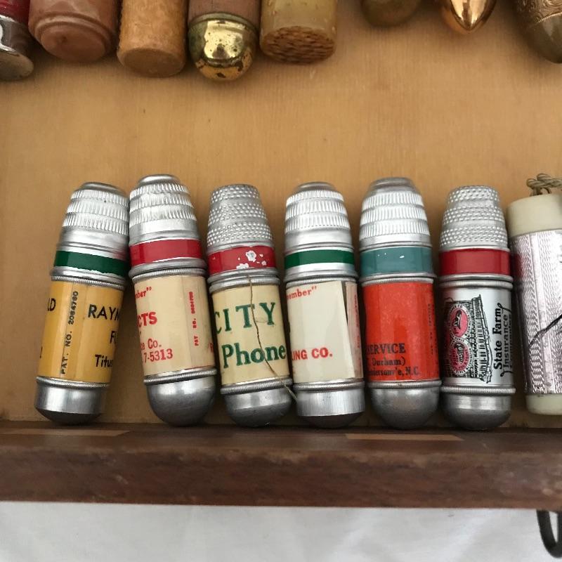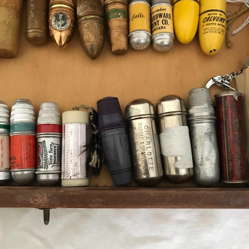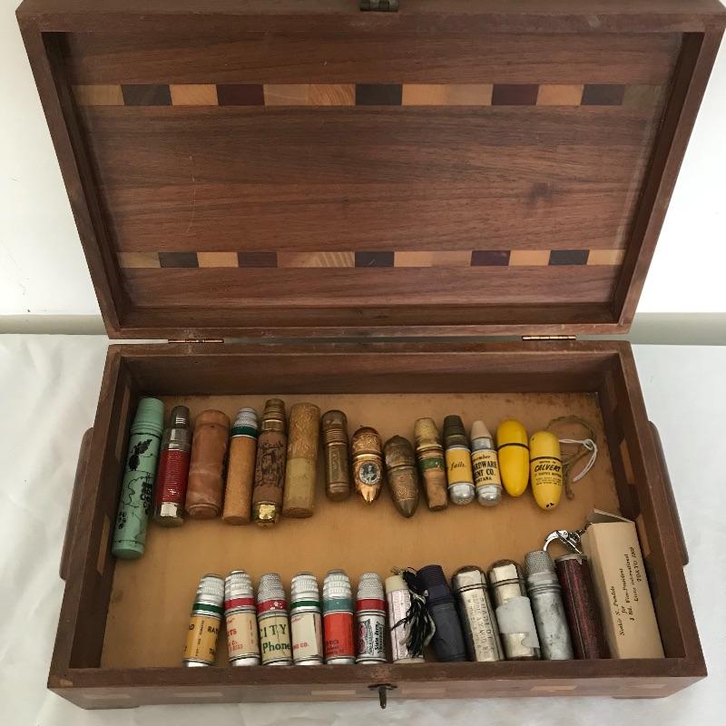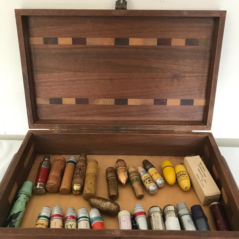More than twenty-five vintage thimble sewing kits. Each one unique, most have vintage advertising, some are equal size to the average lipstick tube. Used and unused throughout. The collection comes with a wooden box for storage. Box measures approximately 12.25” x 7.5” x 3.5”. Some blemishes on the box are noted in photos. Shipping available.