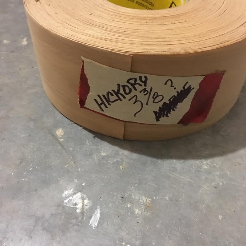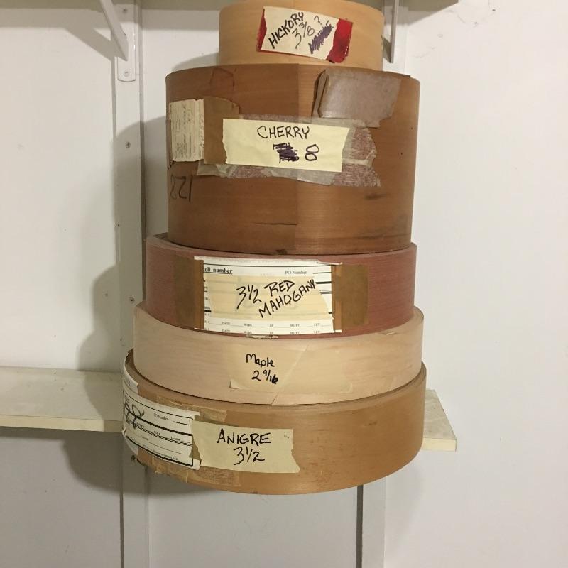 Five rolls of wood veneer including Cherry, Hickory, Red Mahogany, Maple and Anigre. See pictures for sizes and amount.