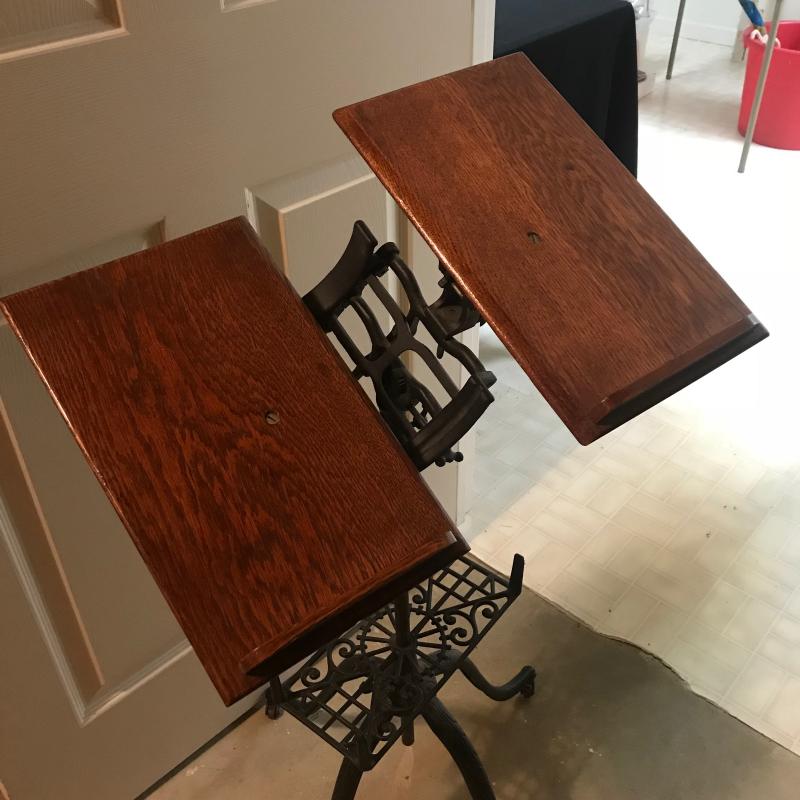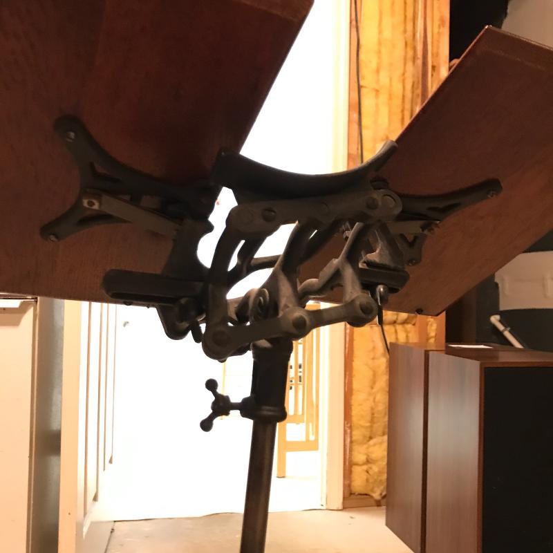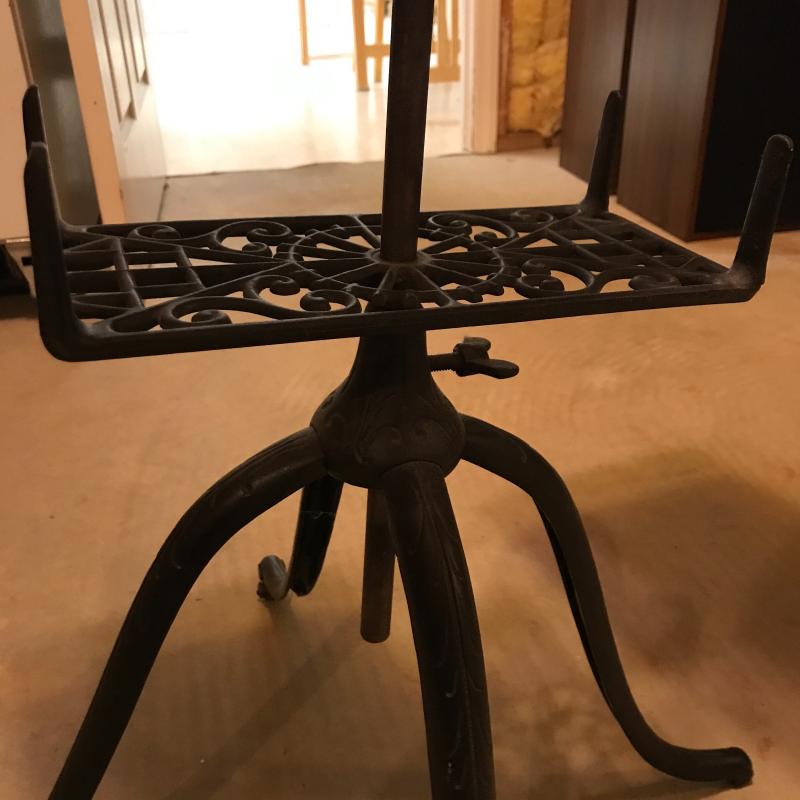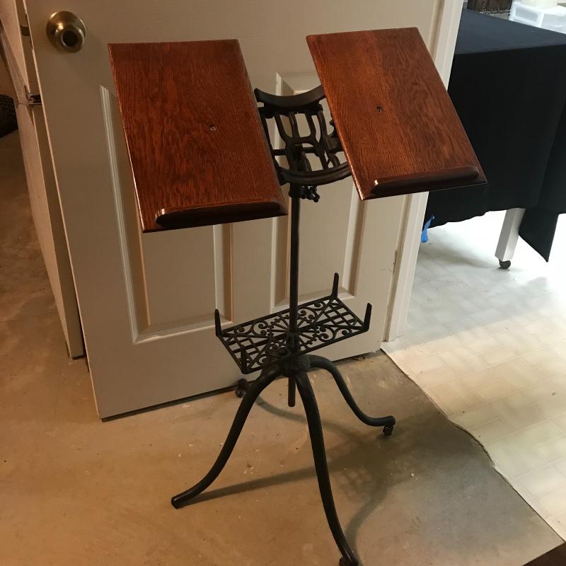 Adjustable wrought iron and wood stand to display you Music/Bible/Dictionary . On caster wheels. Measures 17” x17” at base and wood surface when flat measures 20.5”. Height is adjustable. Local pick up only.