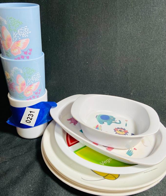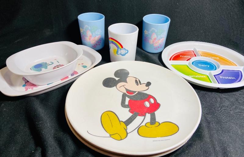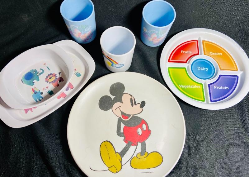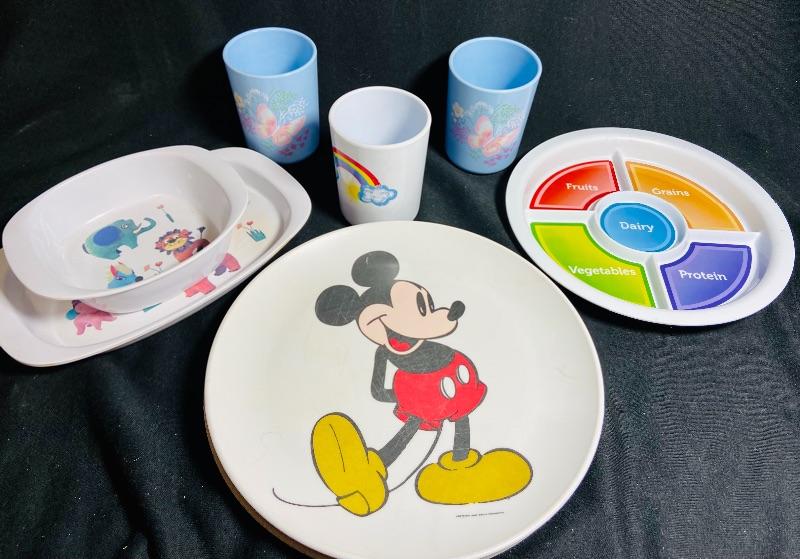 Three vintage Mickey Mouse children plates, Noritake Melamine Ware children’s animal print plate and bowl set, three vintage children’s plastic drinking cups.MHW Please see all pictures for content of the lot, condition of the lot, and measurements if taken. Pictures are the best representation of the items listed and items are untested unless indicated in description. Thank you for looking and have fun bidding!
