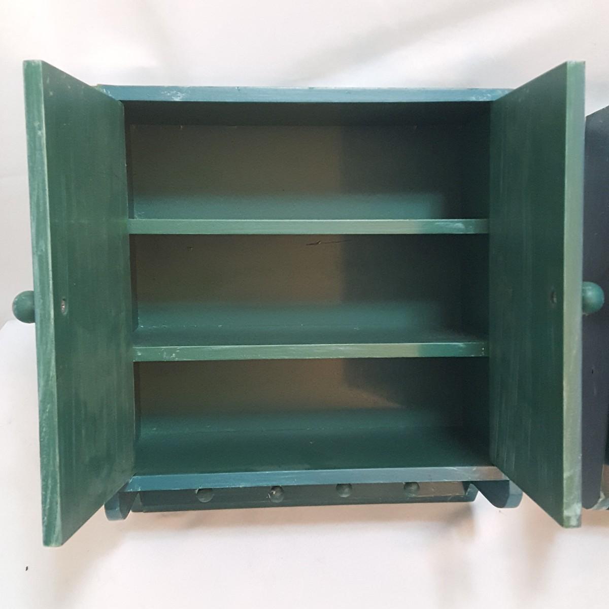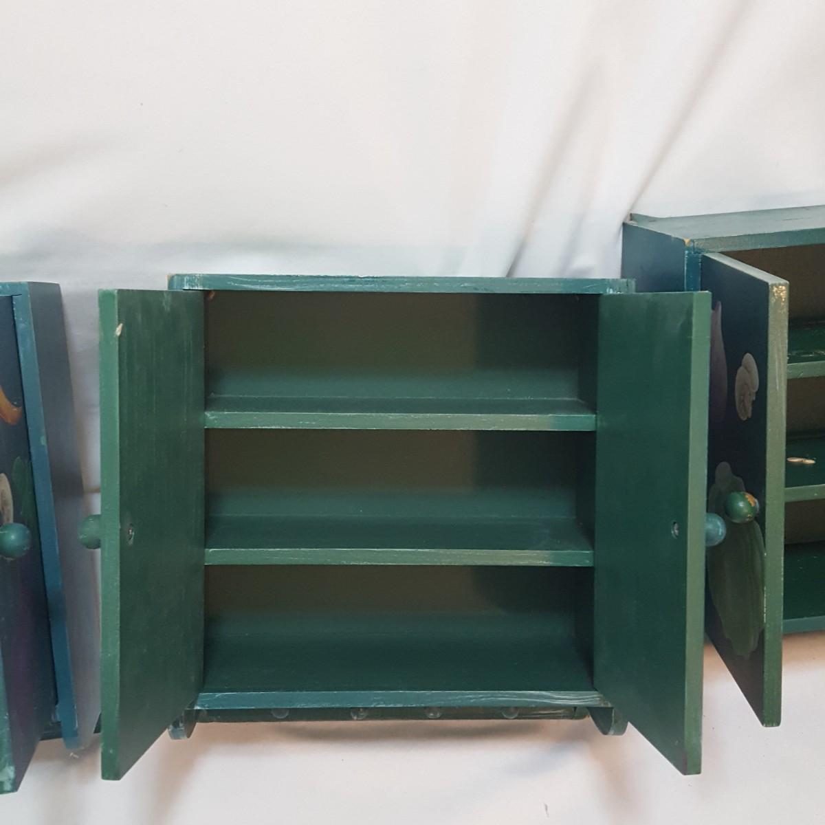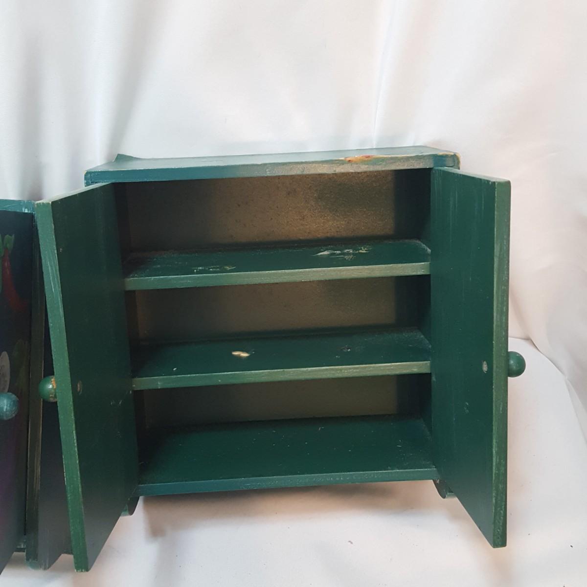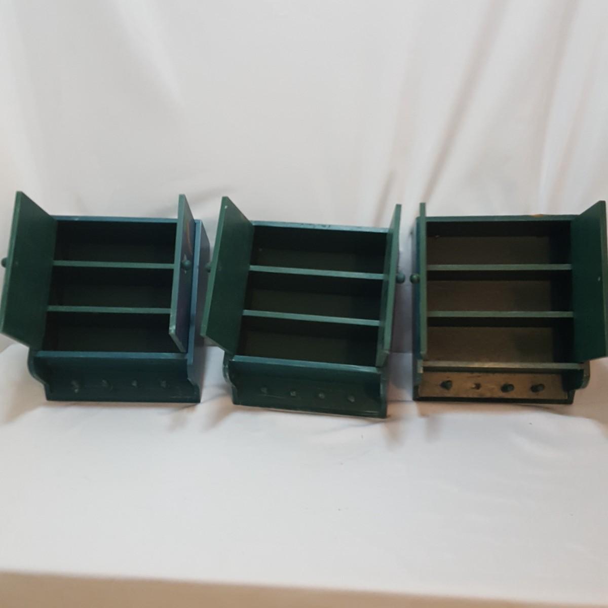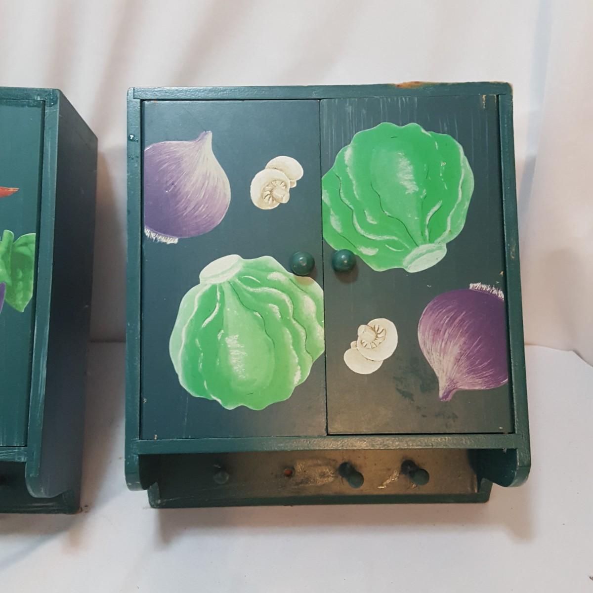 These are three matching green cabinets with painted vegetables on them. They each have hooks to have mugs, kitchen utensils or gadgets. The cabinets have three small shelves perfect for spices or smaller items. The third cabinet on the right has a little damage on the top corner, on the shelves and is missing a peg, the other two appear to be in good condition. The shelves measure 10.5” x 4.5” x 12”. The cabinets have brackets on the back to mount on a wall. In addition to kitchen items or spices, they could be used elsewhere in the house like unique jewelry boxes or medicine cabinets. Let us know how you purposed them, we love to learn how our items are repurposed from one home to another. Shipping available.