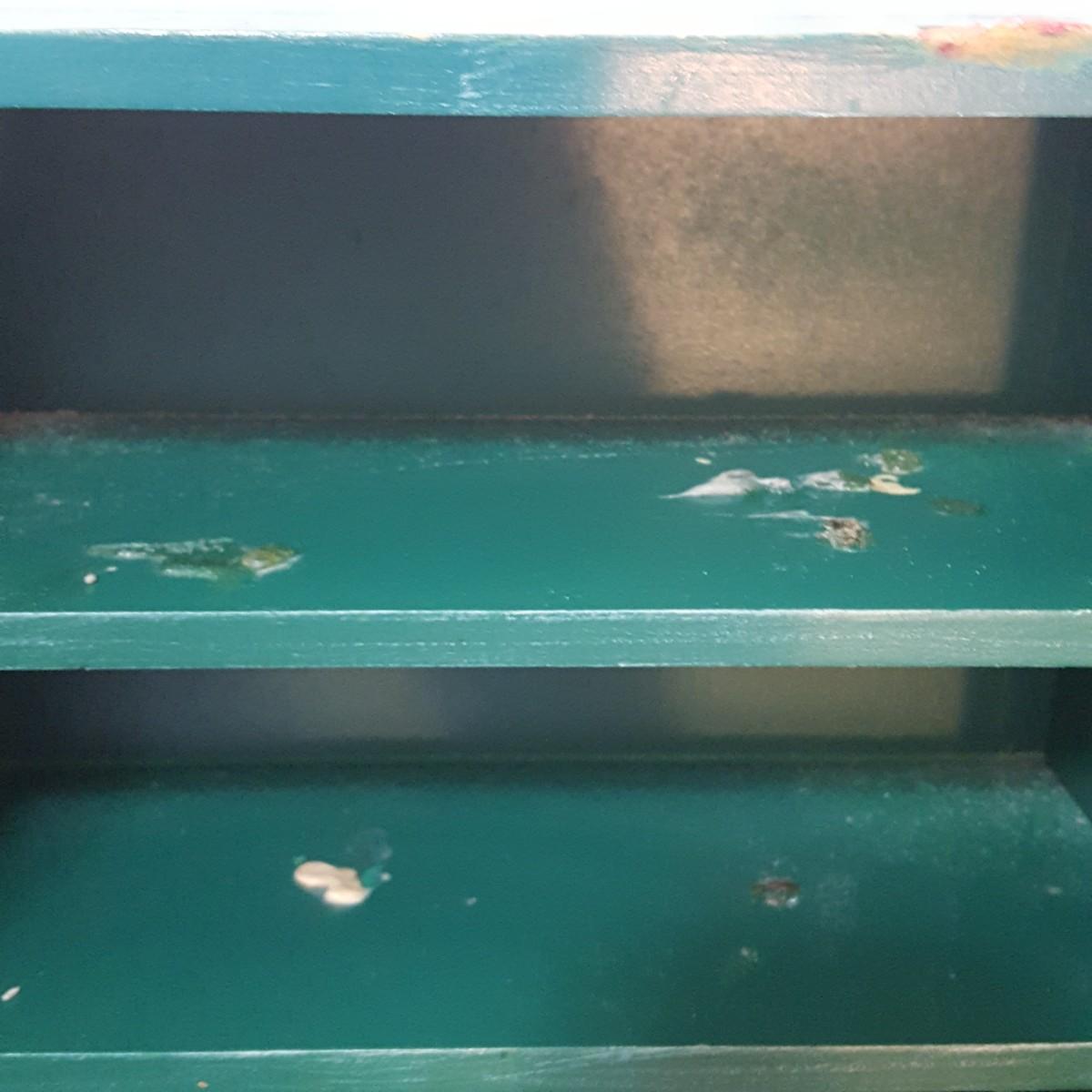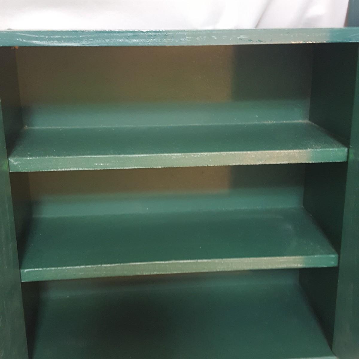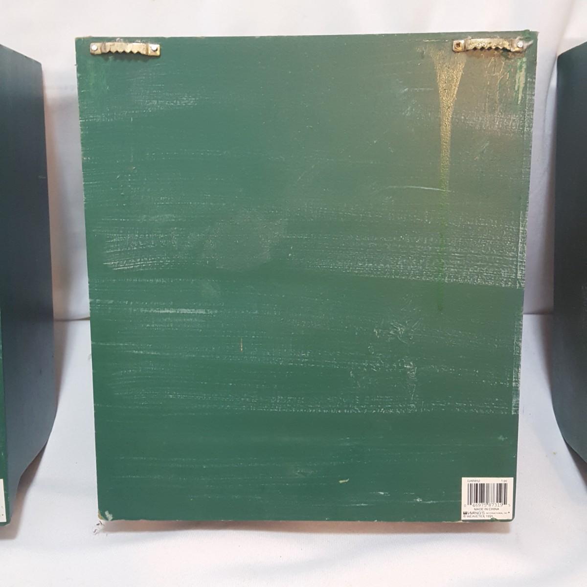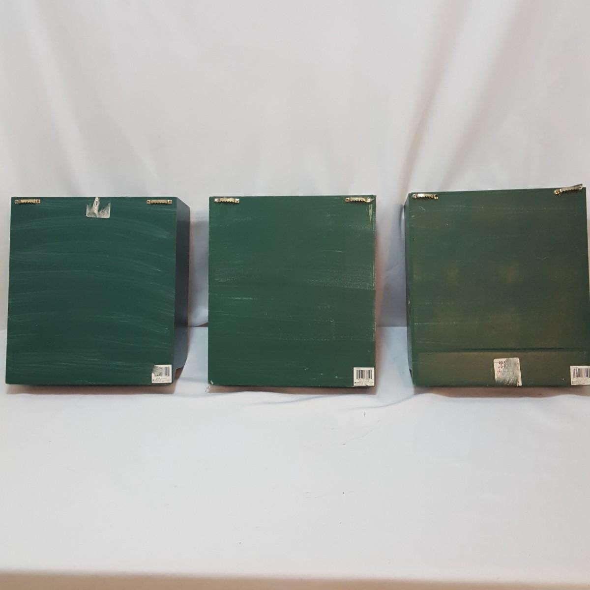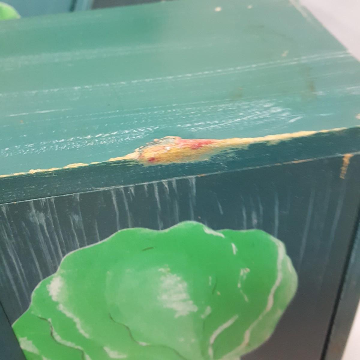These are three matching green cabinets with painted vegetables on them. They each have hooks to have mugs, kitchen utensils or gadgets. The cabinets have three small shelves perfect for spices or smaller items. The third cabinet on the right has a little damage on the top corner, on the shelves and is missing a peg, the other two appear to be in good condition. The shelves measure 10.5” x 4.5” x 12”. The cabinets have brackets on the back to mount on a wall. In addition to kitchen items or spices, they could be used elsewhere in the house like unique jewelry boxes or medicine cabinets. Let us know how you purposed them, we love to learn how our items are repurposed from one home to another. Shipping available.