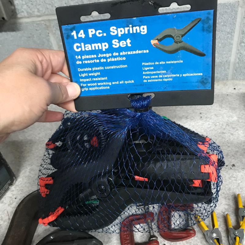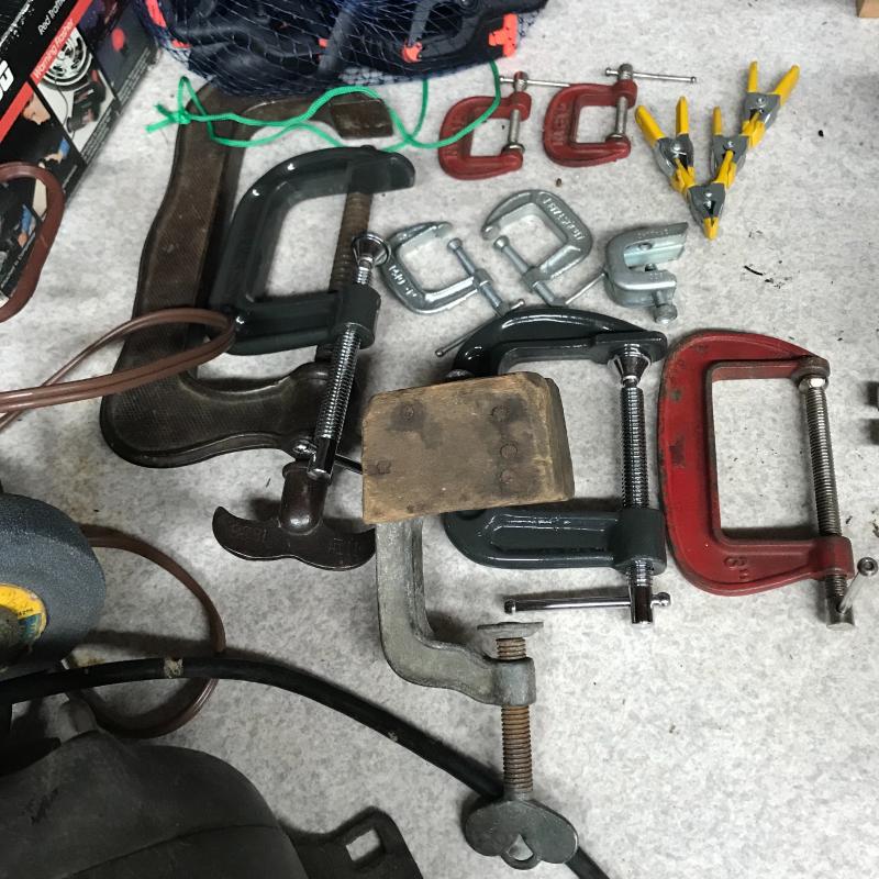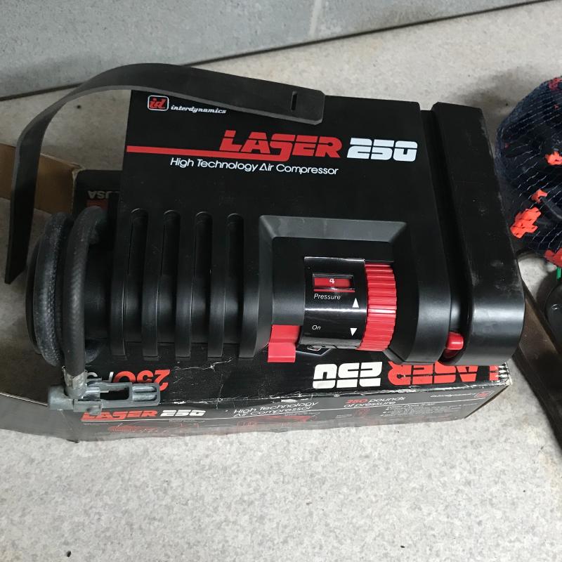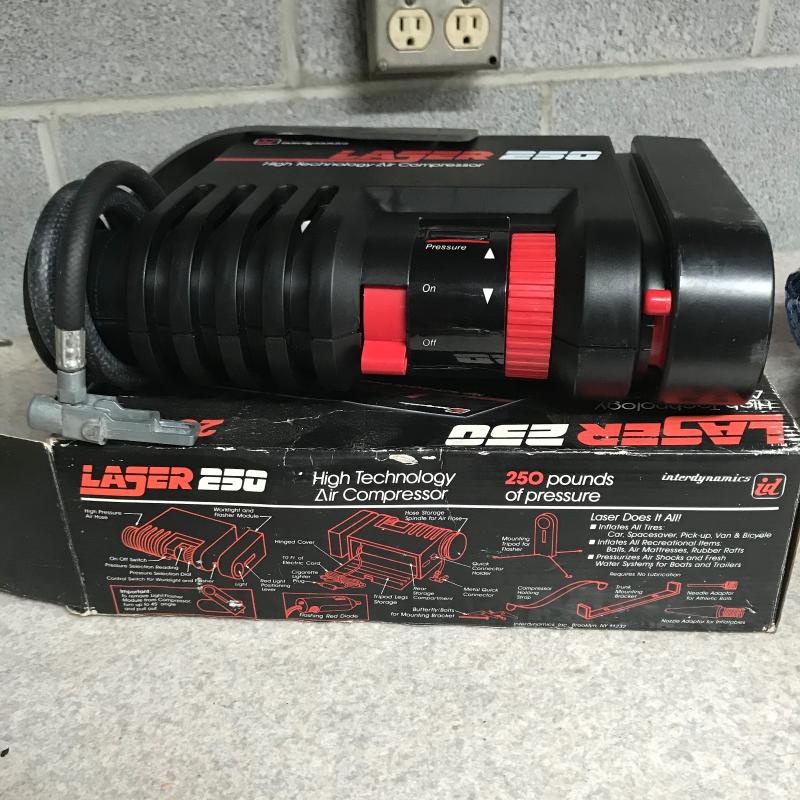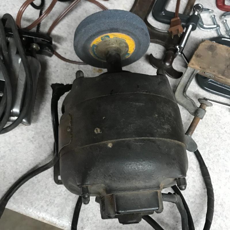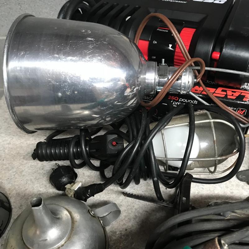 Laser 250 “High Technology” air compressor along with oil cans, four Fram PH8172 oil filters, collection of clamps (some new), battery powered dremel and more! See photos for all inventory. Grinder is possibly handmade with no known power switch, but turns on when plugged in. No shipping.