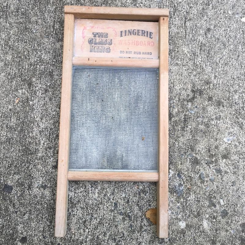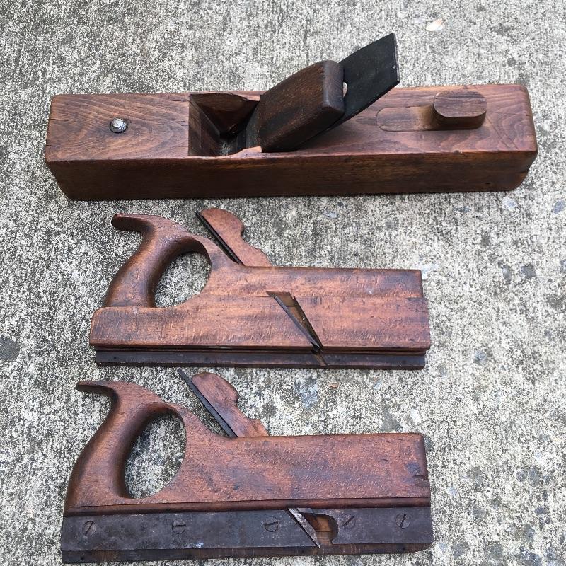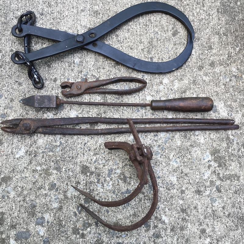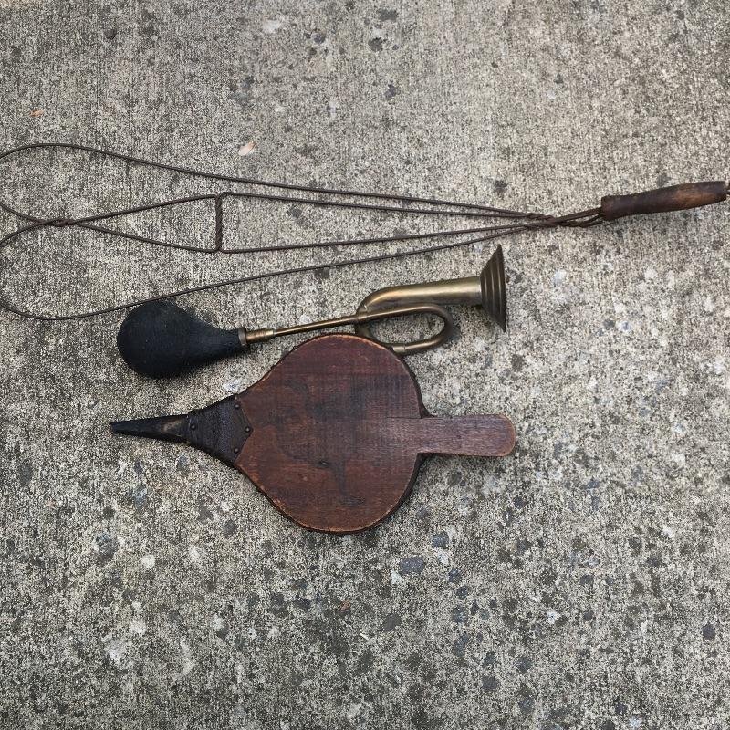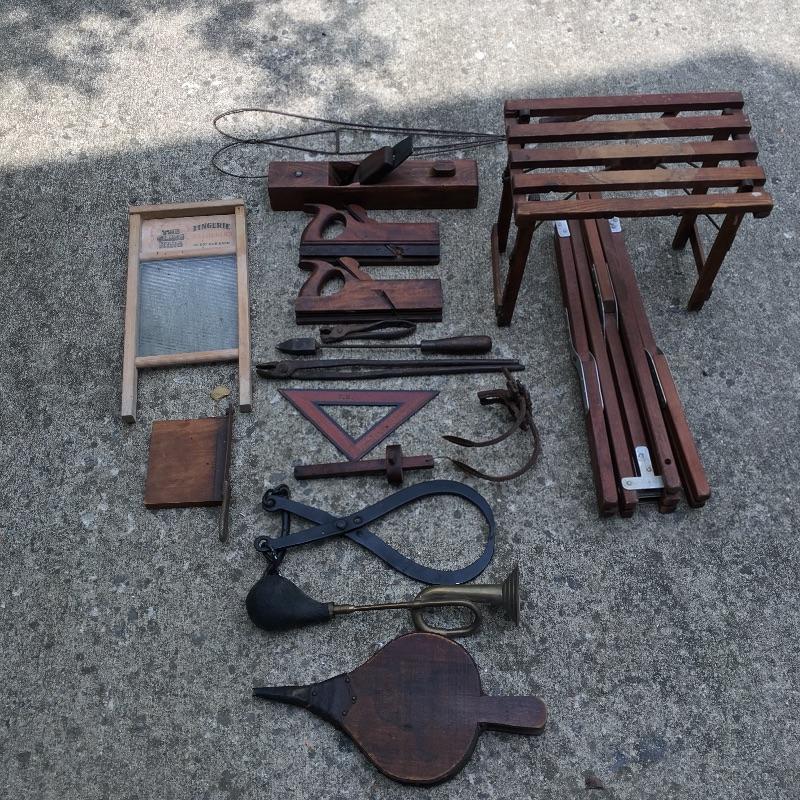 Variety of antique tools including brass horn, folding cot and mini table, planers, rug beater, lingerie washboard, bellow and more.