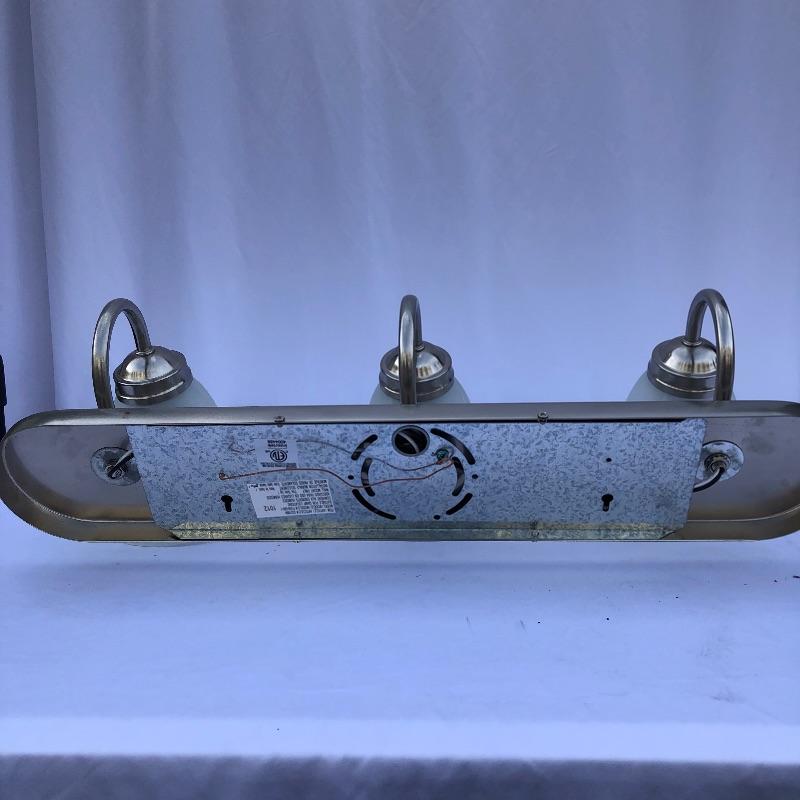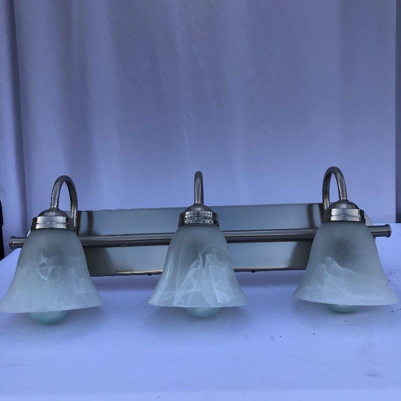 Metal bathroom light fixture with 3 glass lamps and a pair of flood lights new in box.
