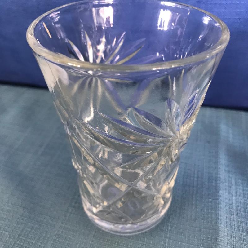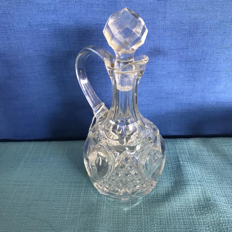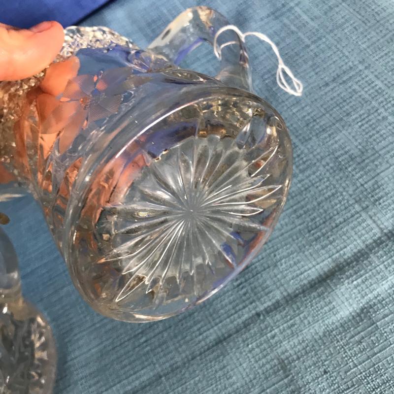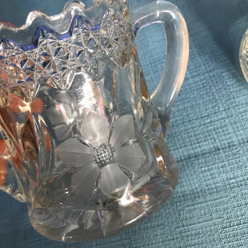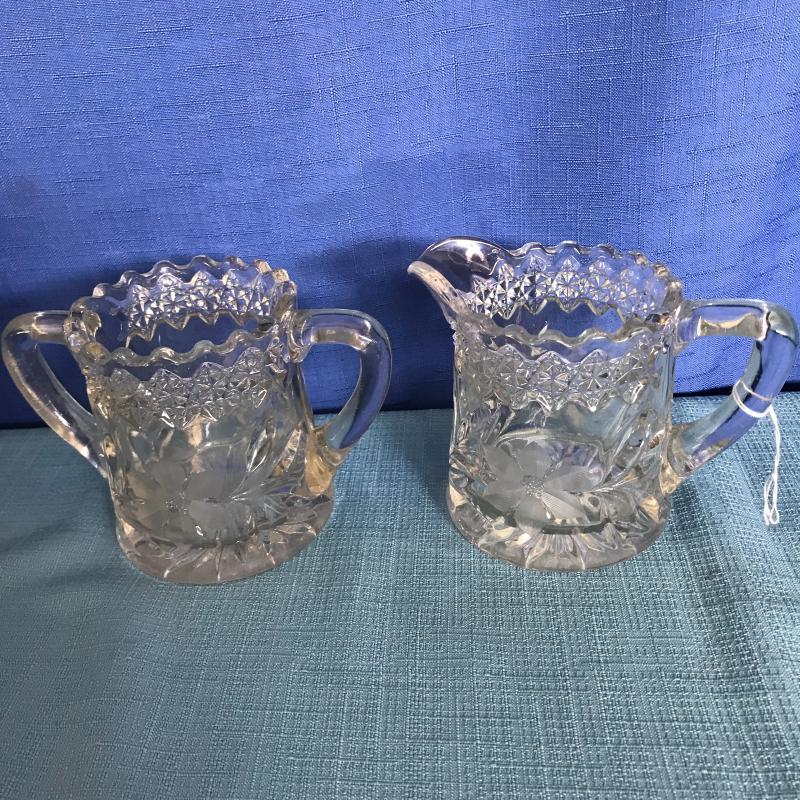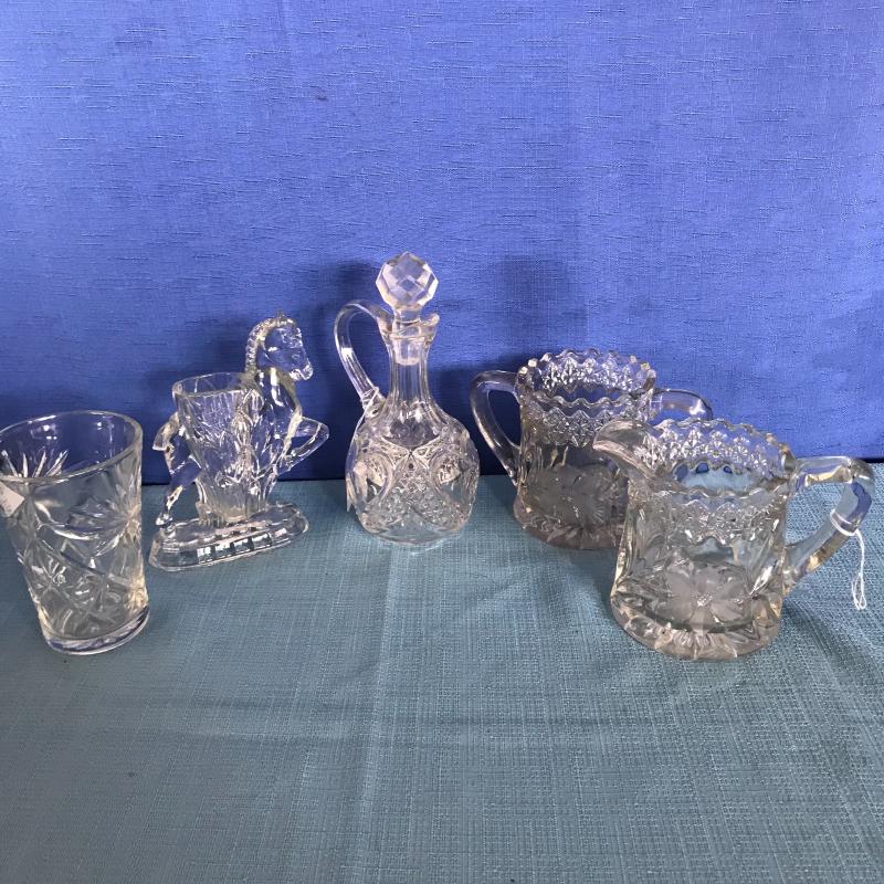 Lot includes five pieces of glassware: one drinking glass, one oil/vinegar bottle with lid, horse vase, and cream and sugar set. No shipping available. Local pickup only in Maggie Valley, NC.