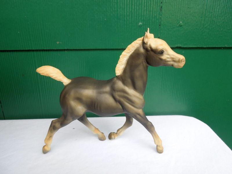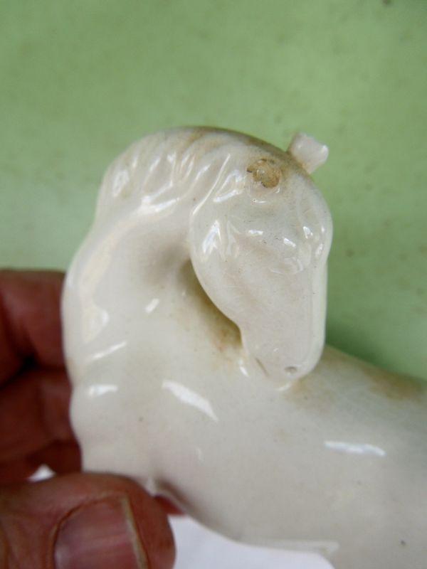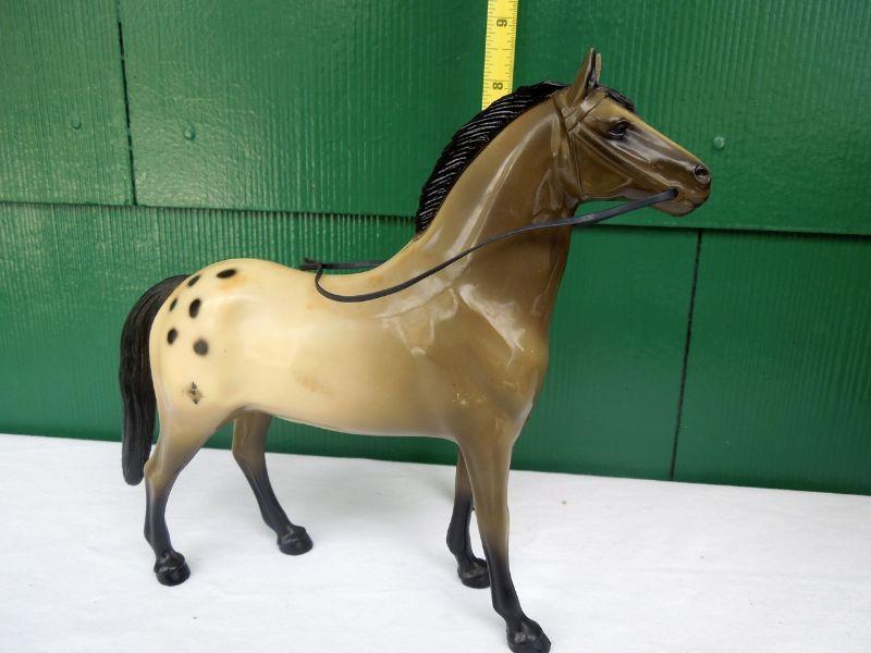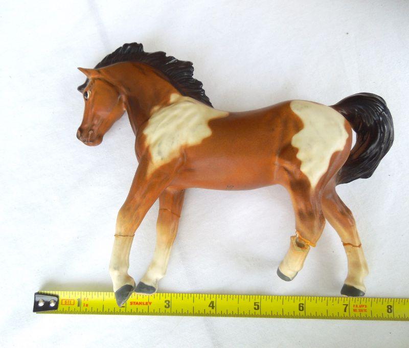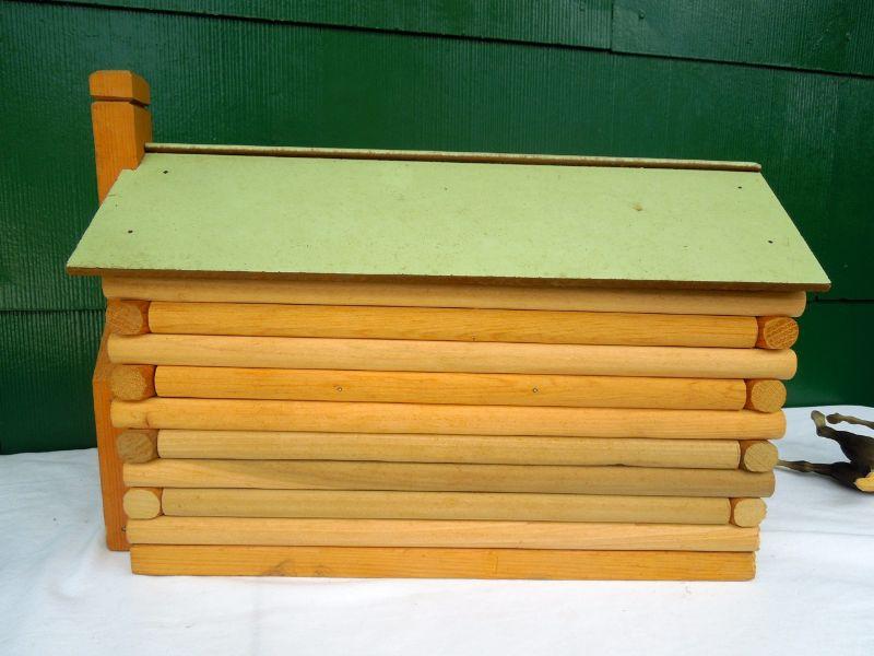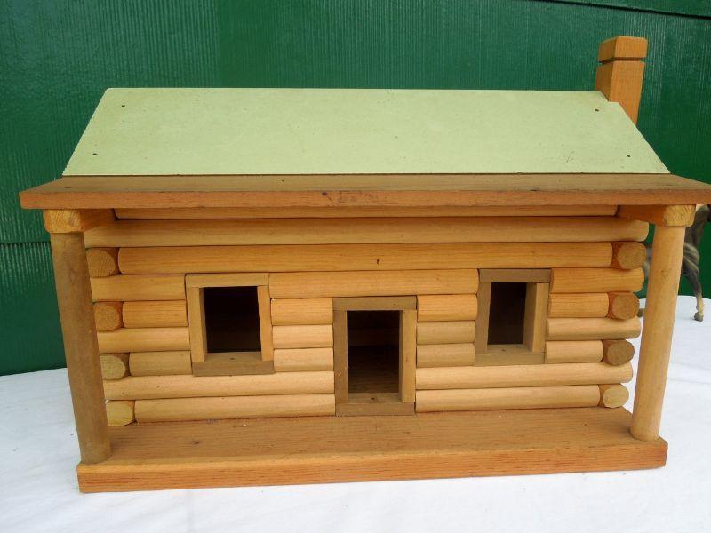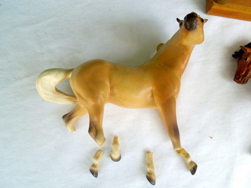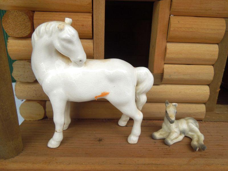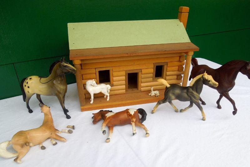 Lincoln log cabin with plywood roof 18: x 10" x 13". 1 plastic Breyer b&W horse; a Hartland palamino horse; a hartland roan horse (doesn't stand alone); 2 ceramic horses with broken legs and tw owhite ceramic horses with damage.