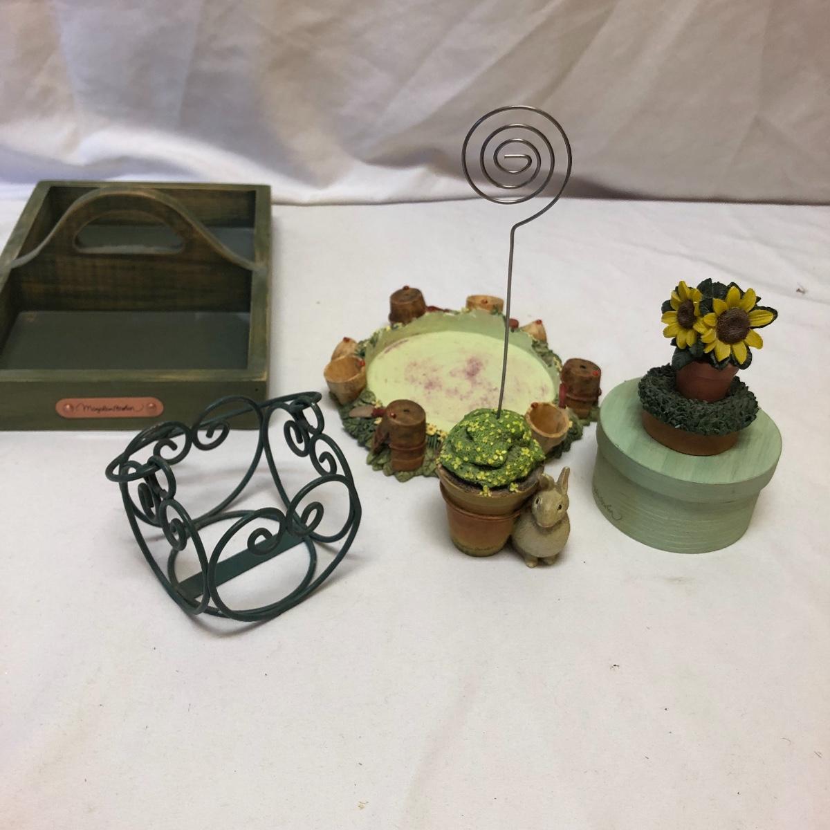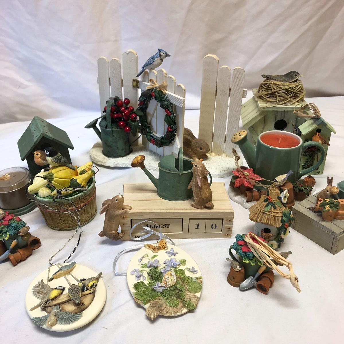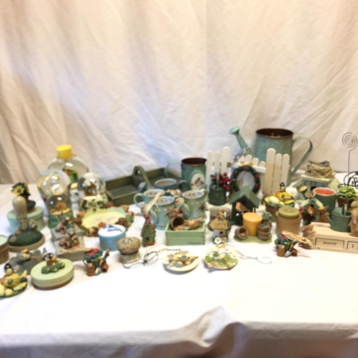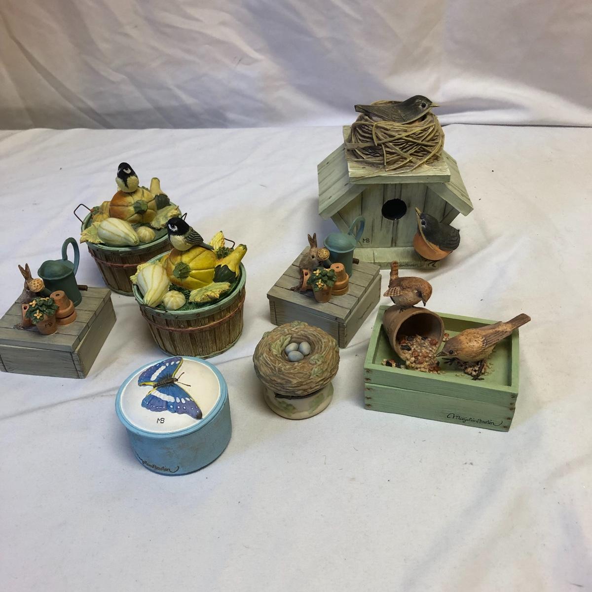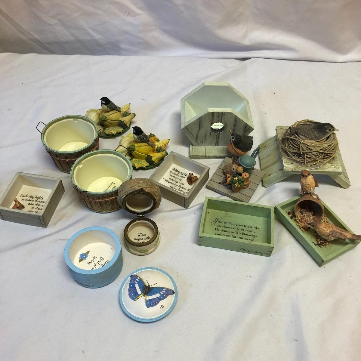 This lot is the last of the Marjolein Bastin lots (other lots are 225, 228 and 235). This assortment contains a mix of ceramic, glass and metal figurines for decorating. Just two pieces have defects that are shown in images and the little wren atop a green box just needs a dab of glue. There are four snow globes here, some candle holders, lots of trinket boxes, Christmas tree ornaments, a stamp, jar tops and a small faux wood tray that measures 6.5” x 9.5” x 1.5.