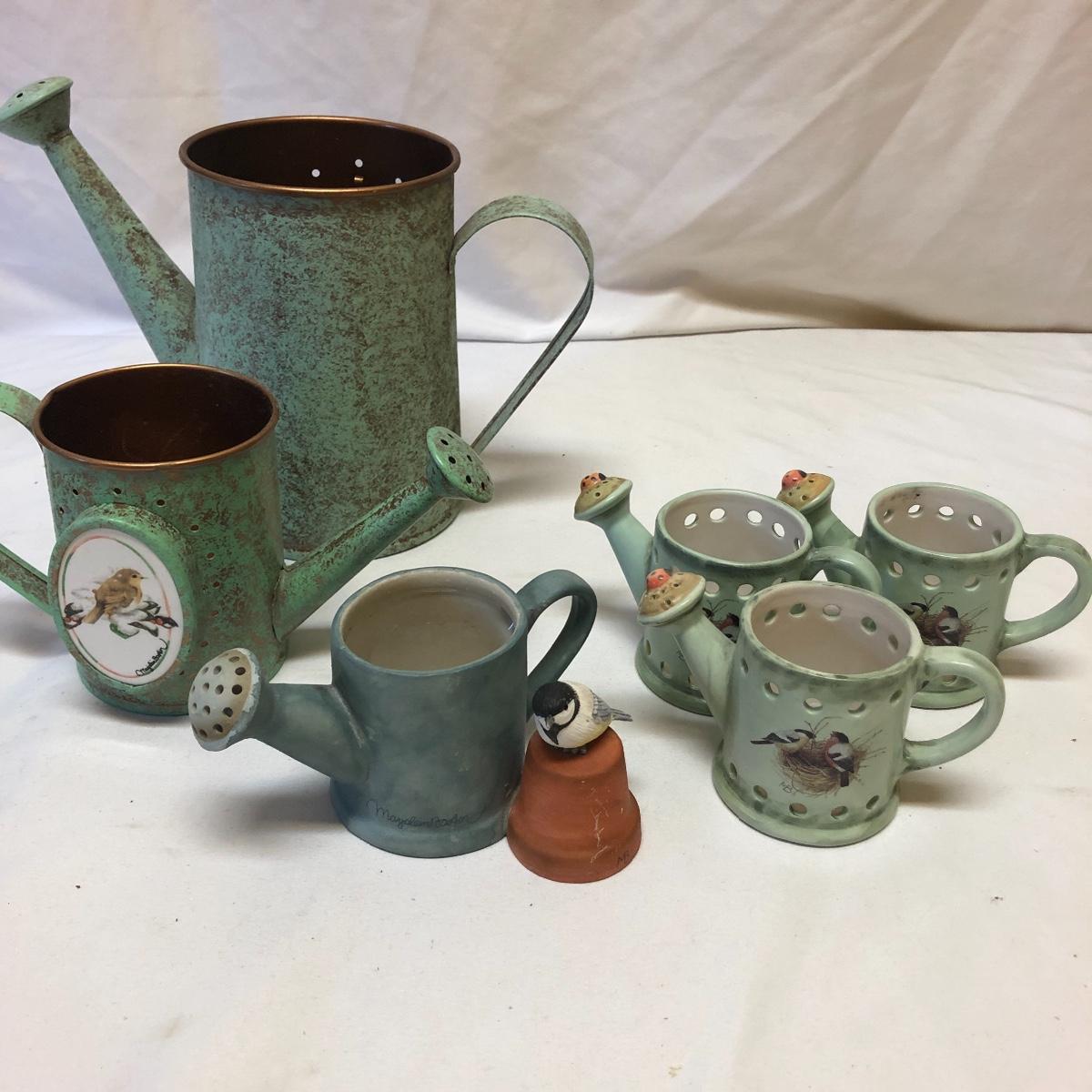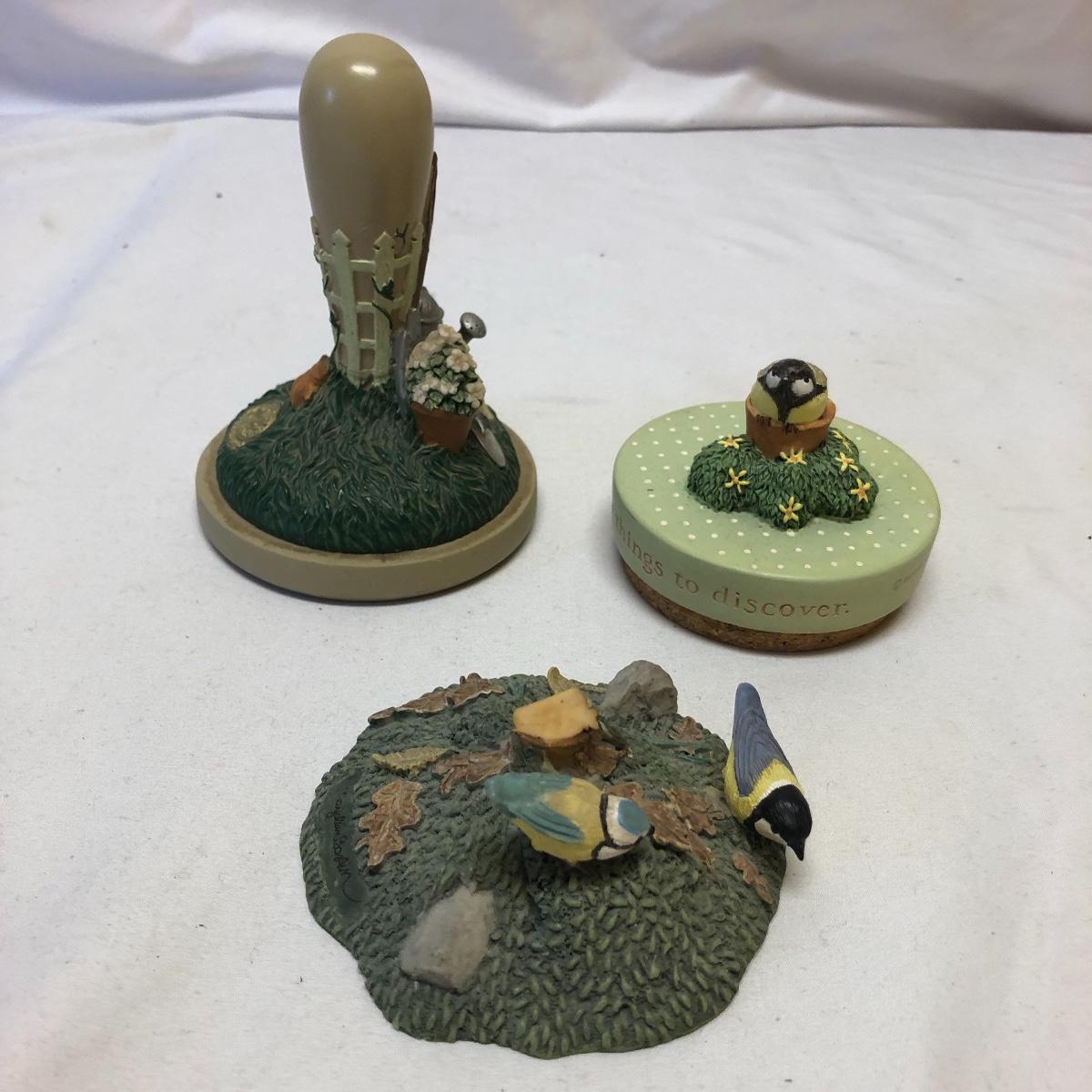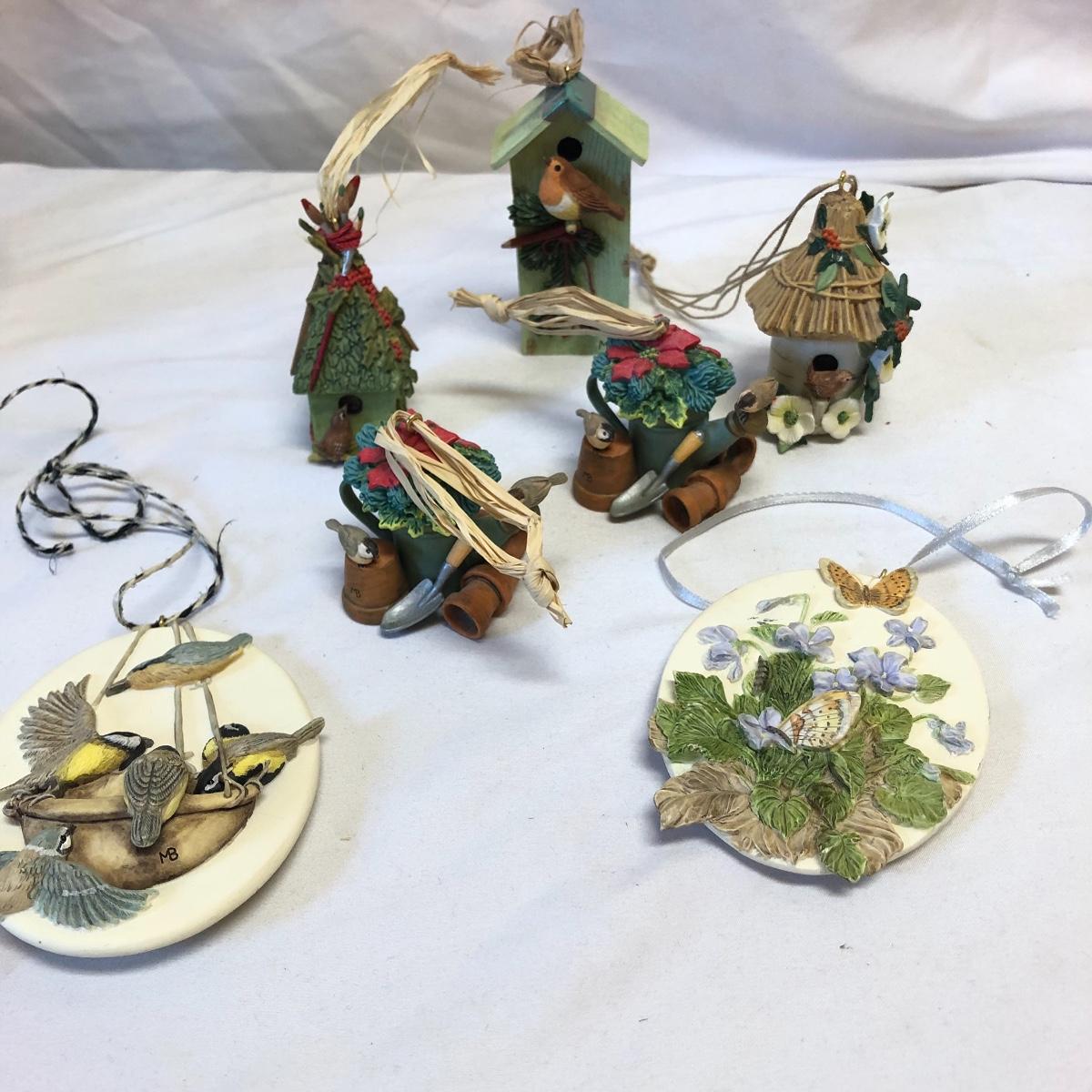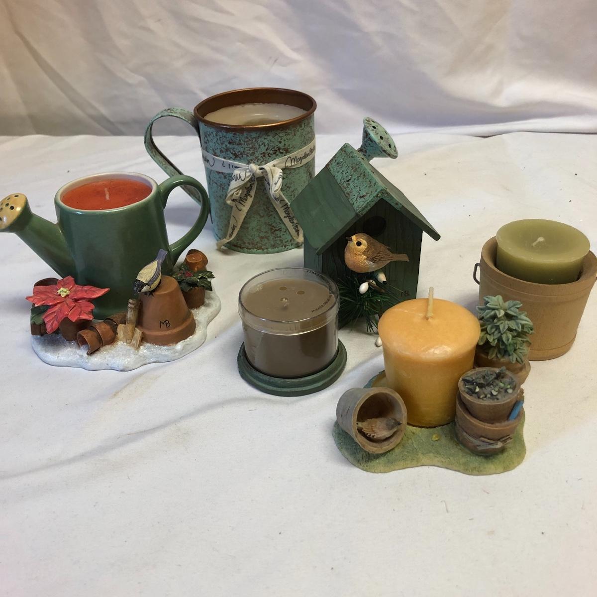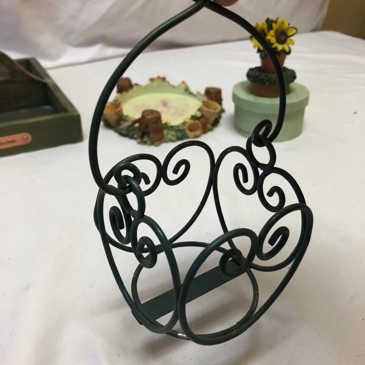 This lot is the last of the Marjolein Bastin lots (other lots are 225, 228 and 235). This assortment contains a mix of ceramic, glass and metal figurines for decorating. Just two pieces have defects that are shown in images and the little wren atop a green box just needs a dab of glue. There are four snow globes here, some candle holders, lots of trinket boxes, Christmas tree ornaments, a stamp, jar tops and a small faux wood tray that measures 6.5” x 9.5” x 1.5.
