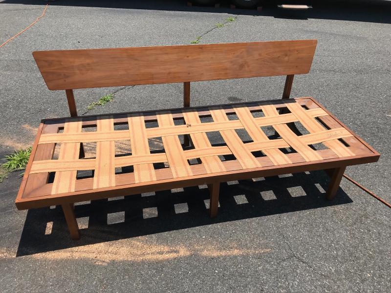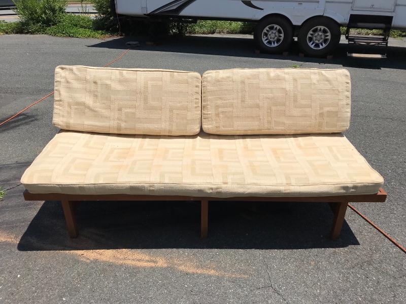 Very nice MCM Danish modern teak daybed. Square legs support clean lined frame of webbing. Back uprights support angeled backrest. Removable original seat and back cusions in a tan woven geometric fabric. Removable cushion coveres are in good condition, but foam has hardened and needs to be replaced. Pair available (Lot 233). 75" x 32" x 31" H