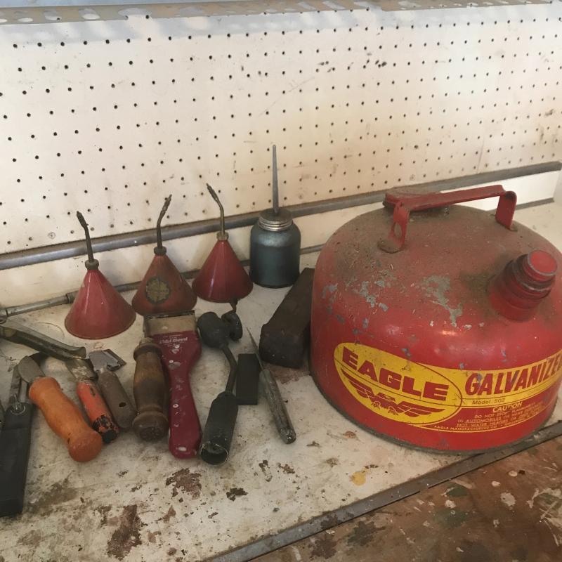 Eagle gas can, Four small oil dispensers, Stanley planer, work gloves and other misc. tools. See pics. No shipping. Local pick up only in Asheville, NC.
