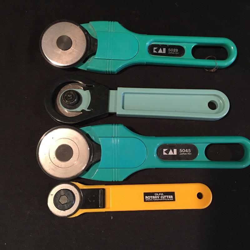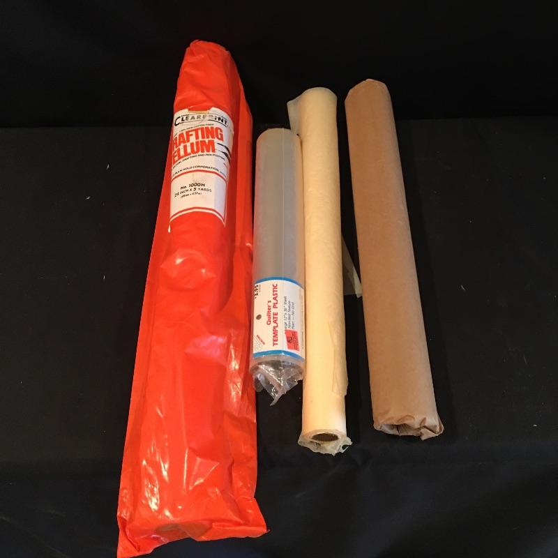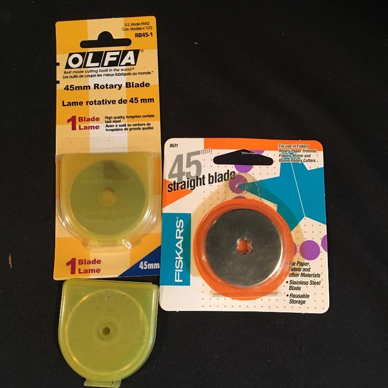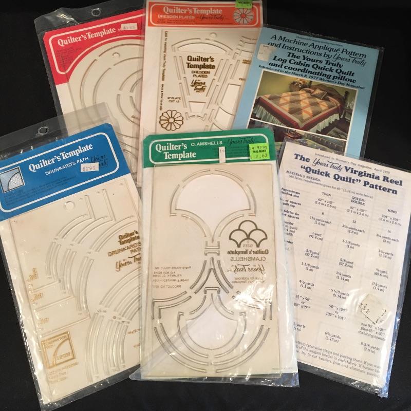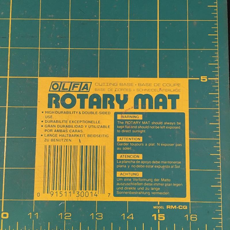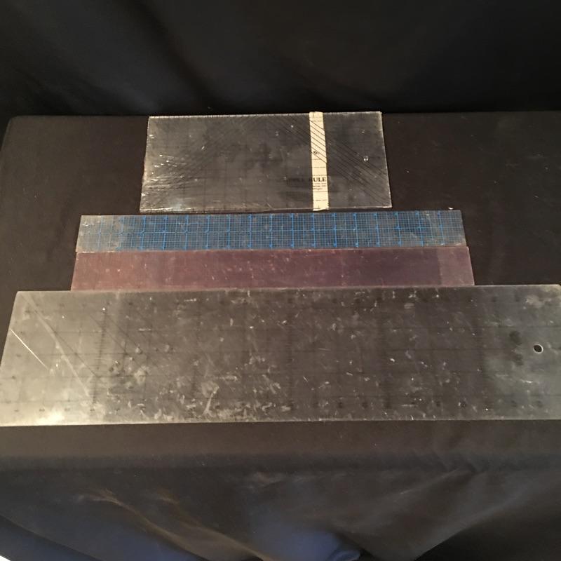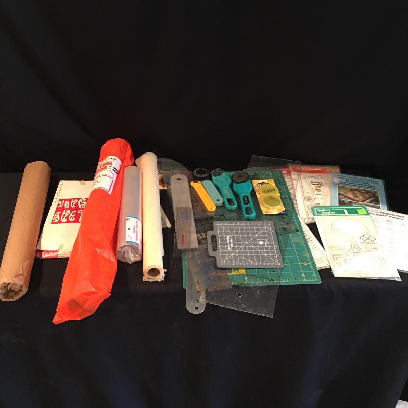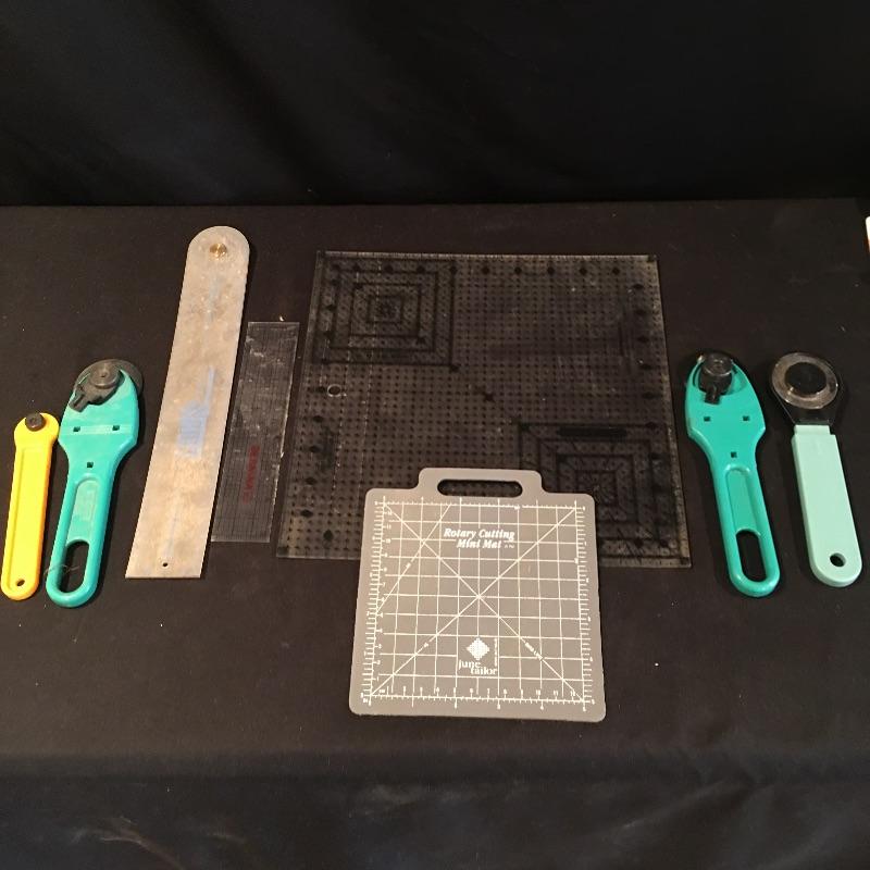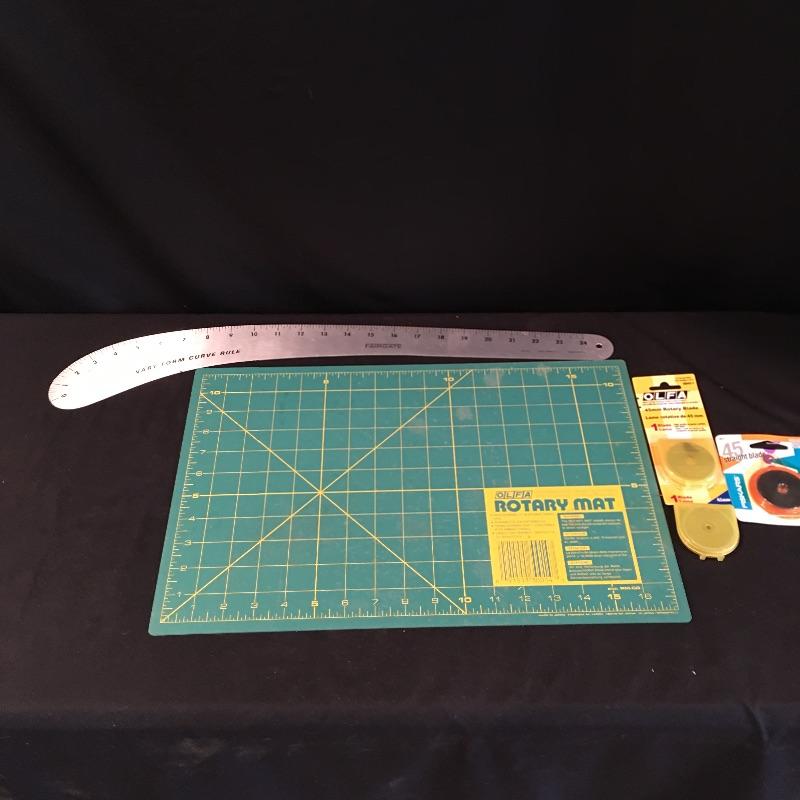 Rotary mat cutters and more includes Olfa rotary mat, four rotary cutters, rotary cutter blades, vary form curved ruler, pineapple rule, quilters templates, tracing paper, curved set of see through rulers and more. Keep yourself on the straight and narrow path with this great assortment of curved and straight rulers and more.