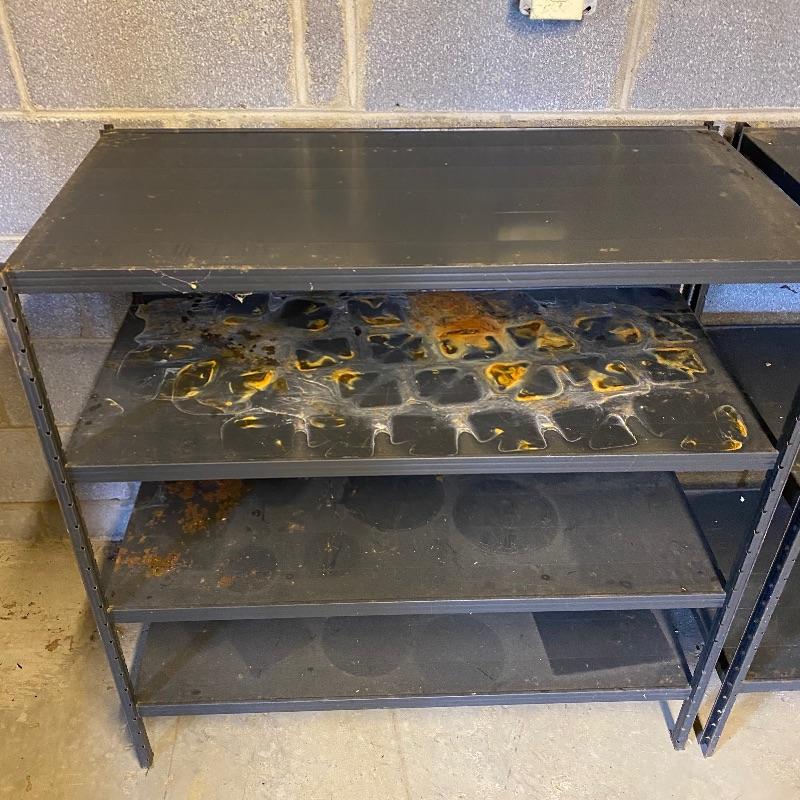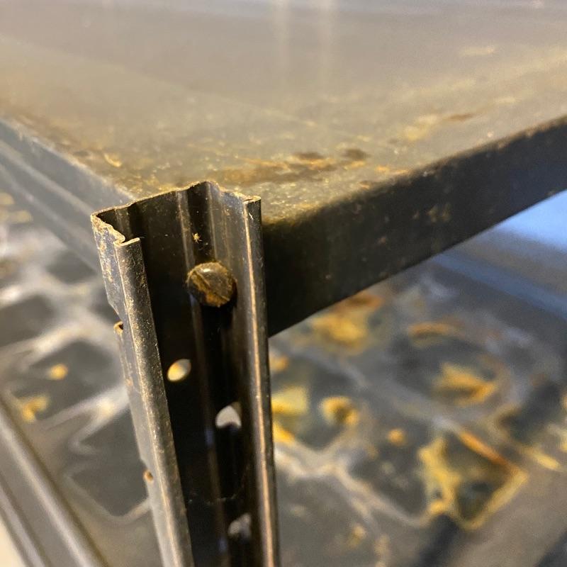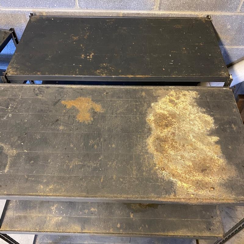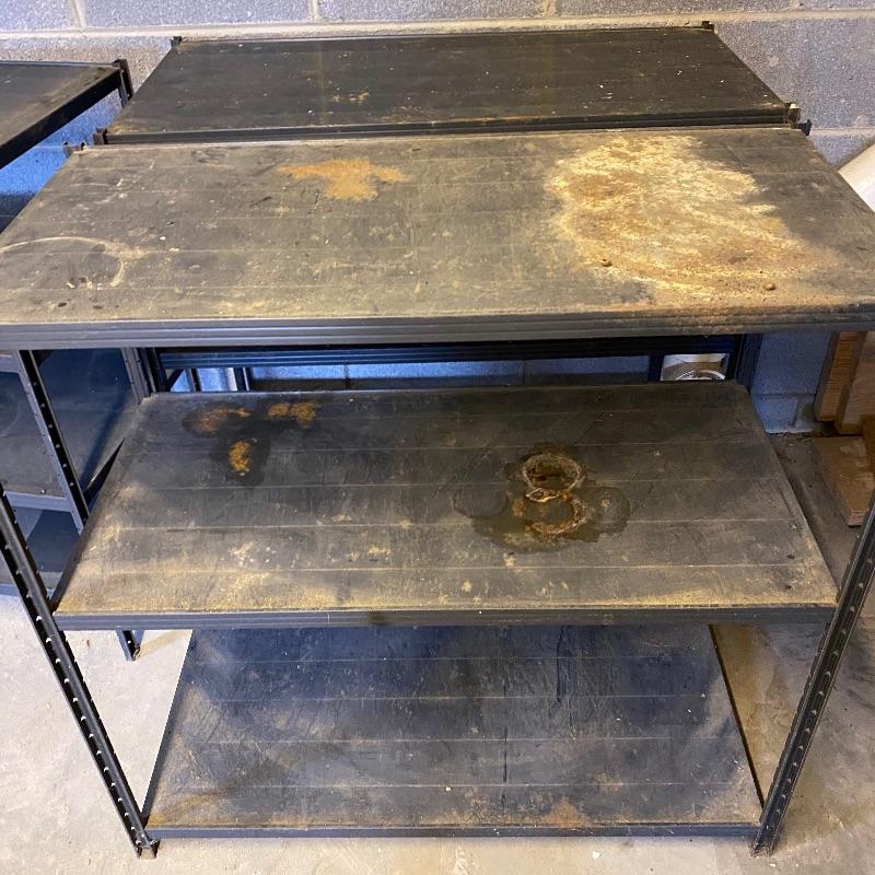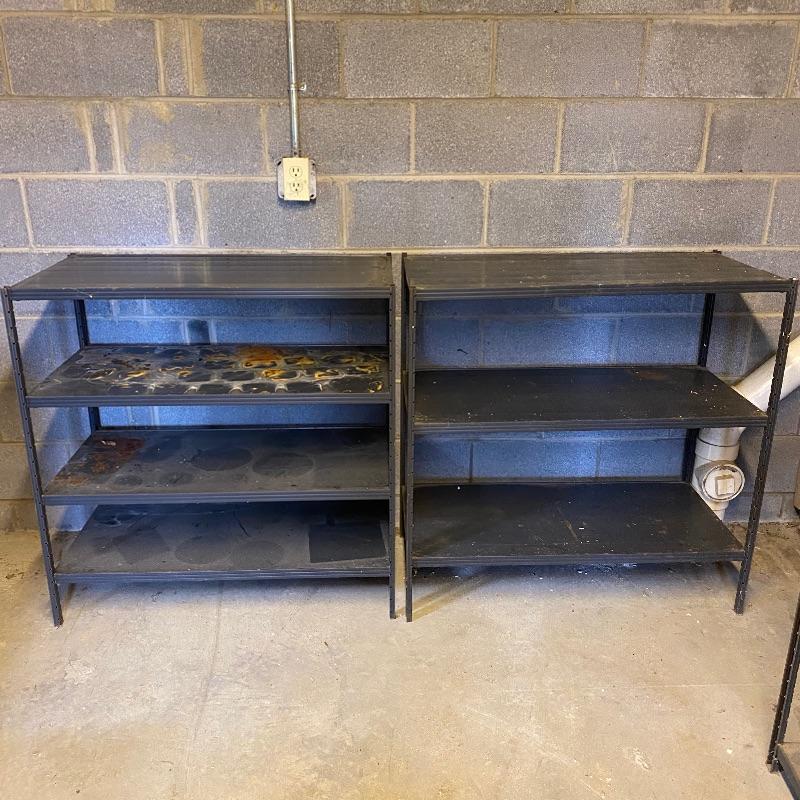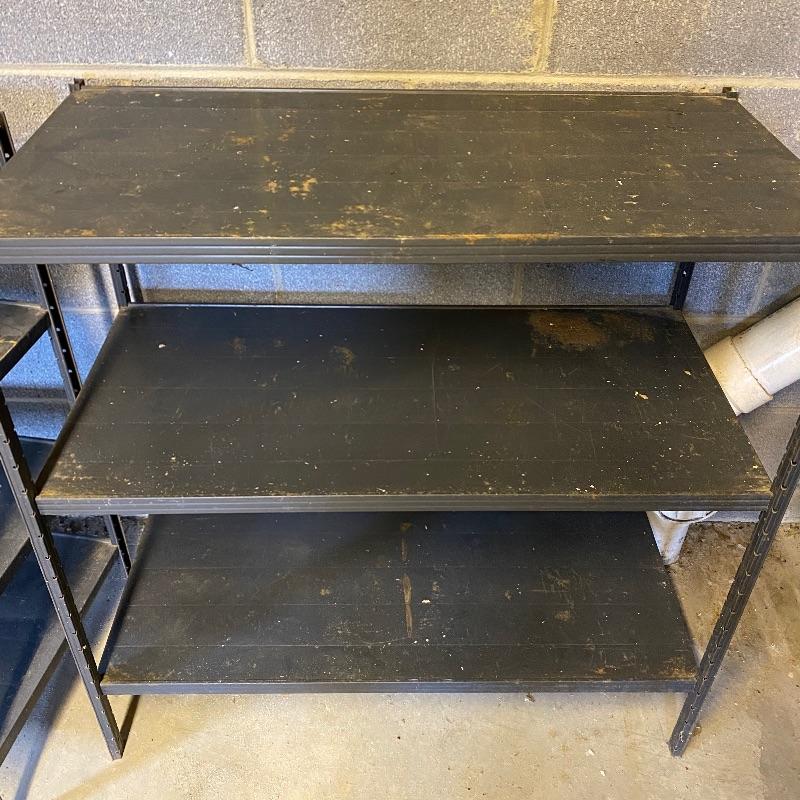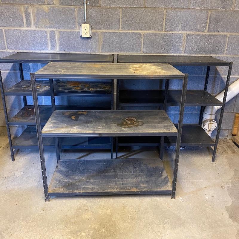 Three handy short metal shelves for storage. Yes, they do have some rust stains, but no holes and work fine for storage and are a nice handy smaller size. There are some screws holding them together but it’s probably easier to not try to take them apart. All three have same measurements 36” x 17.5” x 36”high. One has the rail attached sideways which adds a half inch to the length. See photos. No shipping