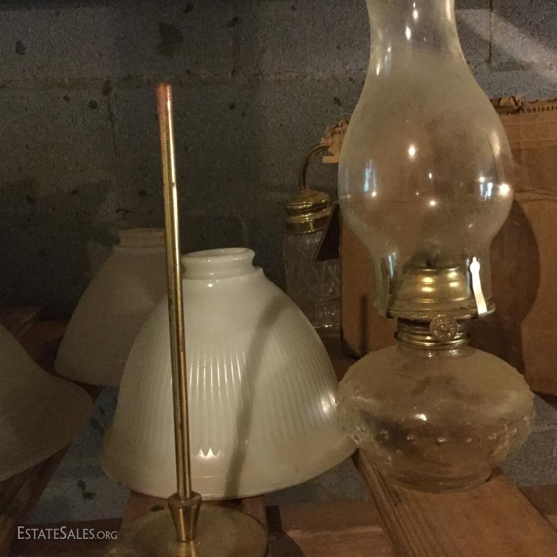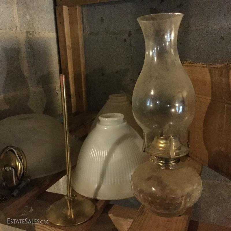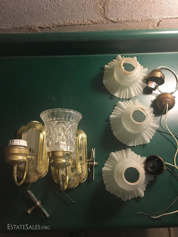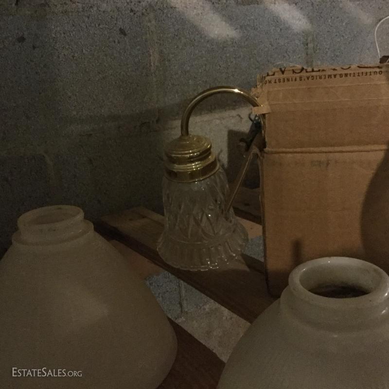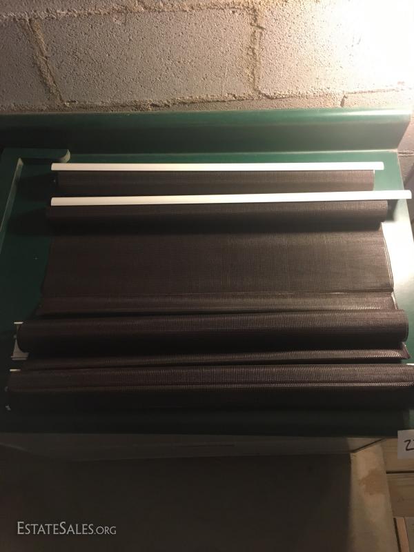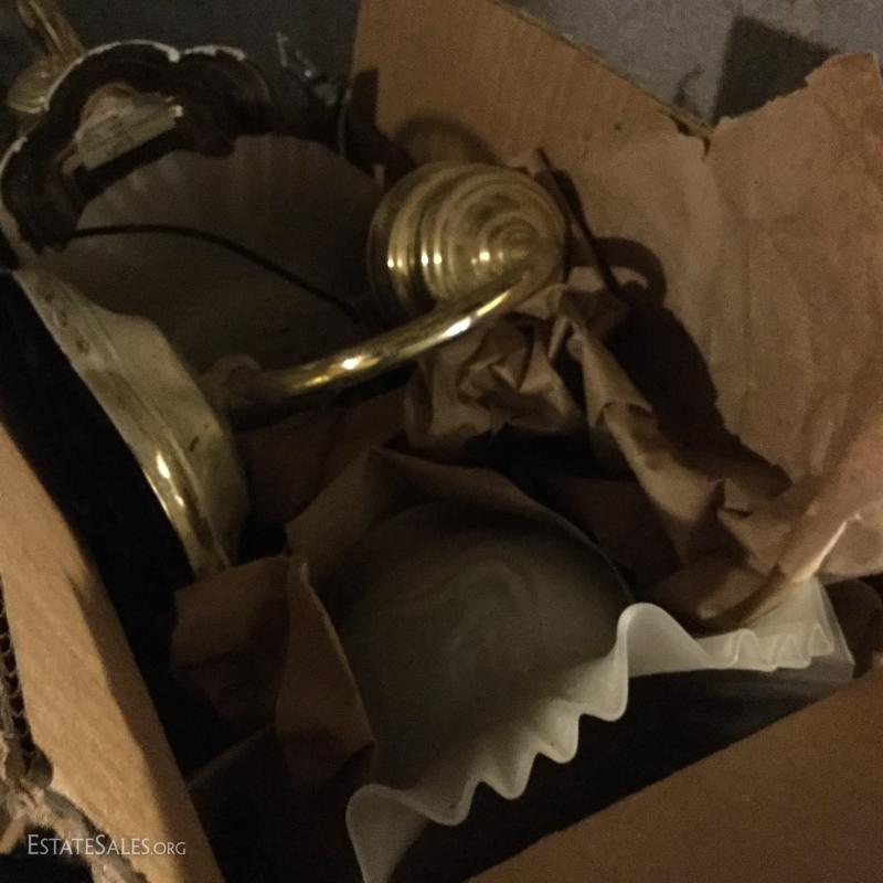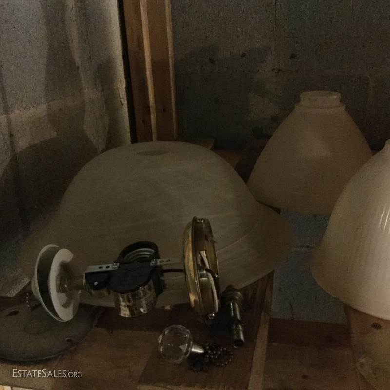 Glass oil lamp with brass details measuring 13.5" tall. Two wall mount brass fixtures with one shade, 3 older brass fixtures with skirt shades, one ceiling mount fixture with shade and two milk glass shades. Also in lot are 4 Smith Noble window roller shades that appear to be unused. They have white hardware and a brown/black screen netting for the shade. 3 units measure 27.5"w and aprox. 77" long for shade open. One unit is slightly smaller than the other 3 by about 1" in width. This lot is available for local pick up in Hendersonville, NC only.
