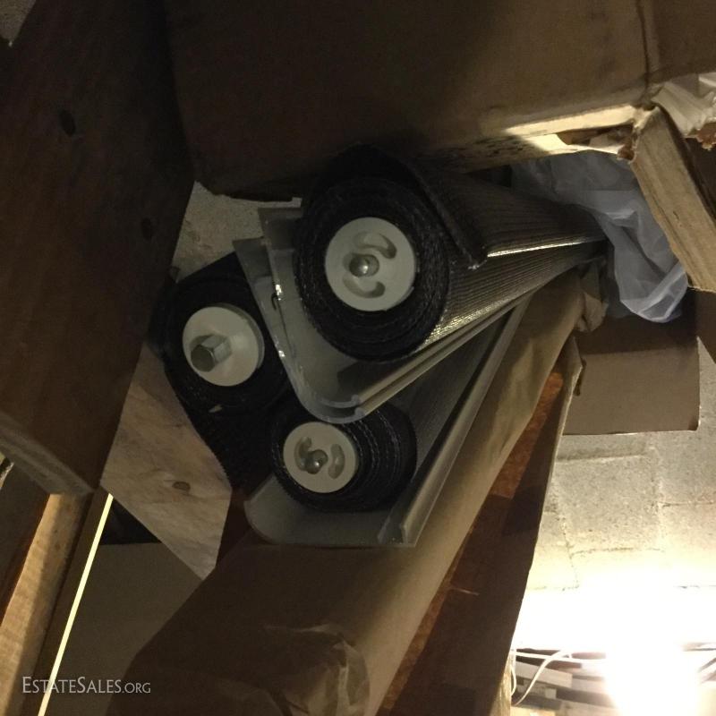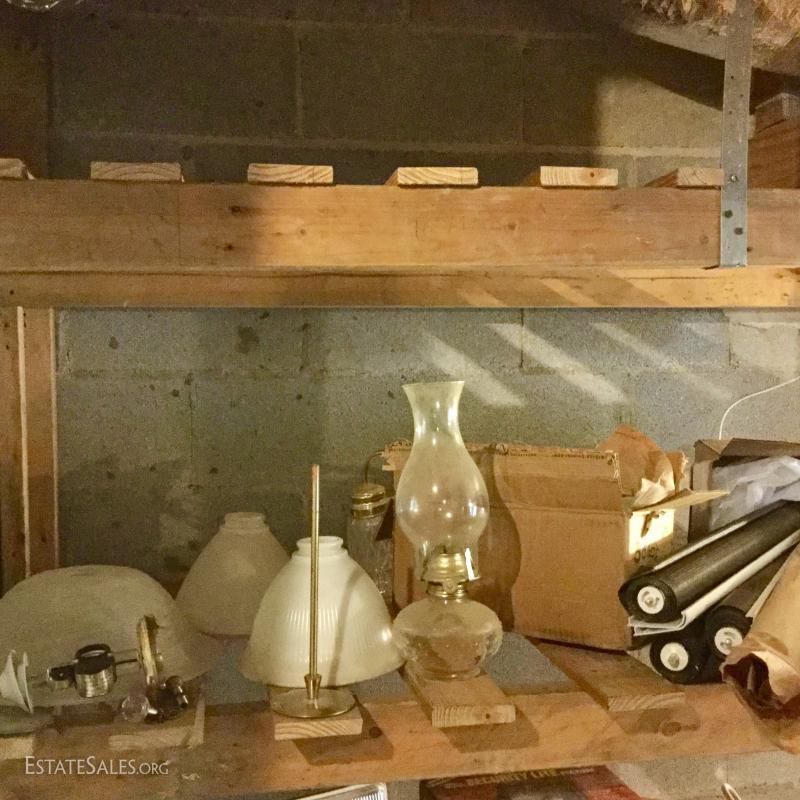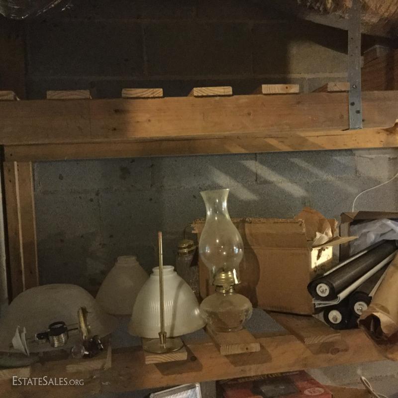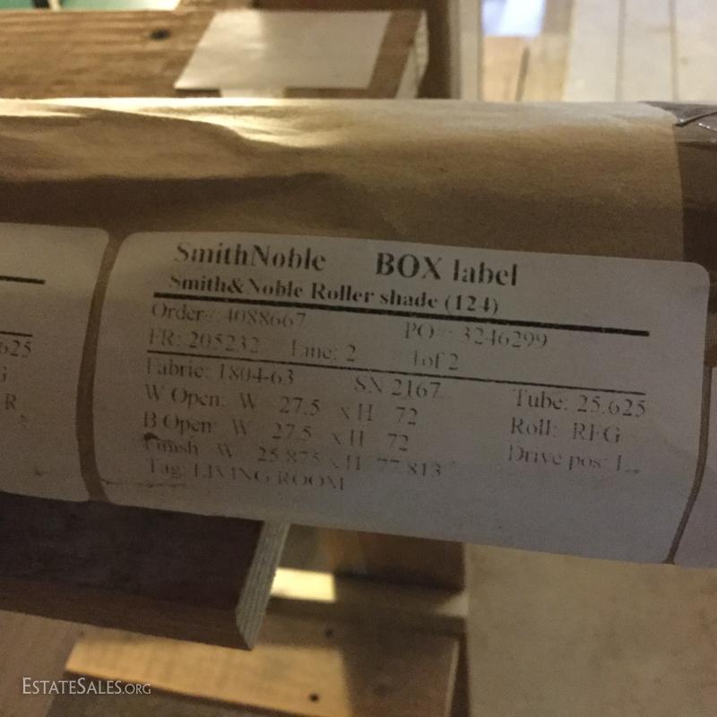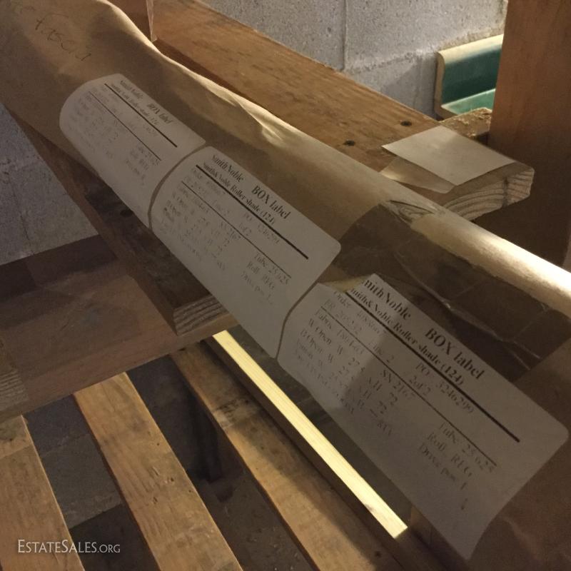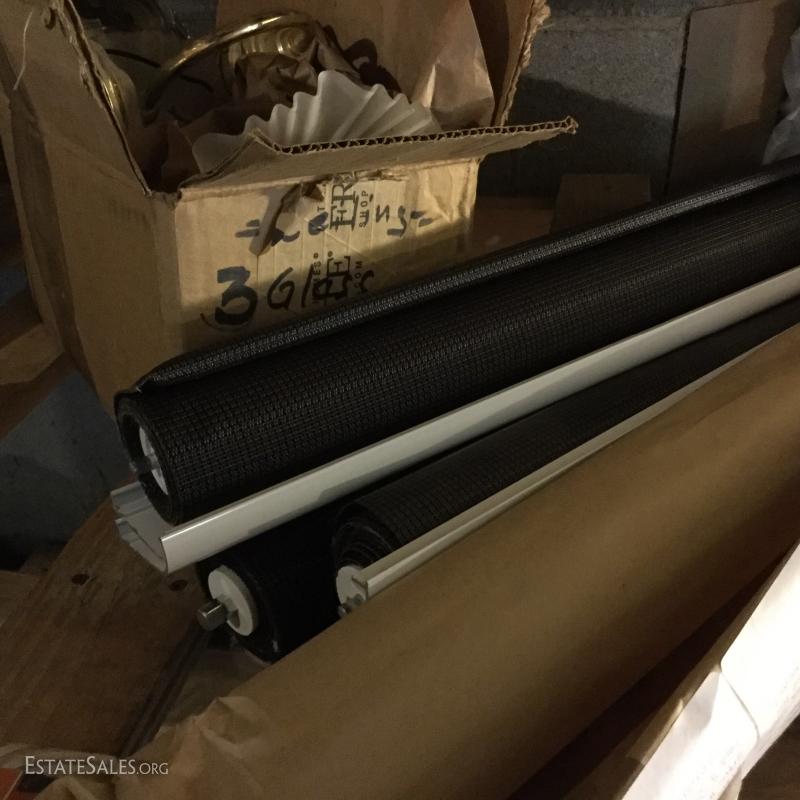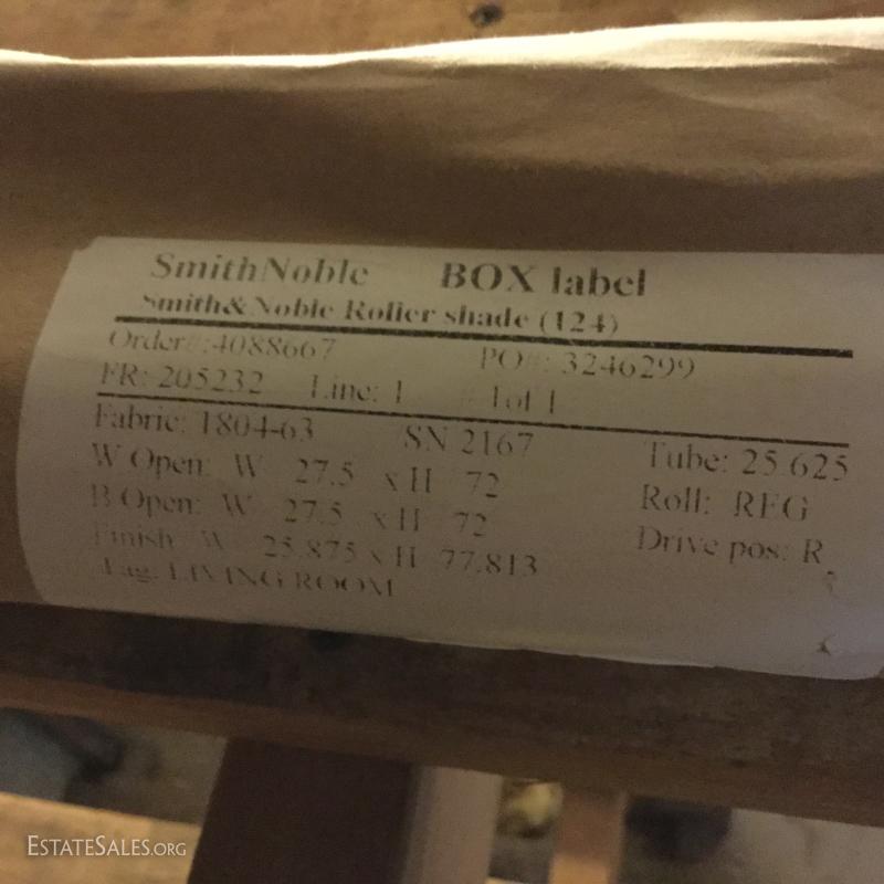 Glass oil lamp with brass details measuring 13.5" tall. Two wall mount brass fixtures with one shade, 3 older brass fixtures with skirt shades, one ceiling mount fixture with shade and two milk glass shades. Also in lot are 4 Smith Noble window roller shades that appear to be unused. They have white hardware and a brown/black screen netting for the shade. 3 units measure 27.5"w and aprox. 77" long for shade open. One unit is slightly smaller than the other 3 by about 1" in width. This lot is available for local pick up in Hendersonville, NC only.
