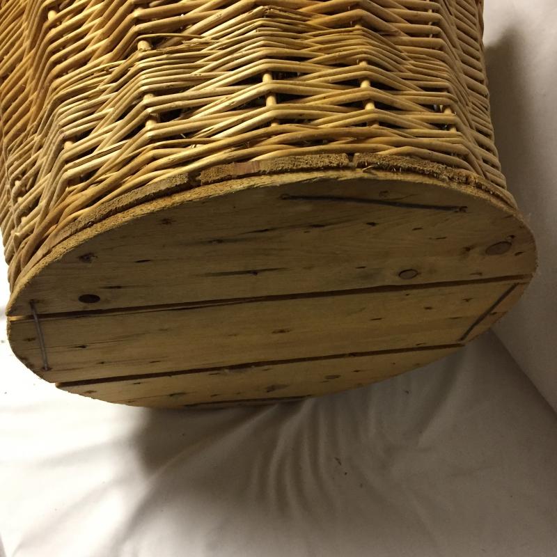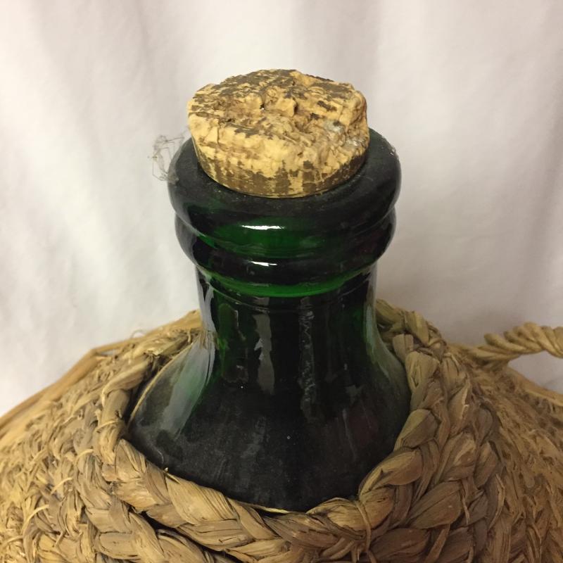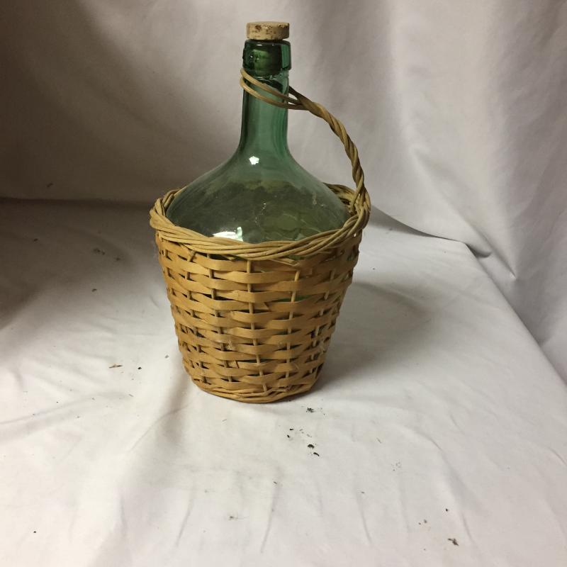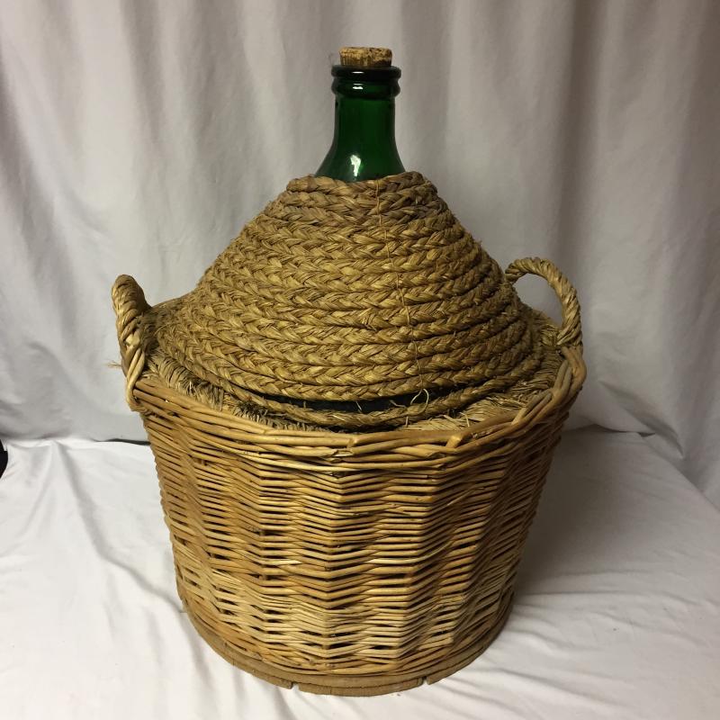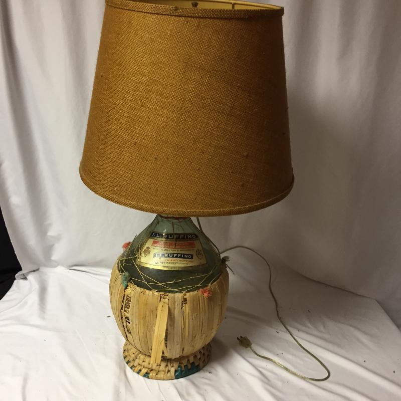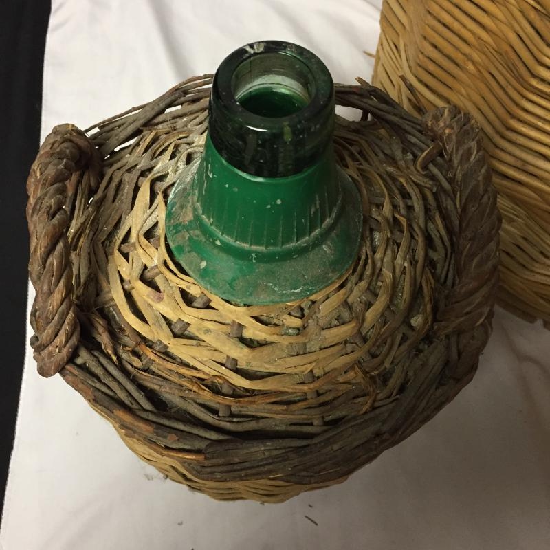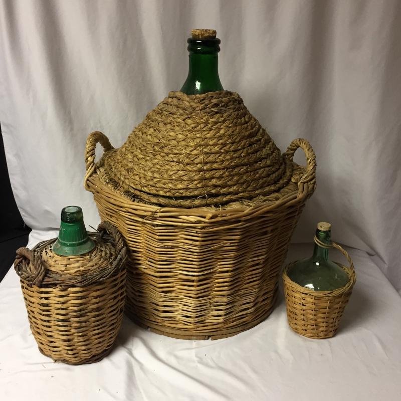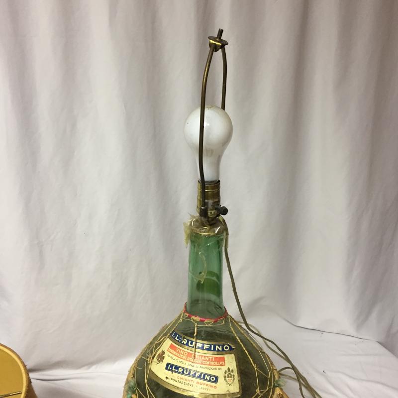 Three wicker wrapped bottles and one chianti bottle lamp. Largest bottle measures 30” tall 22”D. Lamp measures 31” tall. Lamp works but could use some tlc.