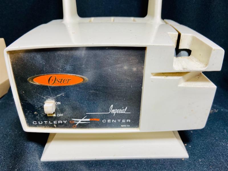 Vintage Theiftie yogurt maker (chip in one of the glass jars), MCM Oscar Imperial electric knife sharpener, Hamilton Beach switchblade electric knife missing one blade, large stock pot, & silver plated butter dish. Please see pictures for sizing/condition. MHW Please see all pictures for content of the lot, condition of the lot, and measurements if taken. Pictures are the best representation of the items listed and items are untested unless indicated in description. Thank you for looking and have fun bidding!