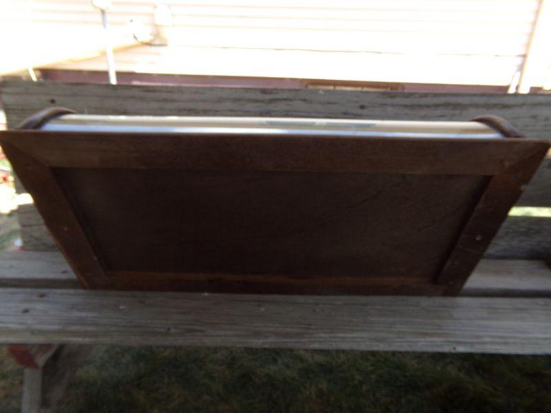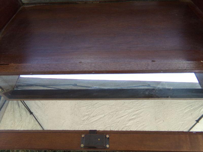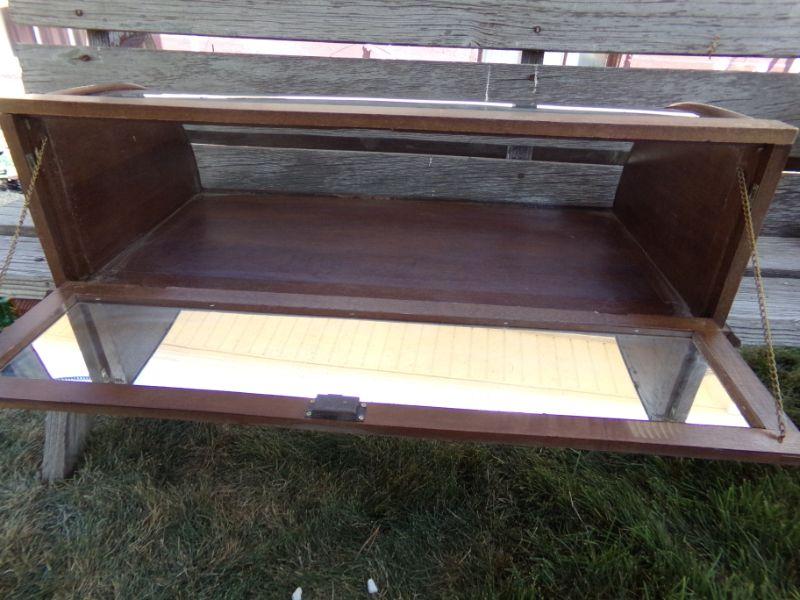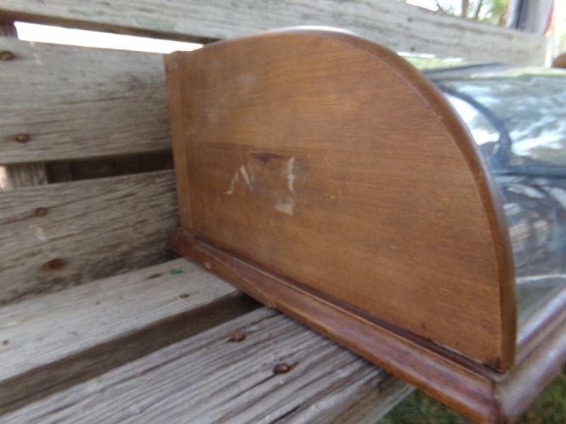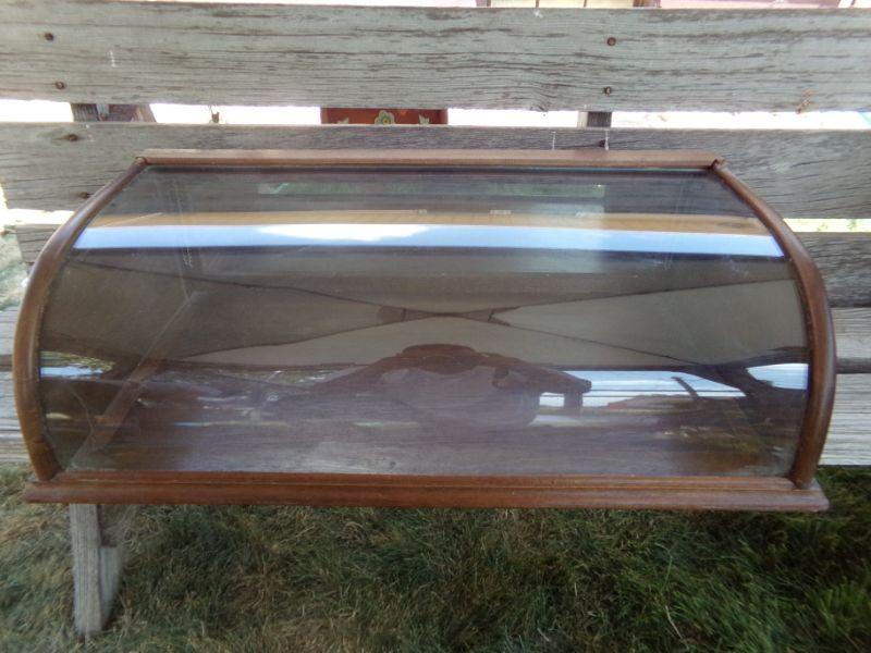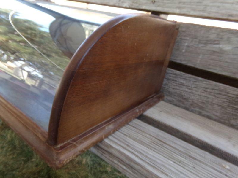 CURVED GLASS LOCKING DISPLAY CABINET, OPENS FROM THE BACK WITH A SKELETON KEY. VERY GOOD CONDITION