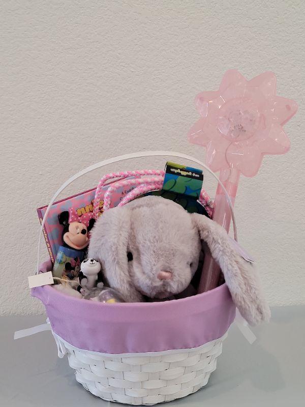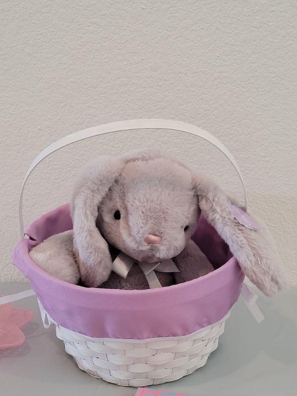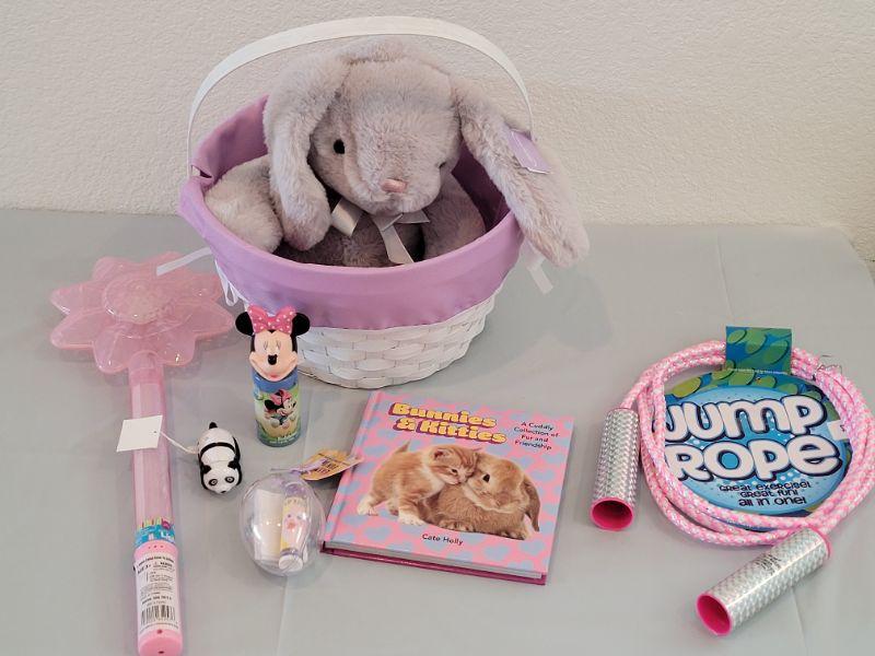 Lot 233: New Easter Basket & Bunny, Jump Rope, Book, Bubbles, Wand, Lip Balm and Wind Up Toy