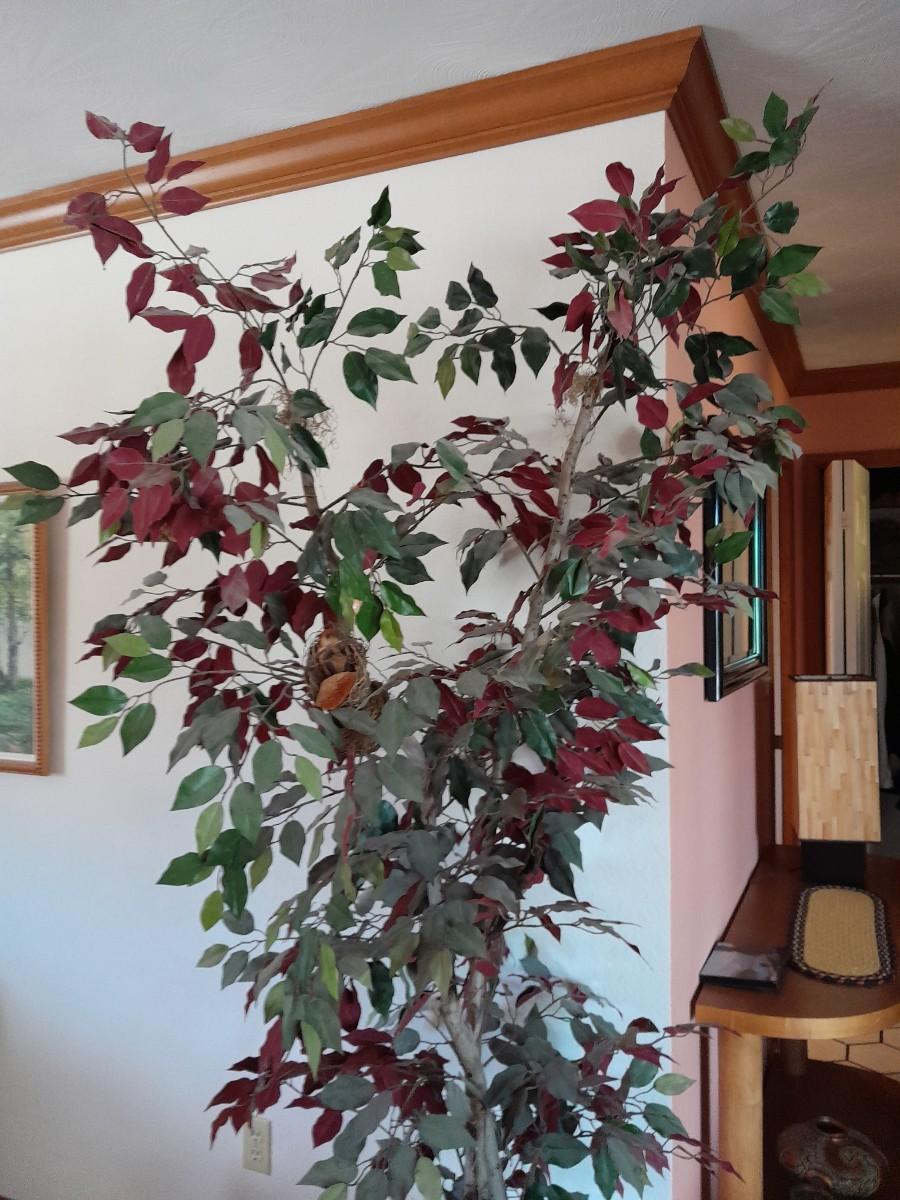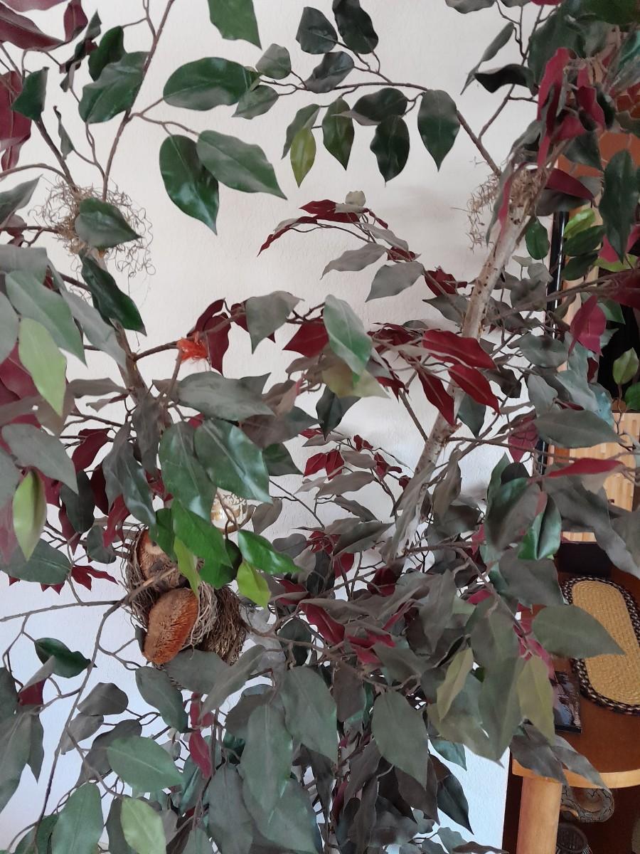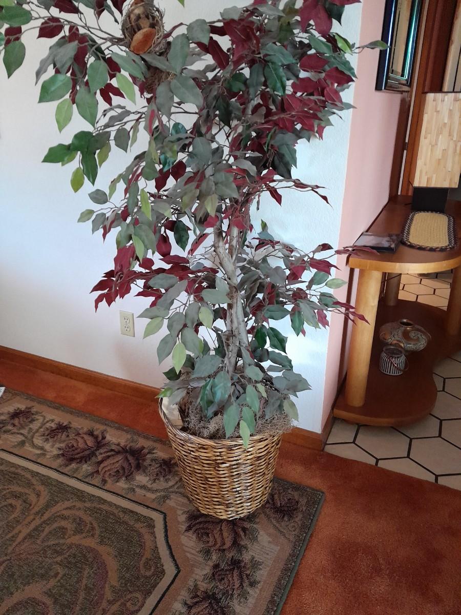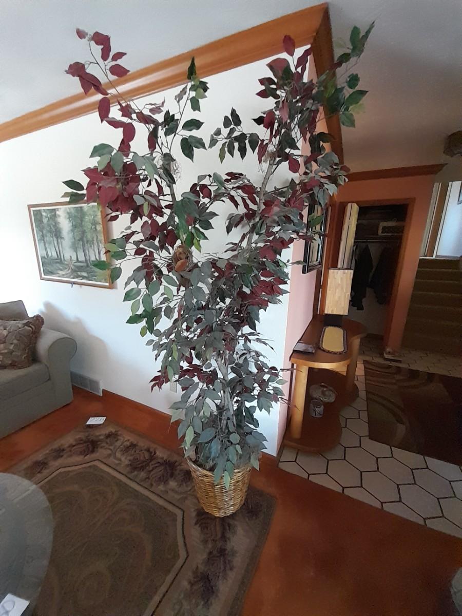 80" GREEN AND RED LEAFED FAUX TREE WITH CRITTERS HANGING INSIDE.