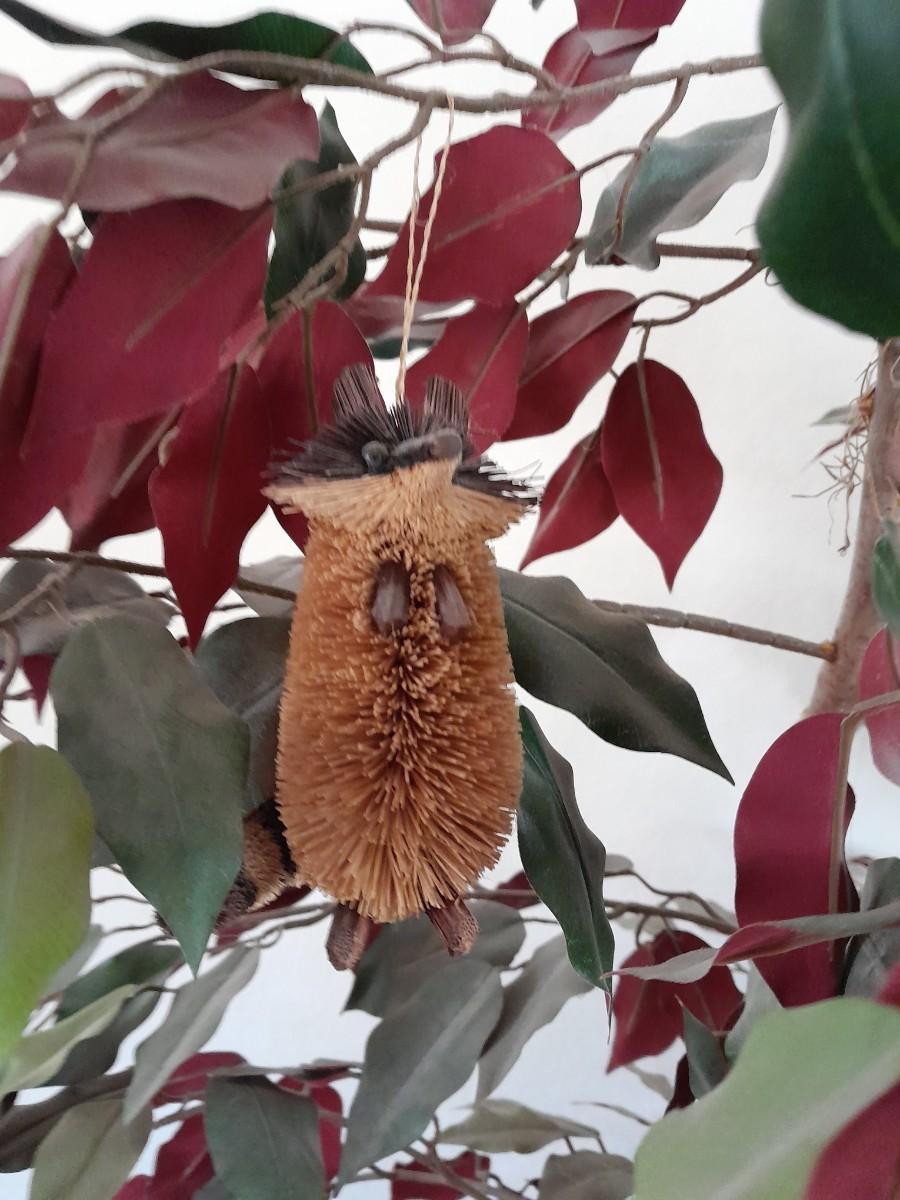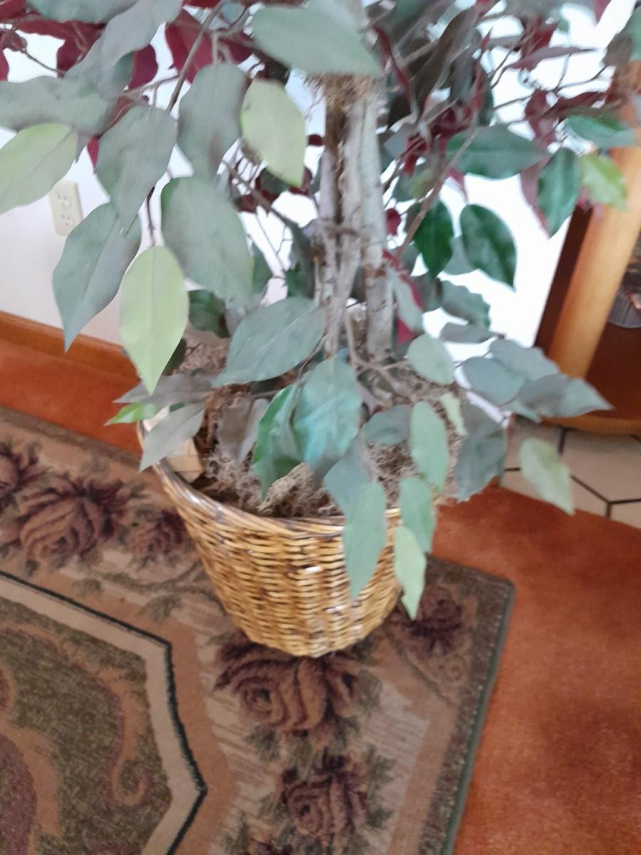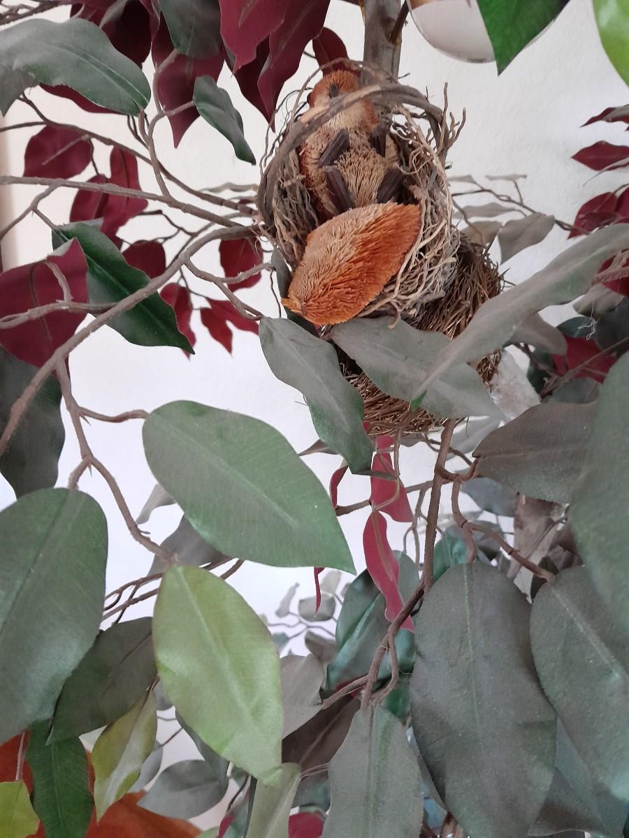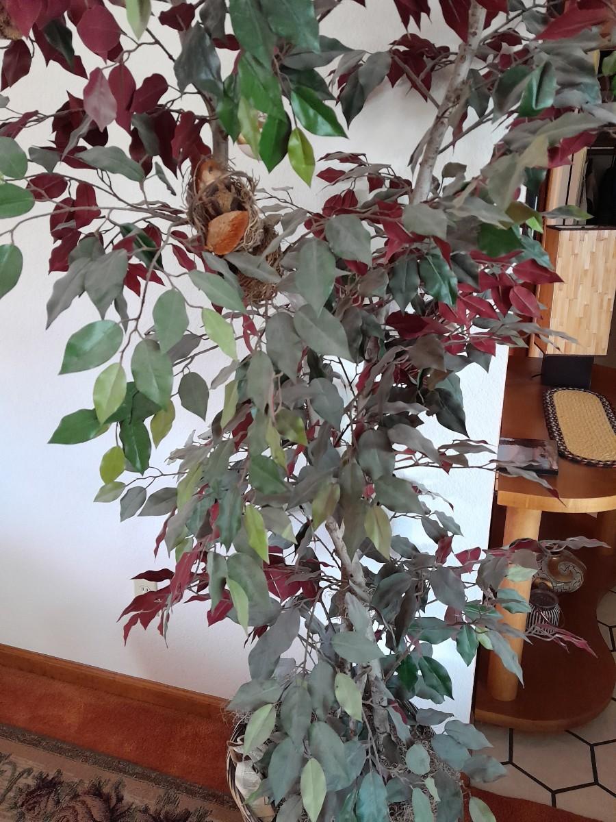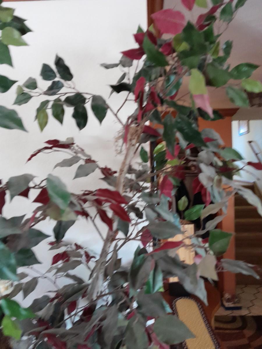 80" GREEN AND RED LEAFED FAUX TREE WITH CRITTERS HANGING INSIDE.