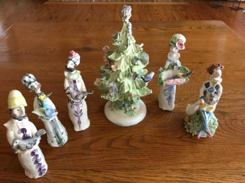 Six ceramic hand painted figurines holding birds and a tree with birds all over. The tree measures 8-1/2” tall