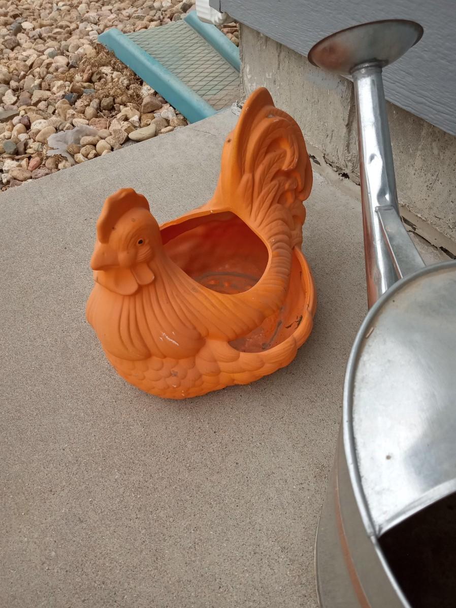 LOT 233  CERAMIC ROOSTER FLOWER POT AND A METAL WATERING CAN