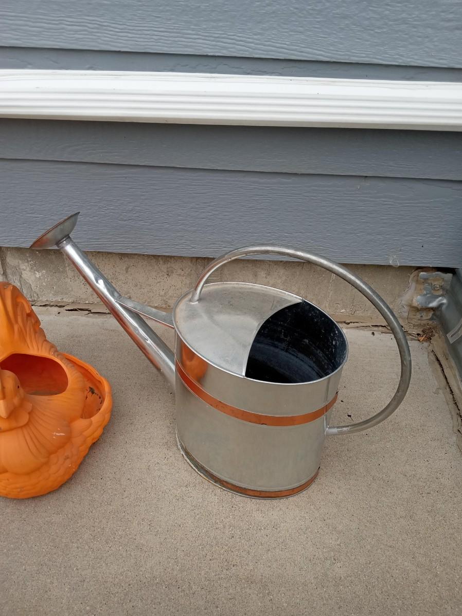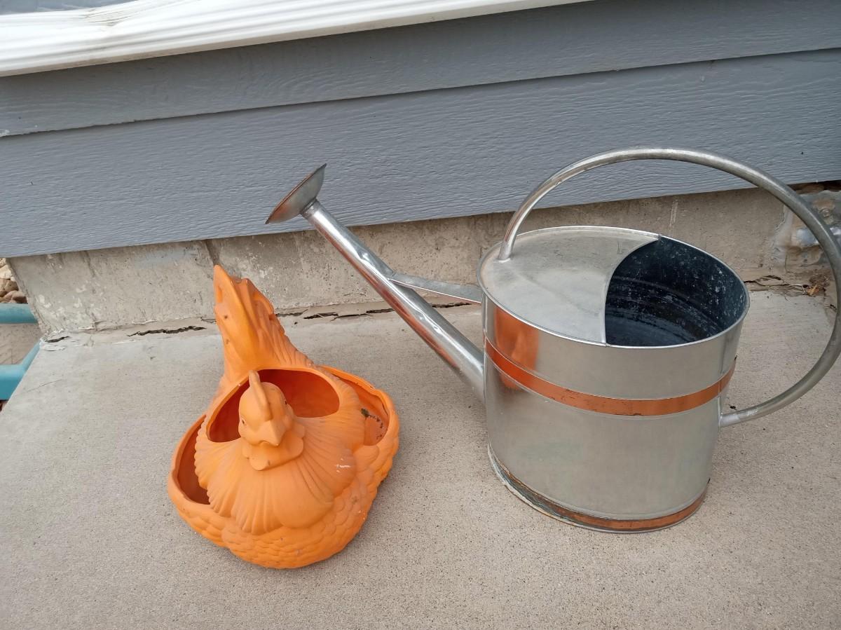 LOT 233 CERAMIC ROOSTER FLOWER POT AND A METAL WATERING CAN