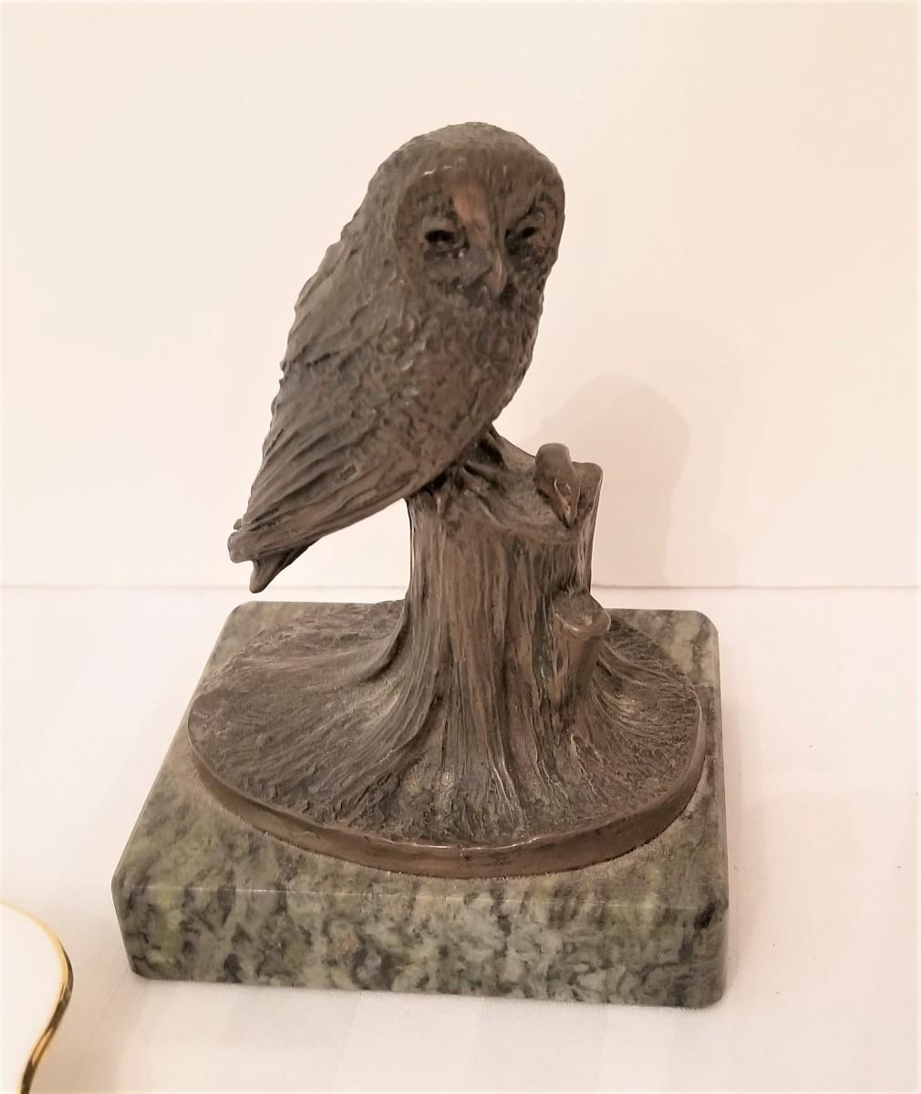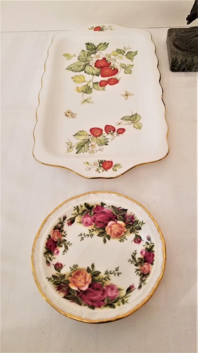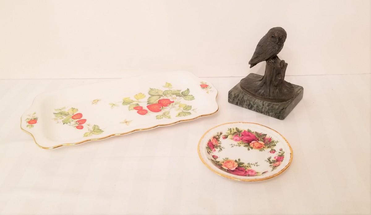 3 piece decorative lot - single vintage owl bookend (5" tall), Royal Albert "Old Country Roses" trinket dish (4.75" across), Queen's Ware "Virginia Strawberries" dish (11.5" long). All in good condition.