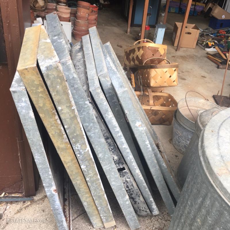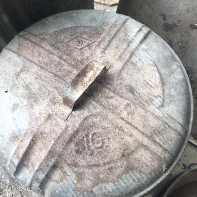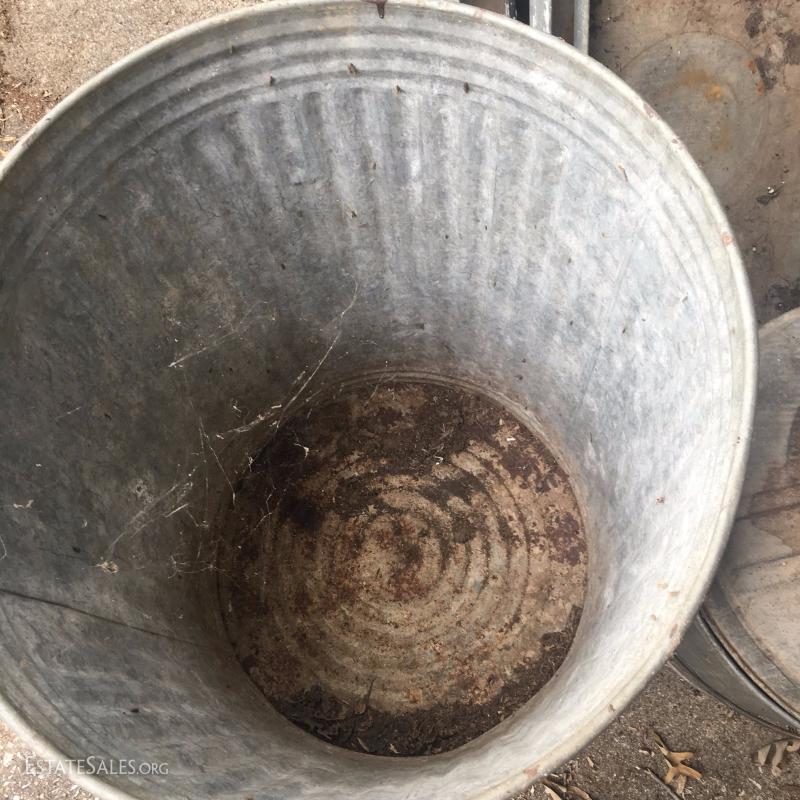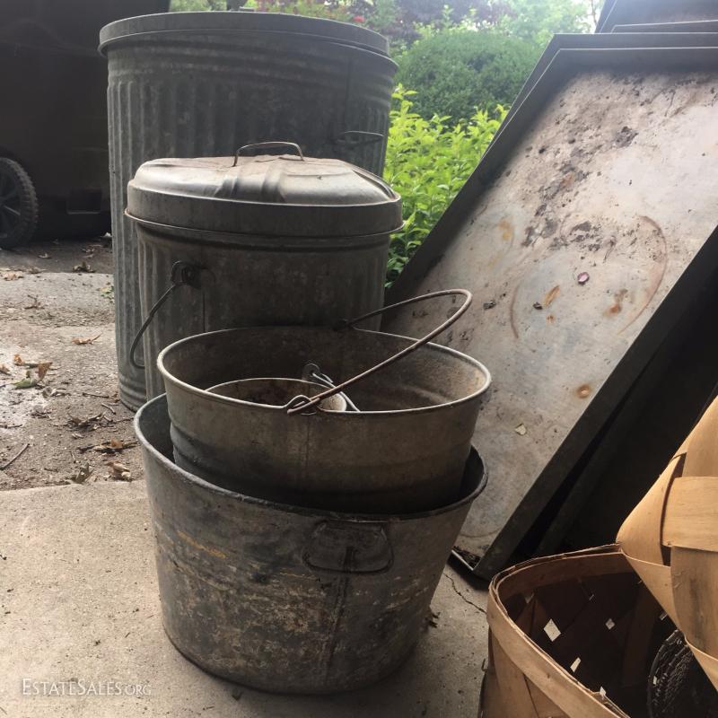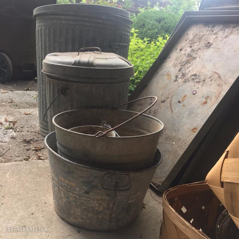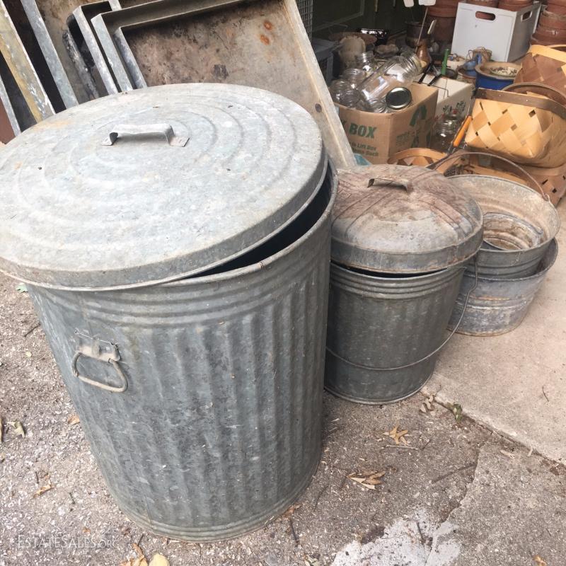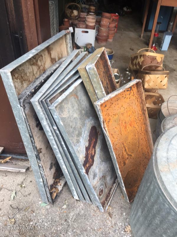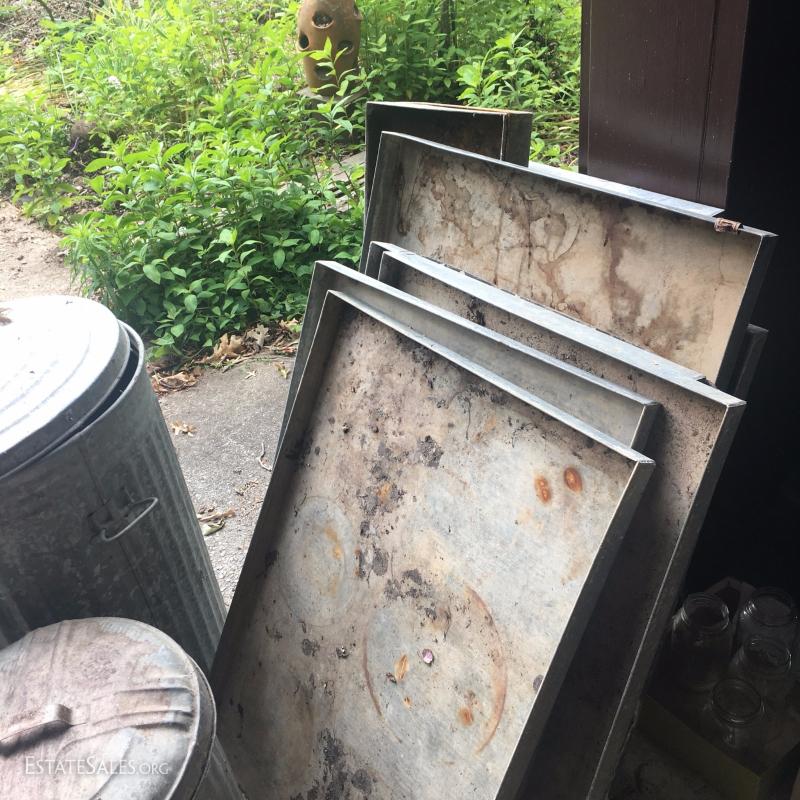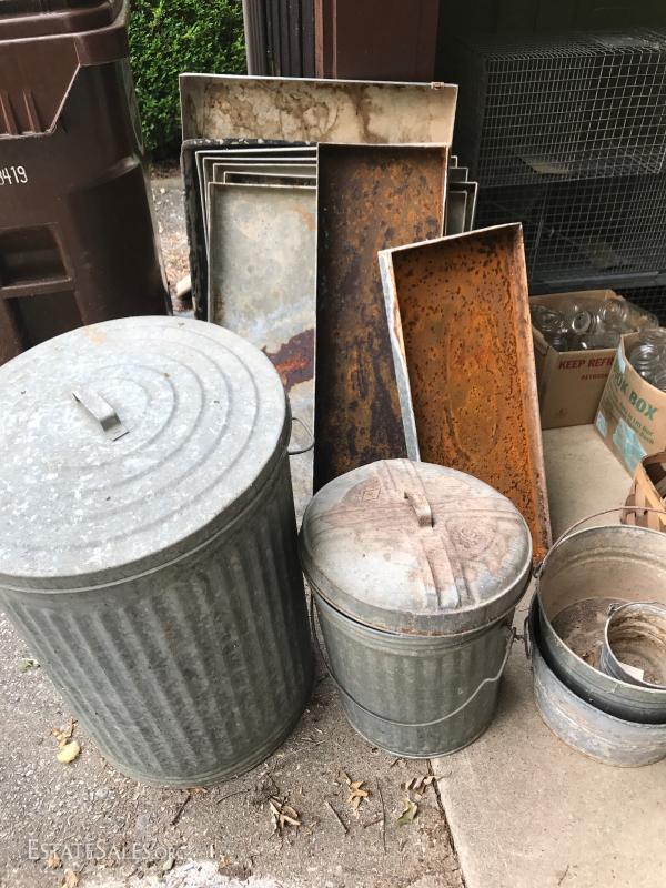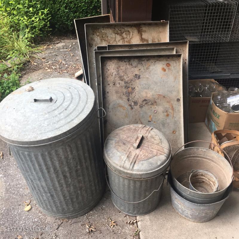 Two galvanized trash cans with lids. Three buckets. 8 tin trays various sizes. Great for gardening.