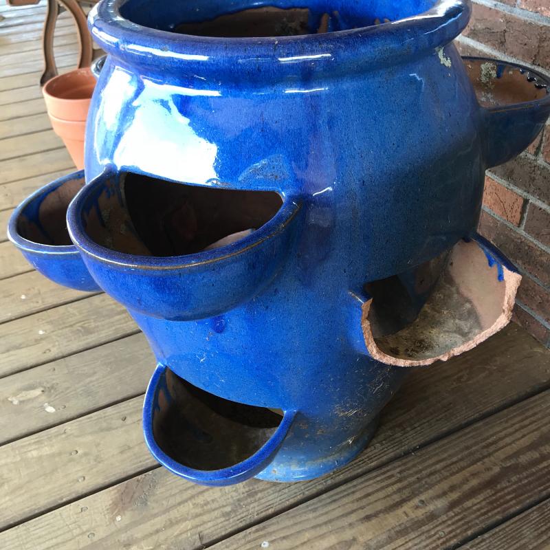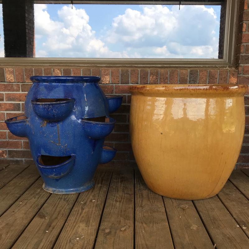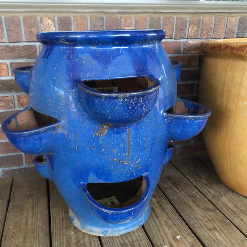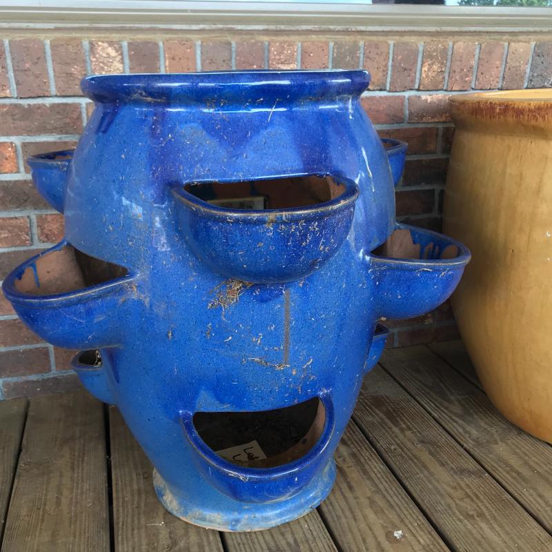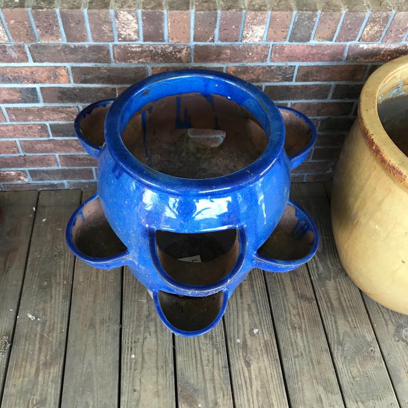 Two grand pots for your gardening needs! One giant yellow pot with amber hues measuring 24”d x 22.5”h. It appears to have some cracks that probably occurred in the firing process. The cornflower blue pot stands two feet tall with eight herb or flower pockets surrounding the pot. There is also one extra pocket that has been broken off, some other pockets appear to be fragile, see photos. No shipping.