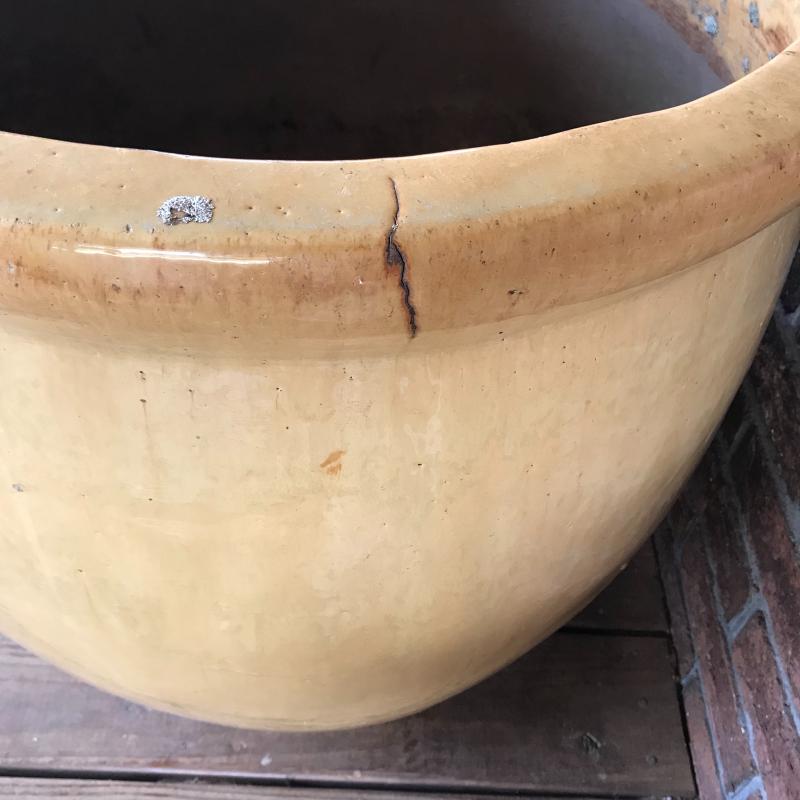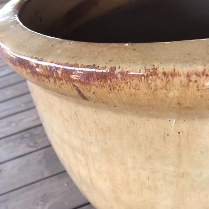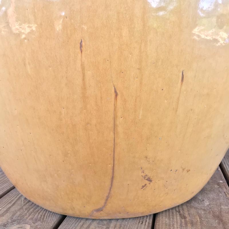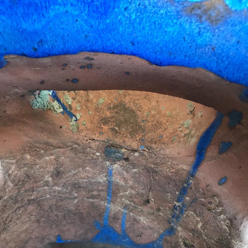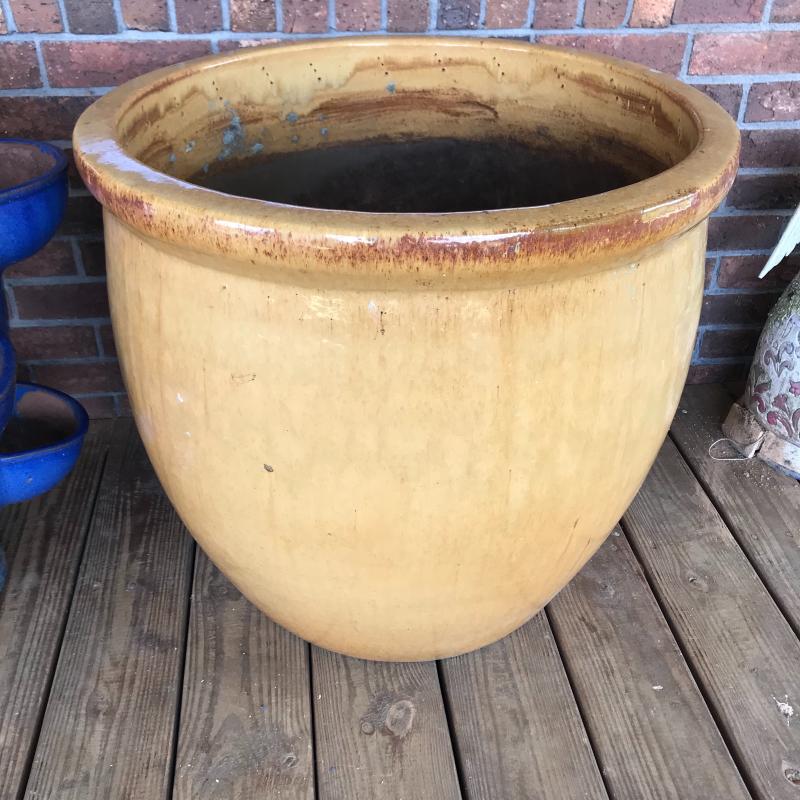 Two grand pots for your gardening needs! One giant yellow pot with amber hues measuring 24”d x 22.5”h. It appears to have some cracks that probably occurred in the firing process. The cornflower blue pot stands two feet tall with eight herb or flower pockets surrounding the pot. There is also one extra pocket that has been broken off, some other pockets appear to be fragile, see photos. No shipping.