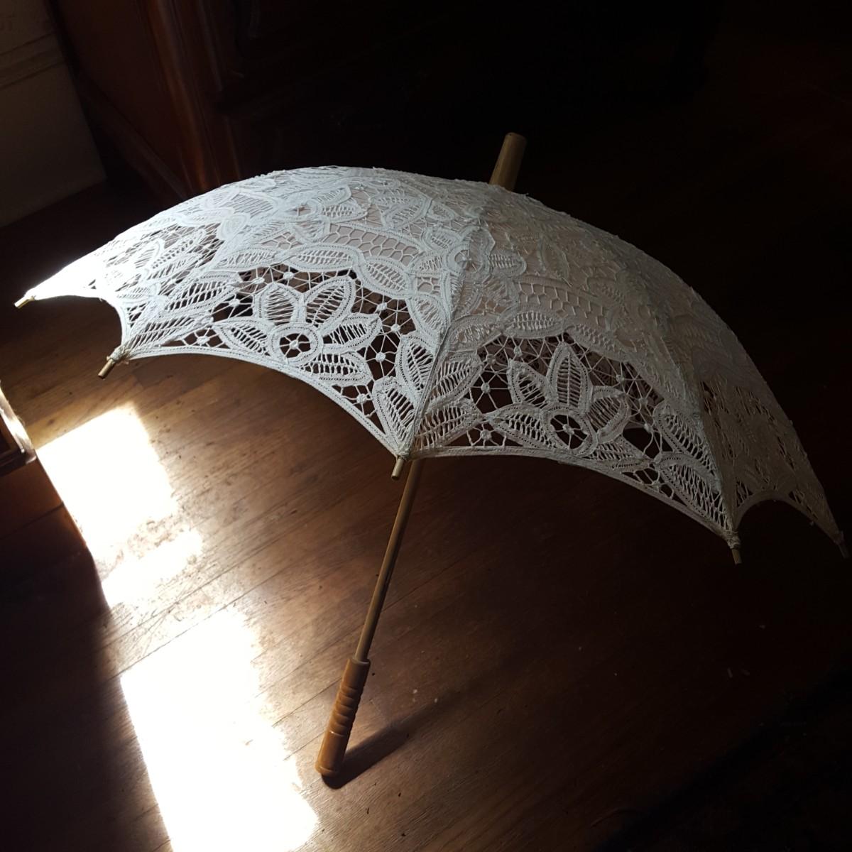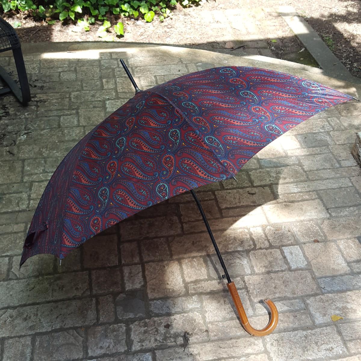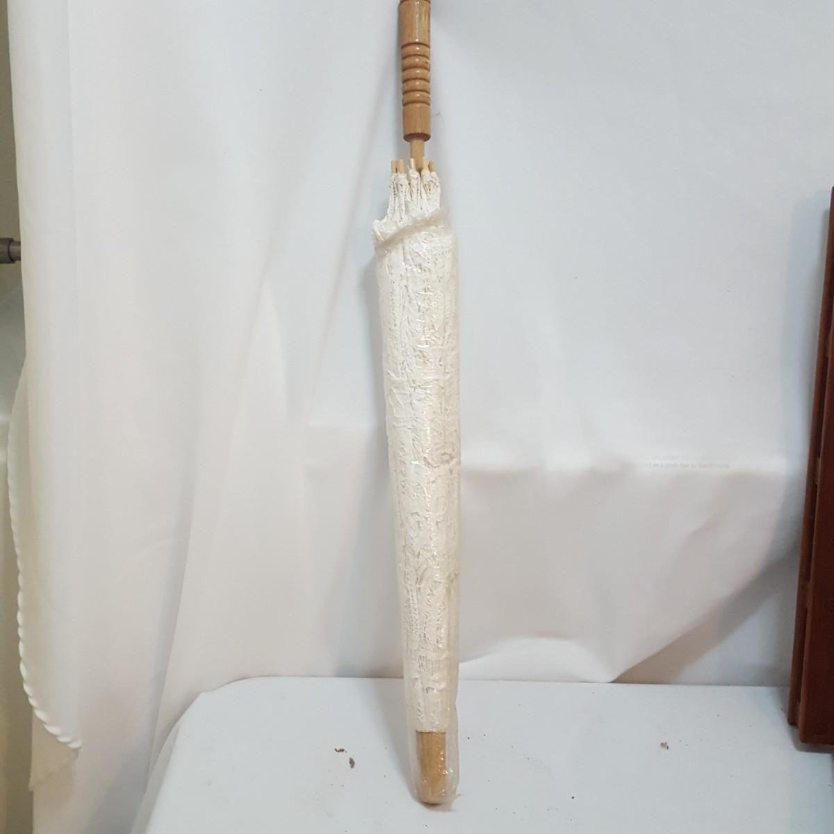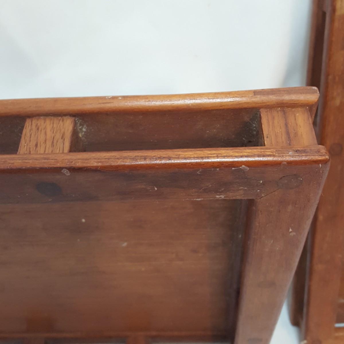 This lot contains Seven pieces that will help you organize in fashion! The magazine rack in a Mission Arts & Crafts style and appears to be very sturdy and well made. It measures 11” x 18” x 14”. The two identical lap trays (18” x 14” x 2”) would be perfect for breakfast in bed. The one tray is a little worn on the top as seen in the pictures. The wooden umbrella stand measures 17” x 7.5” and has 2 metal lion pulls on each side perfect next to your front door. This lot also includes two umbrellas and what might be a walking stick that is missing the top, but still functional. The London Fog umbrella has a slight bend in the pole, but still opens and closes. The lace umbrella appears to be in great shape and would look glamorous while sunning or walking down the street! Local pick up only.