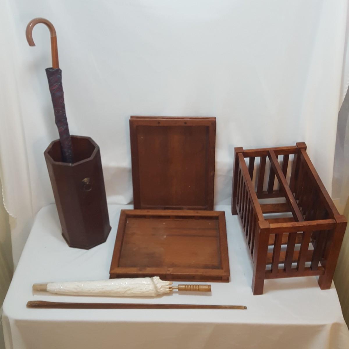 Lot 233- Magazine Rack, Trays and Umbrella Stand