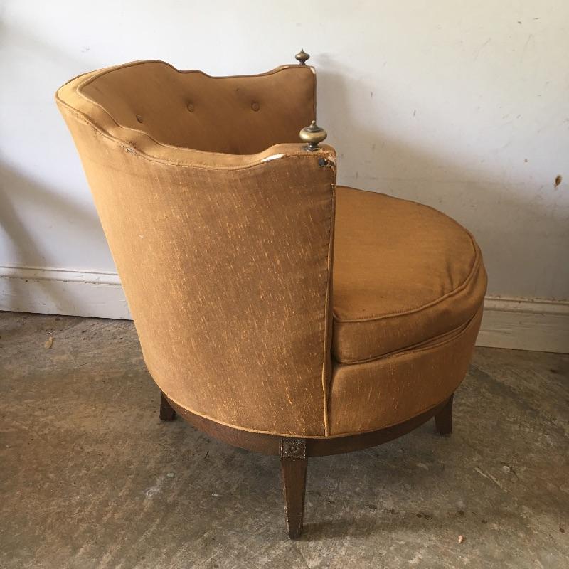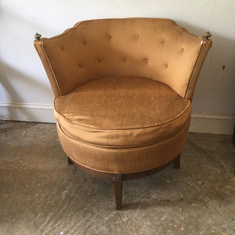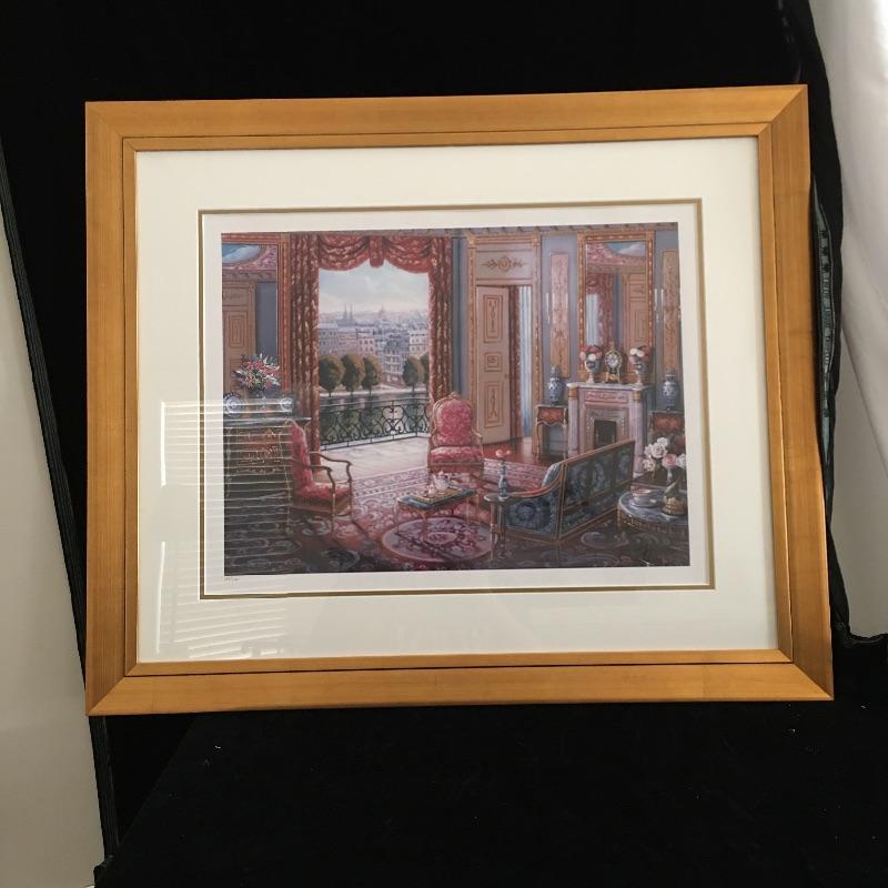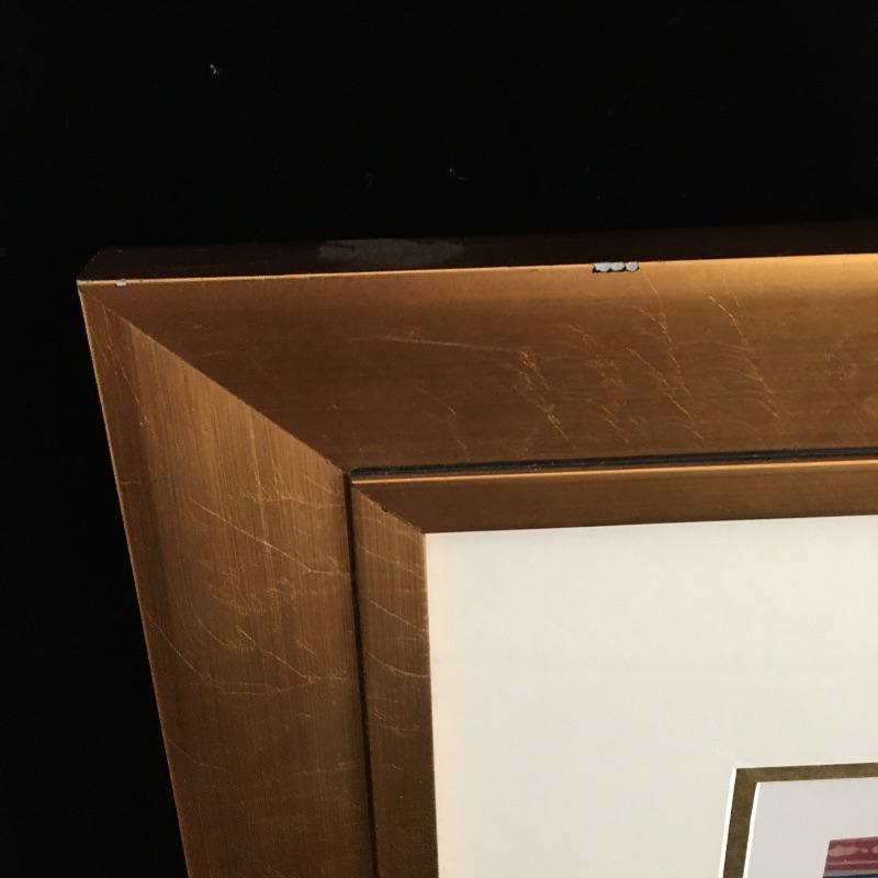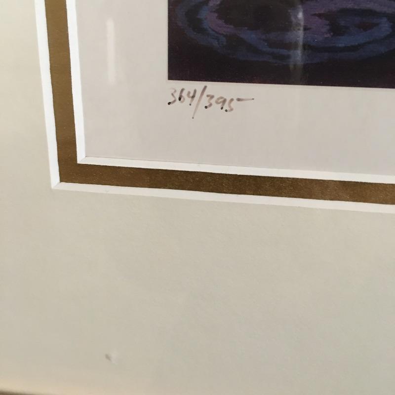 MCM swivel chair and framed and matted artwork lot. MCM swivel chair is an excellent chair that could use some refurbishment or go for the shabby chic look and leave it as it is, has two unusual knobs on the chair back. Chair measures 29” x 29” x27” with a seat height of 16.5”. Framed, matted and numbered artwork is so vibrant it seems like you are in the room. Frame has small chip on edge and measures 26” x 31”.