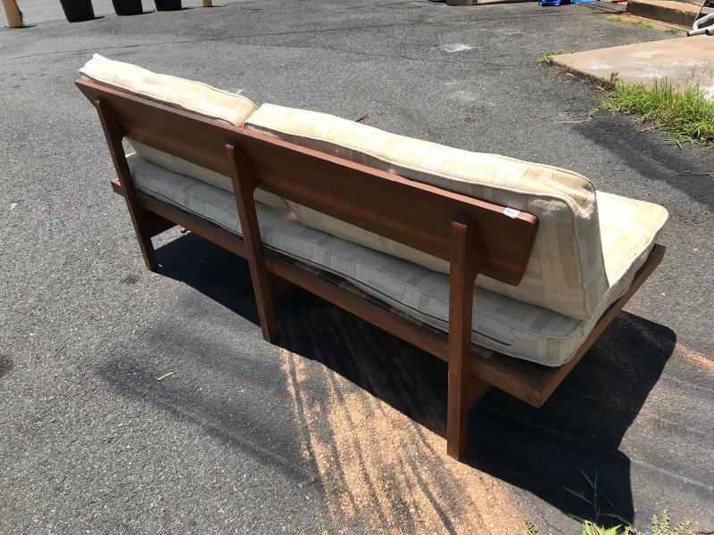 Very nice MCM Danish modern teak daybed. Square legs support clean lined frame of webbing. Back uprights support angeled backrest. Removable original seat and back cusions in a tan woven geometric fabric. Removable cushion coveres are in good condition, but foam has hardened and needs to be replaced. Pair available (Lot 232). 75" x 32" x 31" H