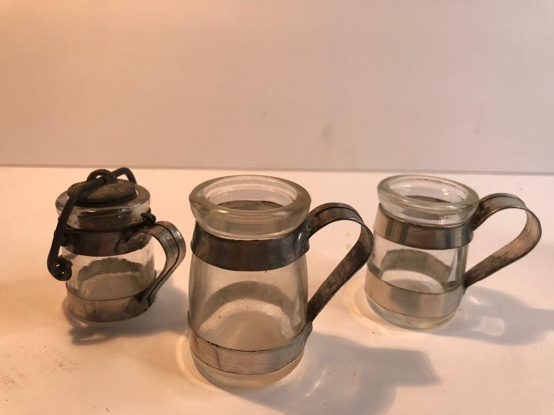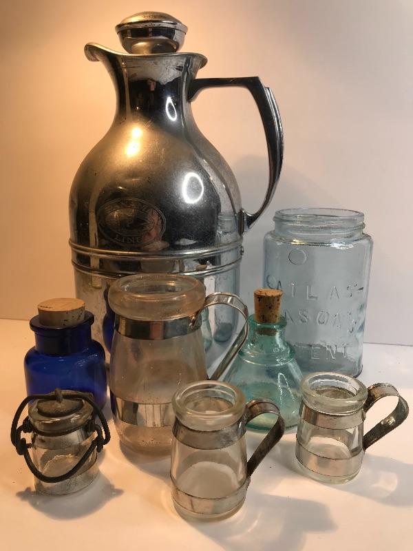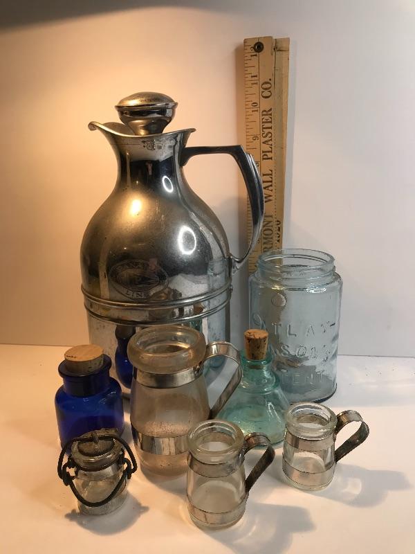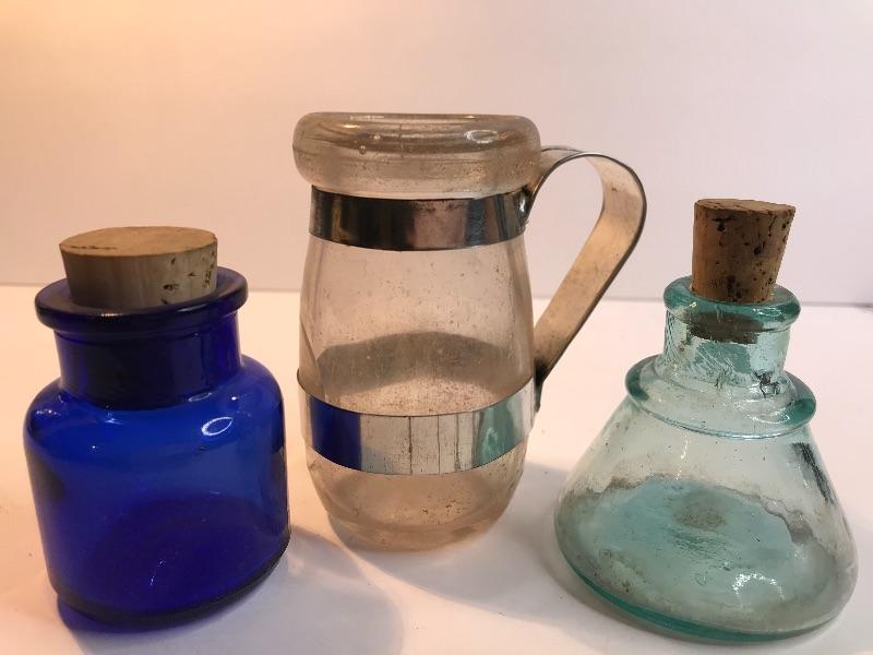 Lot 233: Tin handled Antique Small Bottles and Pitcher