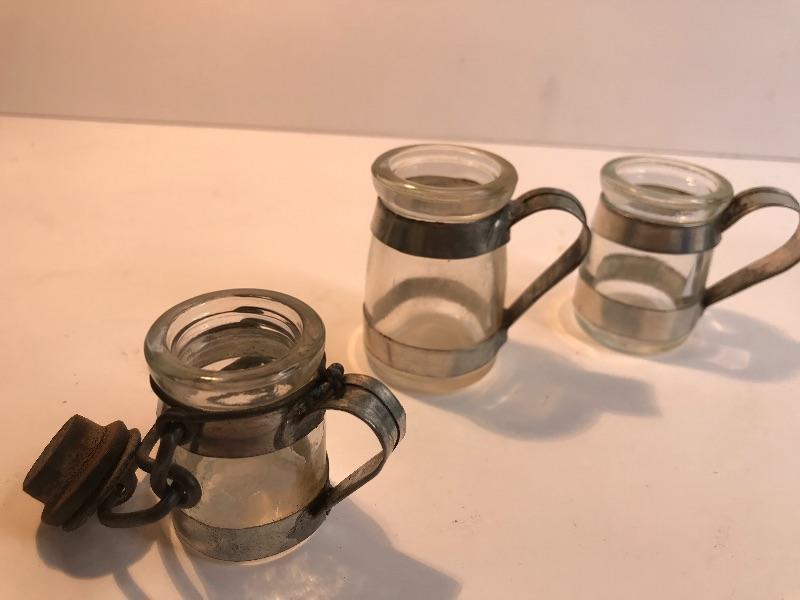 Mini bottles with metal rings and handles, inkwell bottle, mason and more. Please see all pictures for content of the lot, condition of the lot, and measurements if taken. Pictures are the best representation of the items listed and items are untested unless indicated in description. Thank you for looking and have fun bidding!