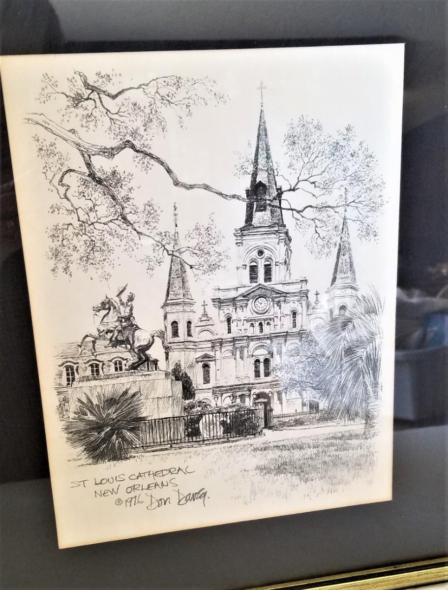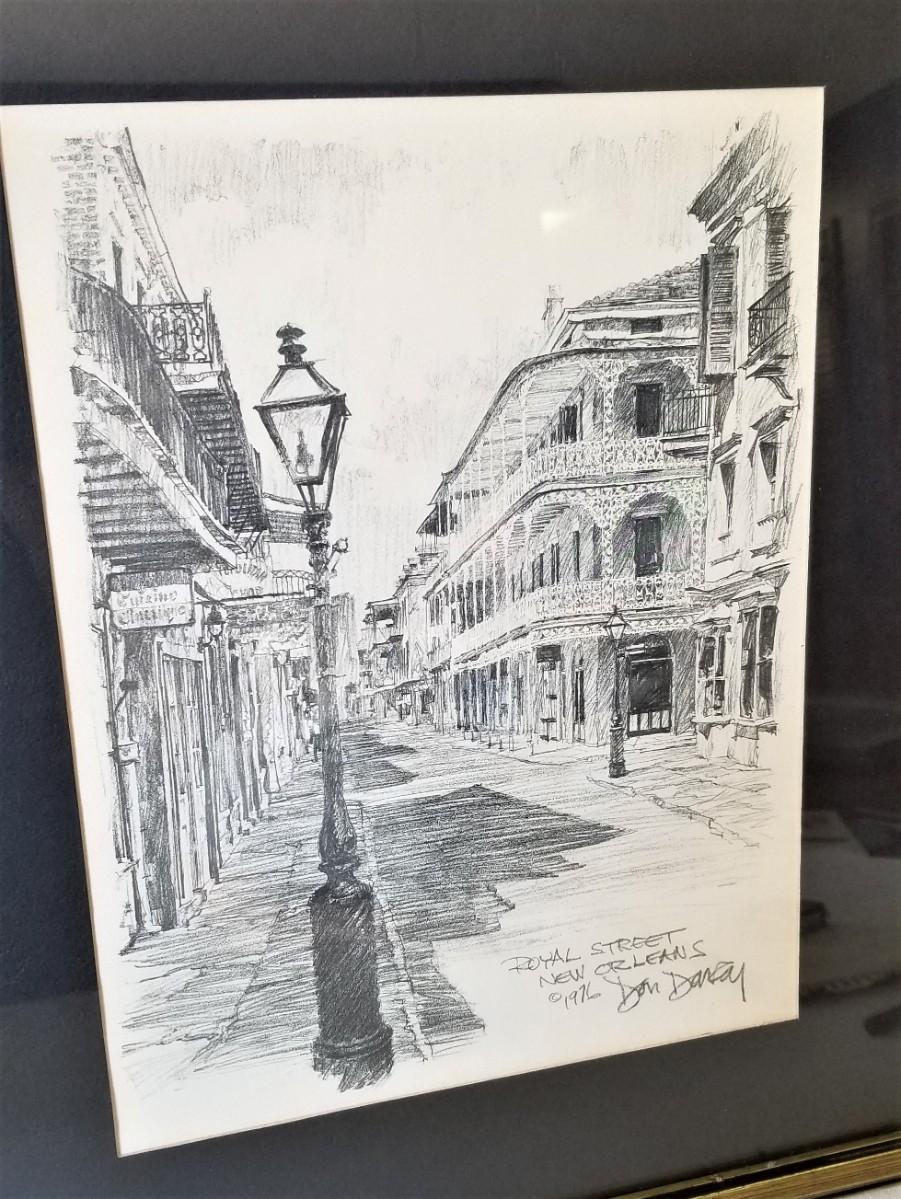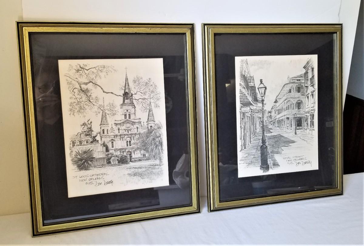 Framed pair of Don Davey (New Orleans artist) prints - Jackson Square (1976) and Royal Street (1976). Each is 15" across and 17.5" tall. Good condition.