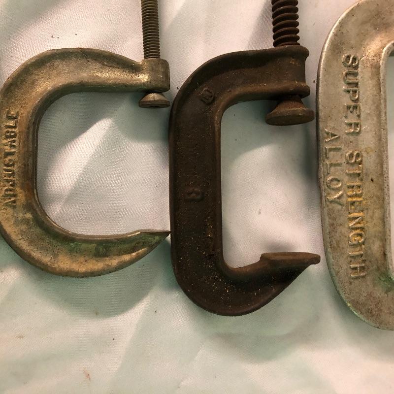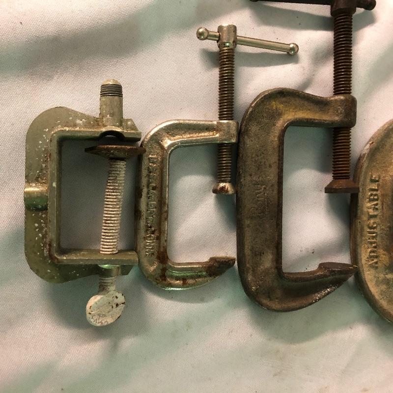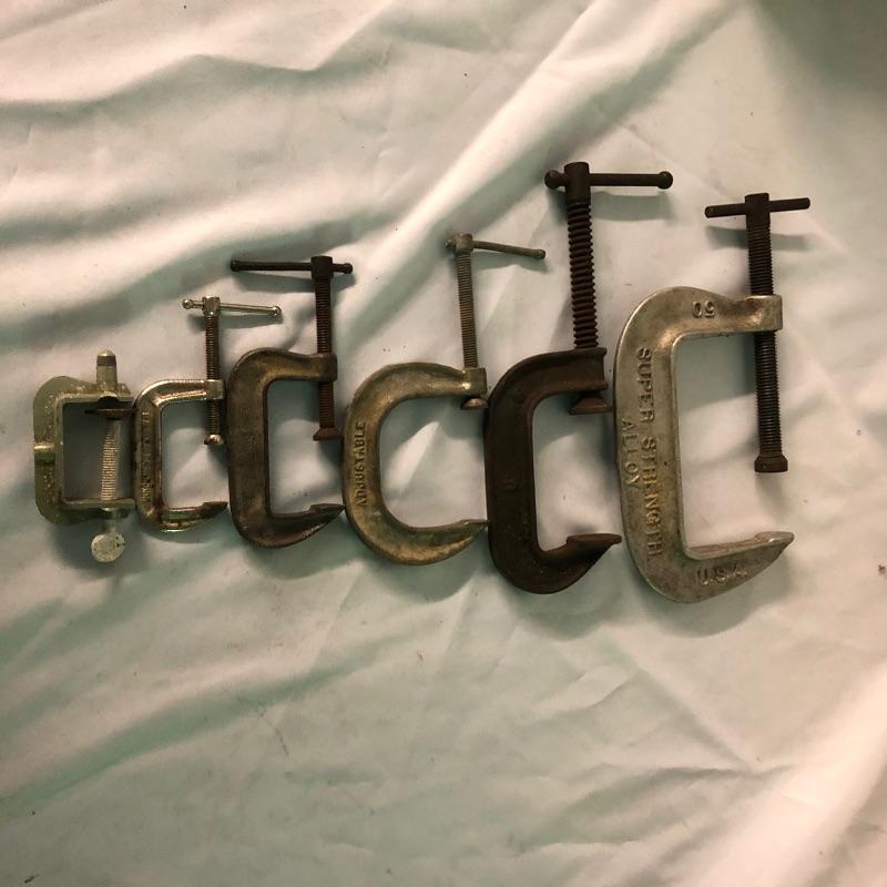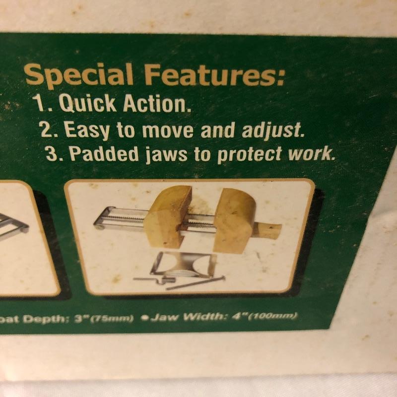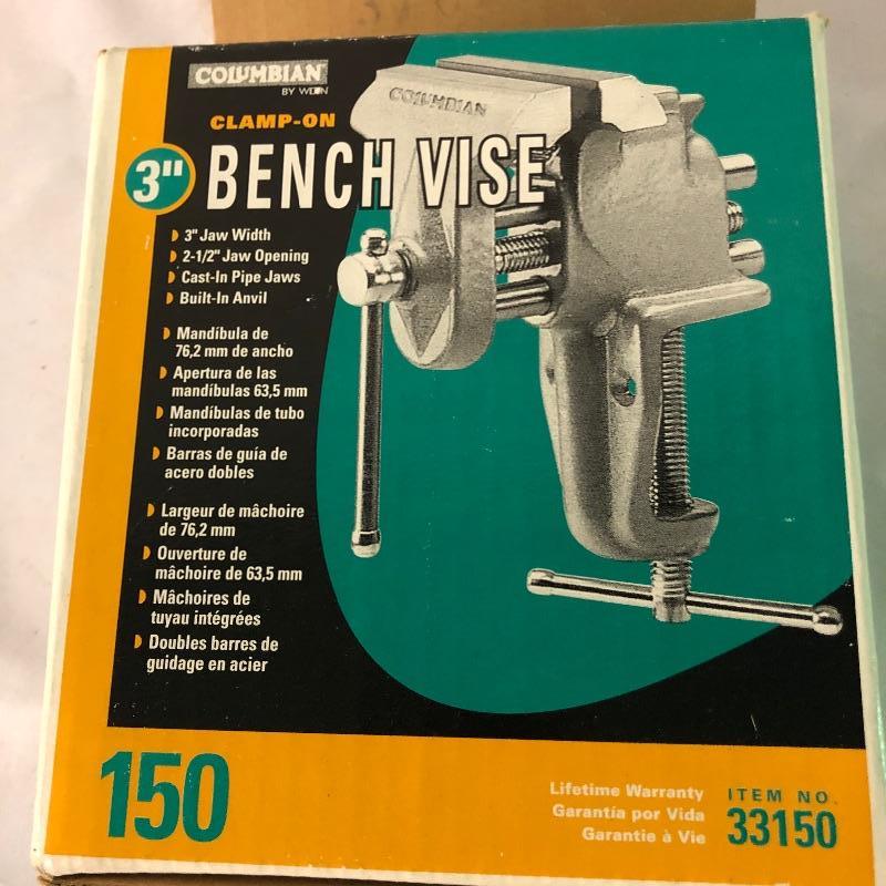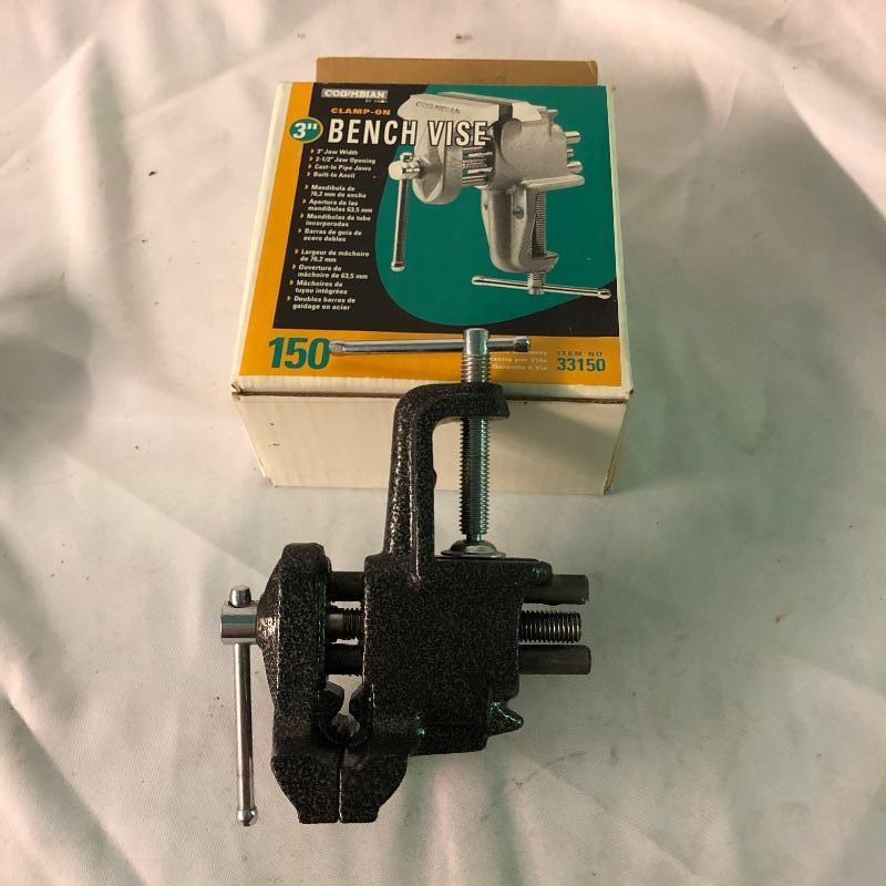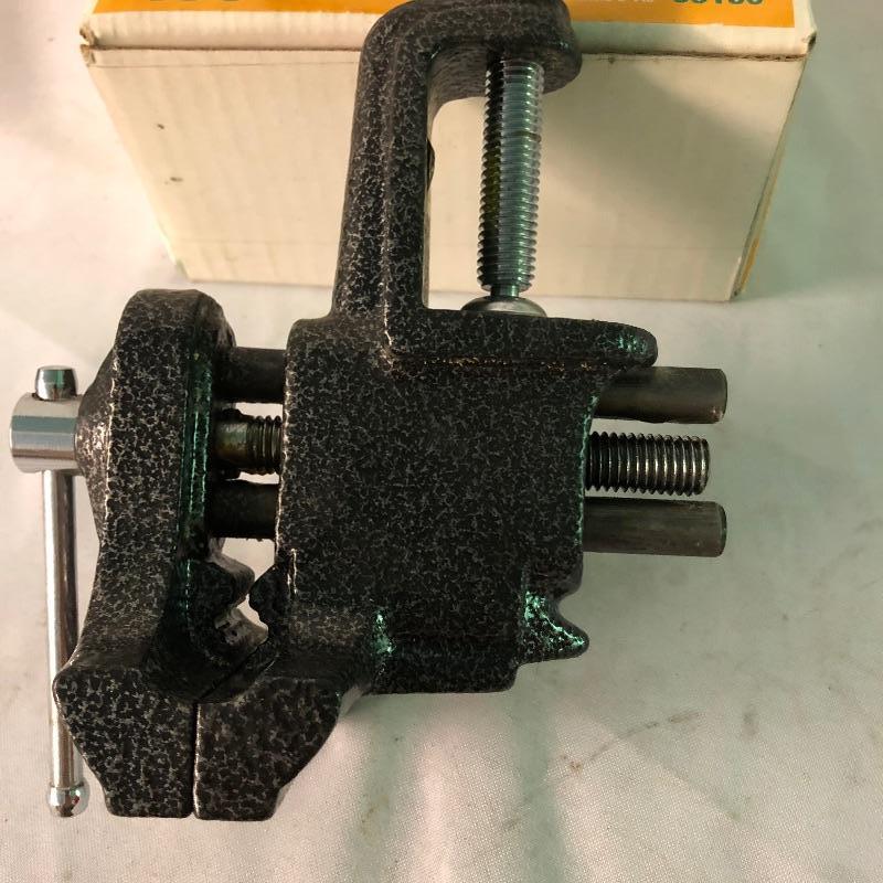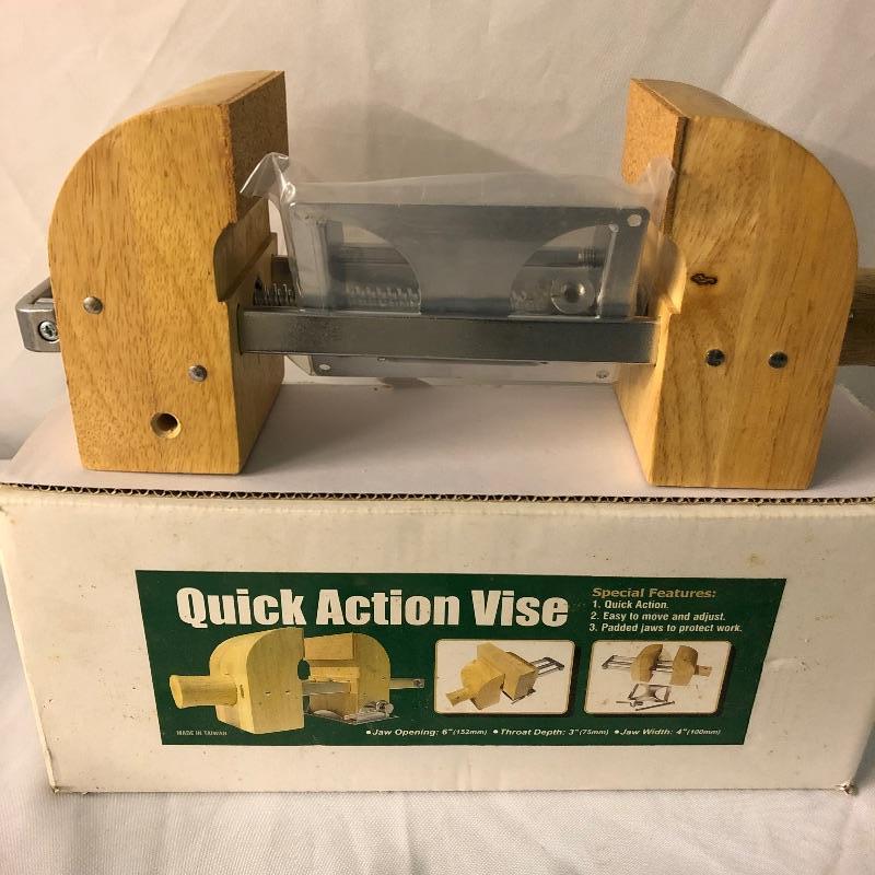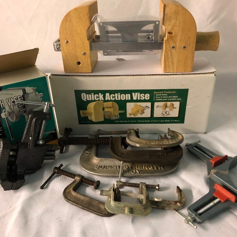 The Quick Action Vise appears to be new. This wooden vise has a 6” jaw opening and is padded to protect your items. We have added a small 3” bench vise, six C Clamps ranging in size, largest is a 5”. We have also included a corner clamp in this great lot.