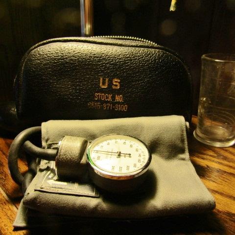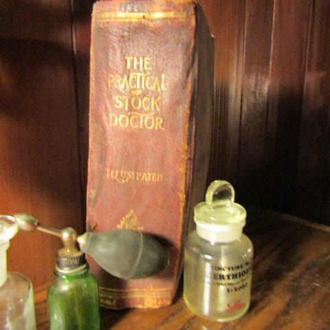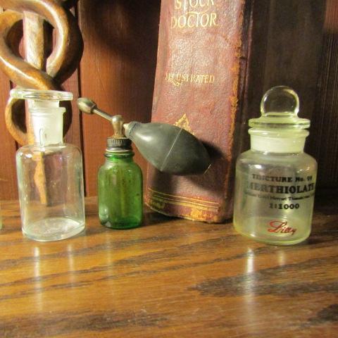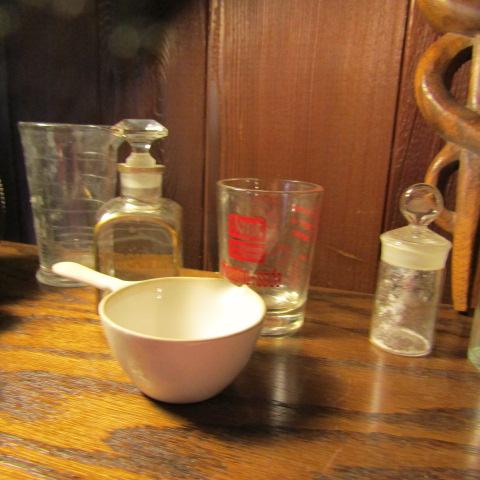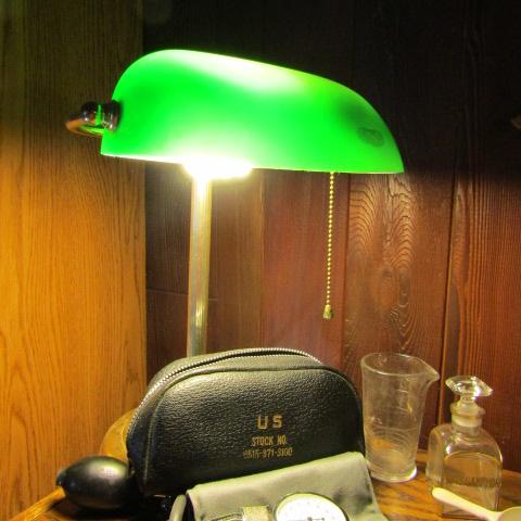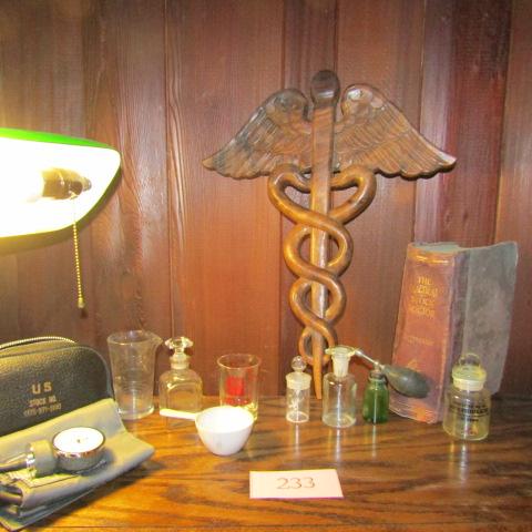 WOODEN PHARMACIST LOGO, GLASS CONTAINERS, BLOOD PRESSURE CUFF, GREEN GLASS SHADE DESK LAMP AND MORE
