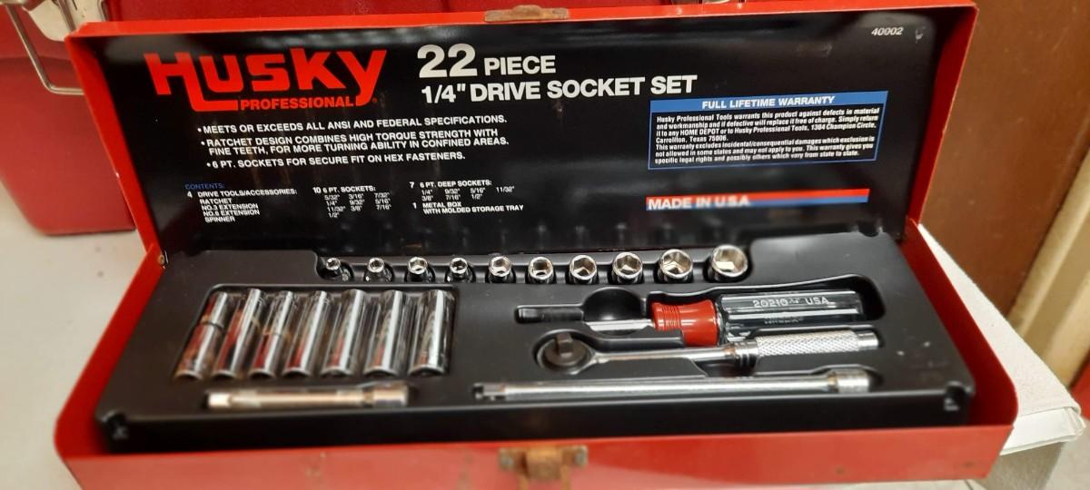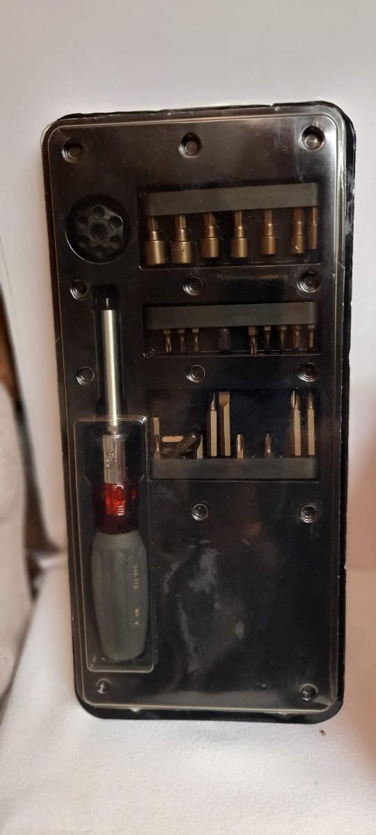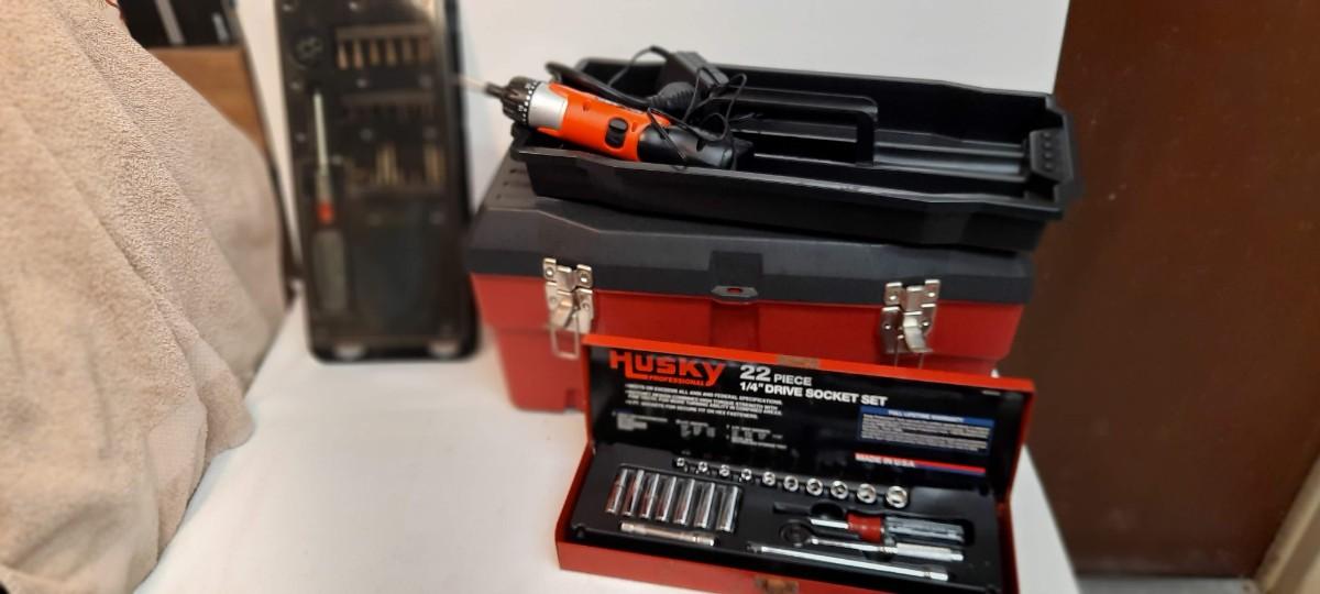 Lot 233 Plastic Tool Box, Screwdriver Set w/ Bit, Electric Screwdriver, and Husky Socket Set